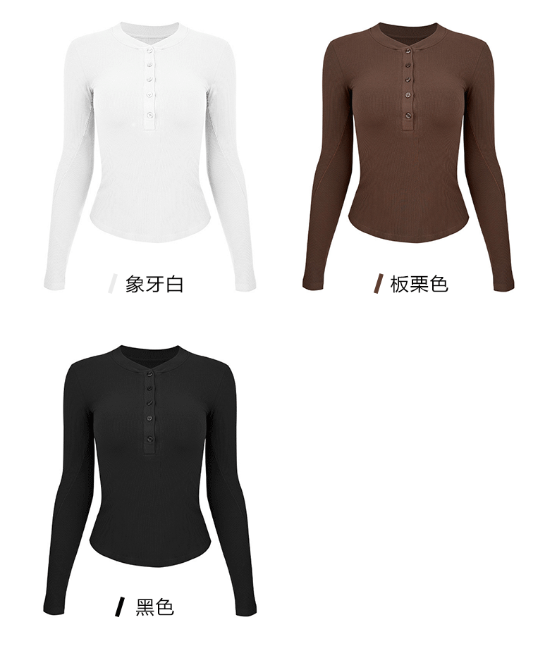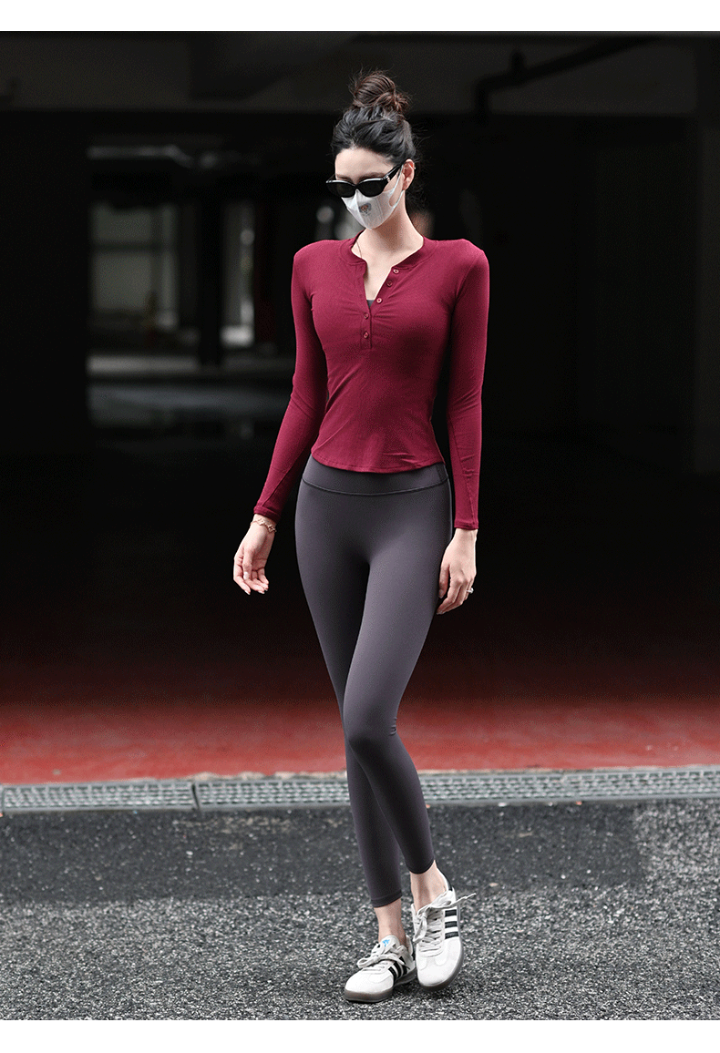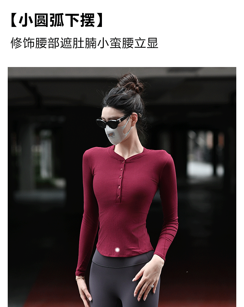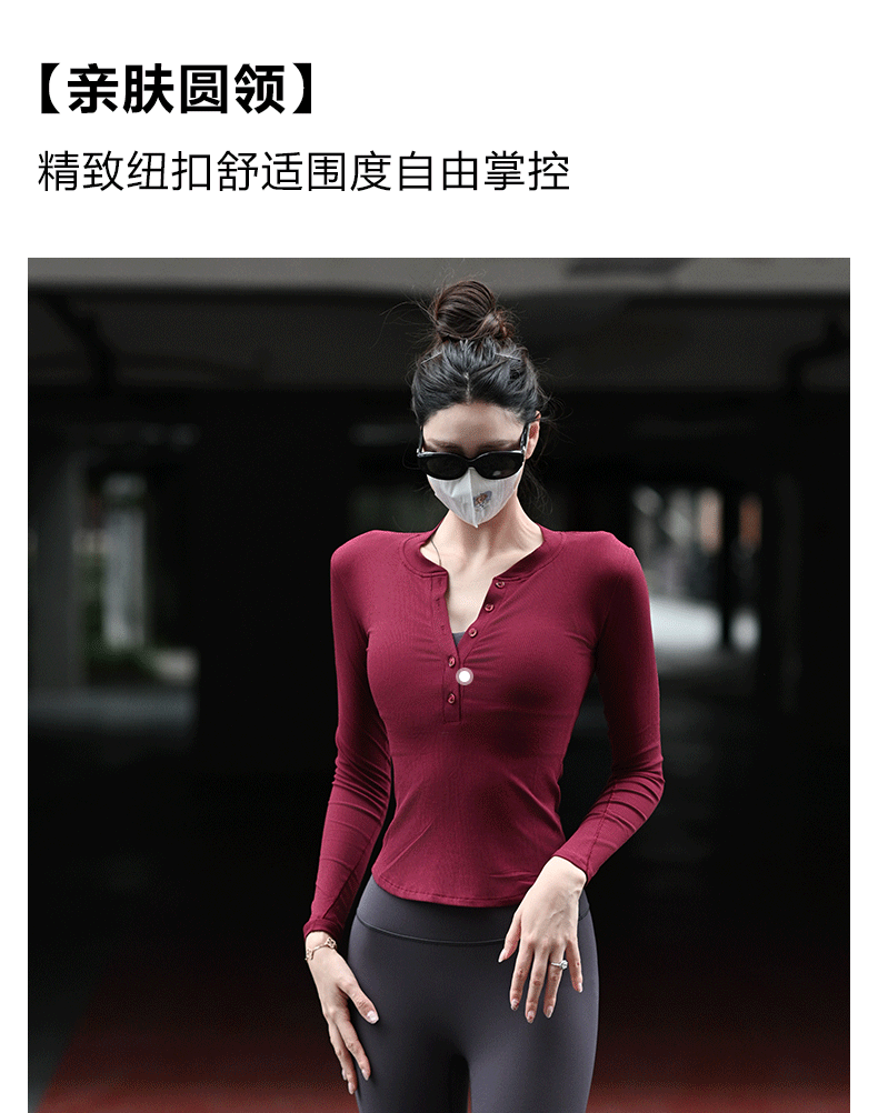 Beemen秋冬新款天丝莫代尔瑜伽服女 圆领纽扣长袖 贴身收腰外穿好看 透气高弹运动上衣