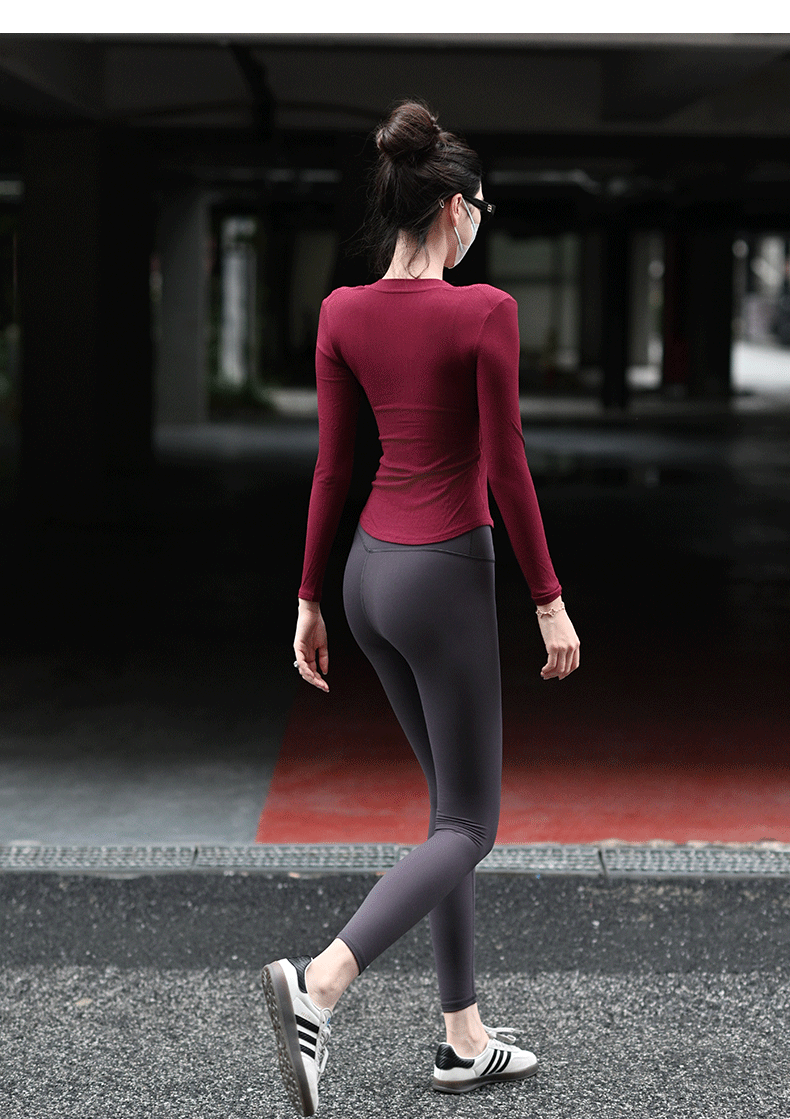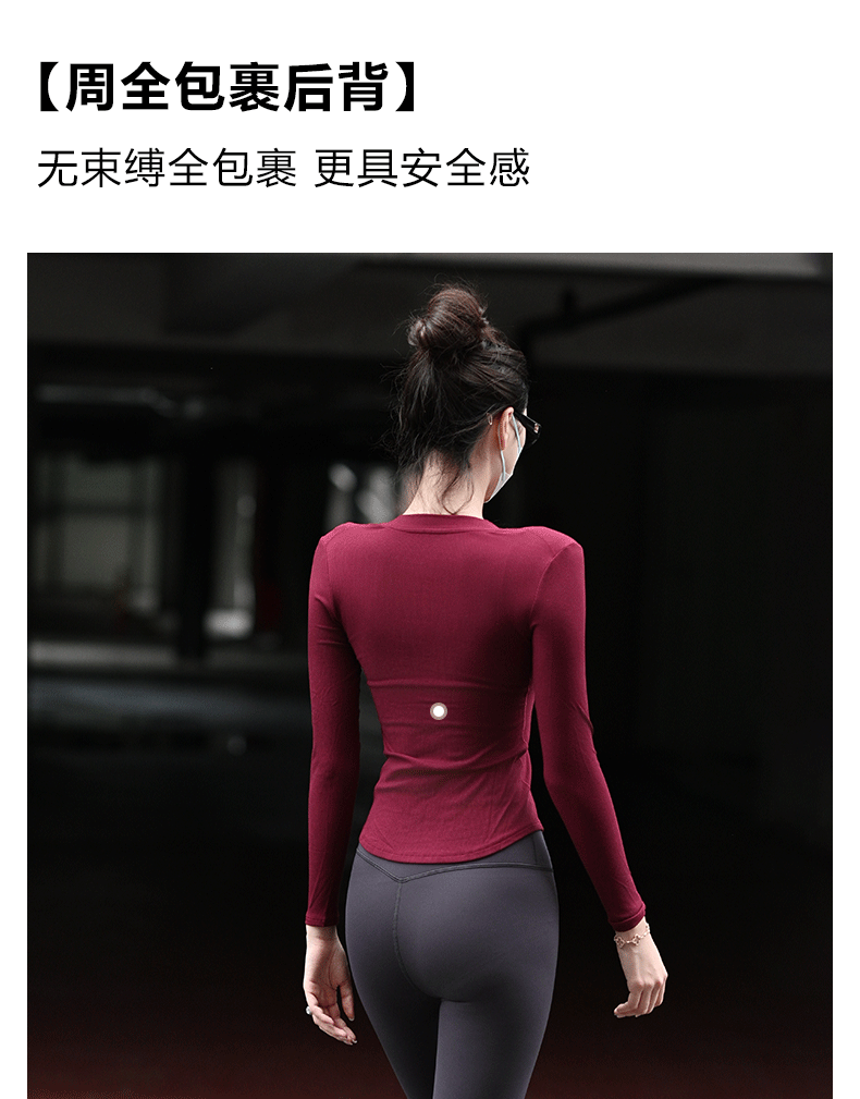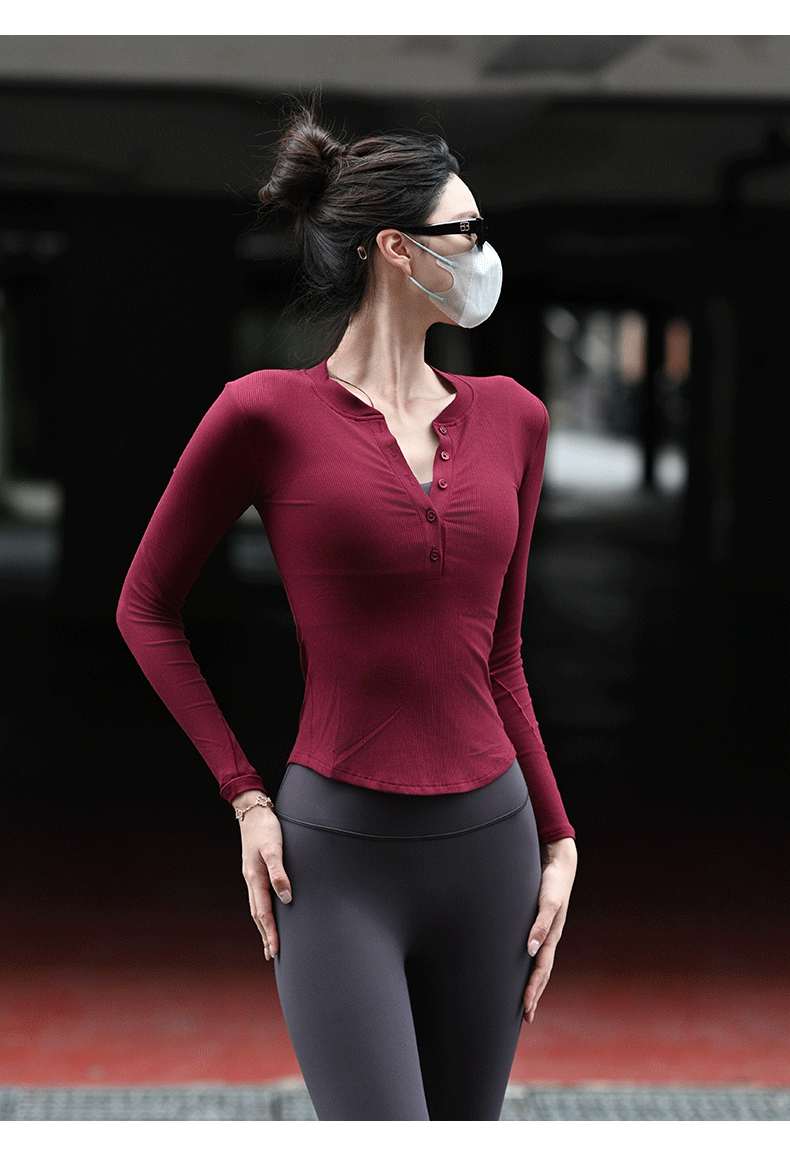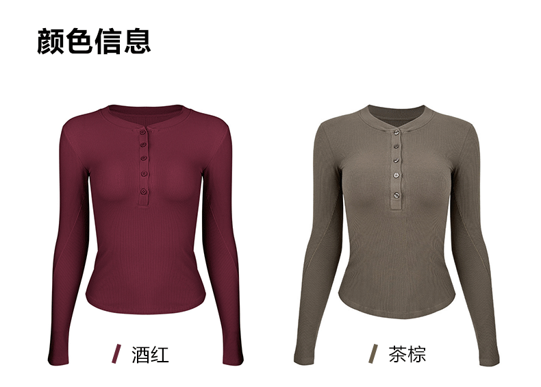 Beemen秋冬新款天丝莫代尔瑜伽服女 圆领纽扣长袖 贴身收腰外穿好看 透气高弹运动上衣