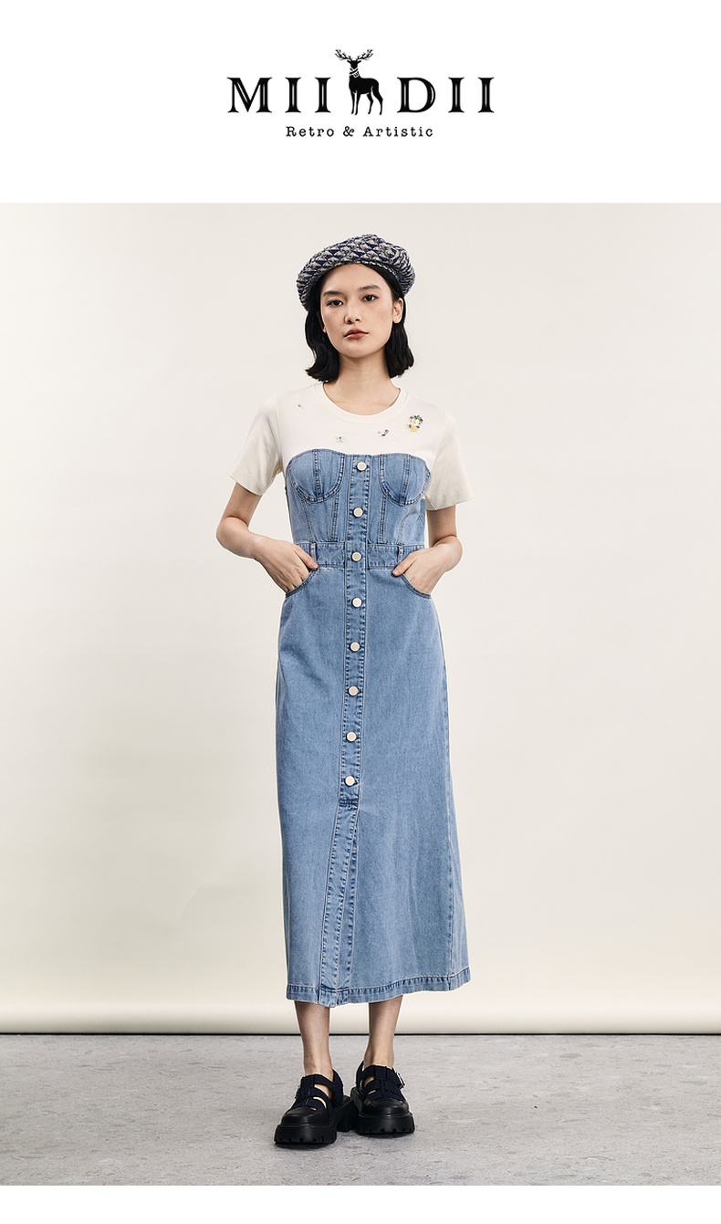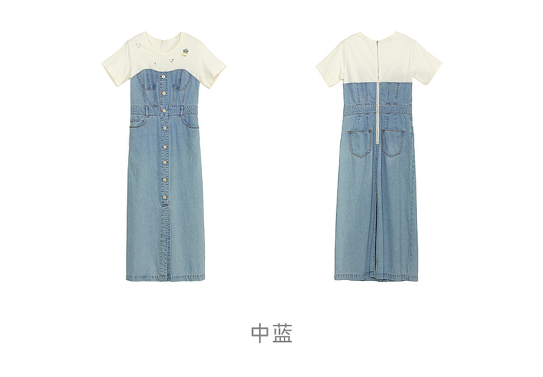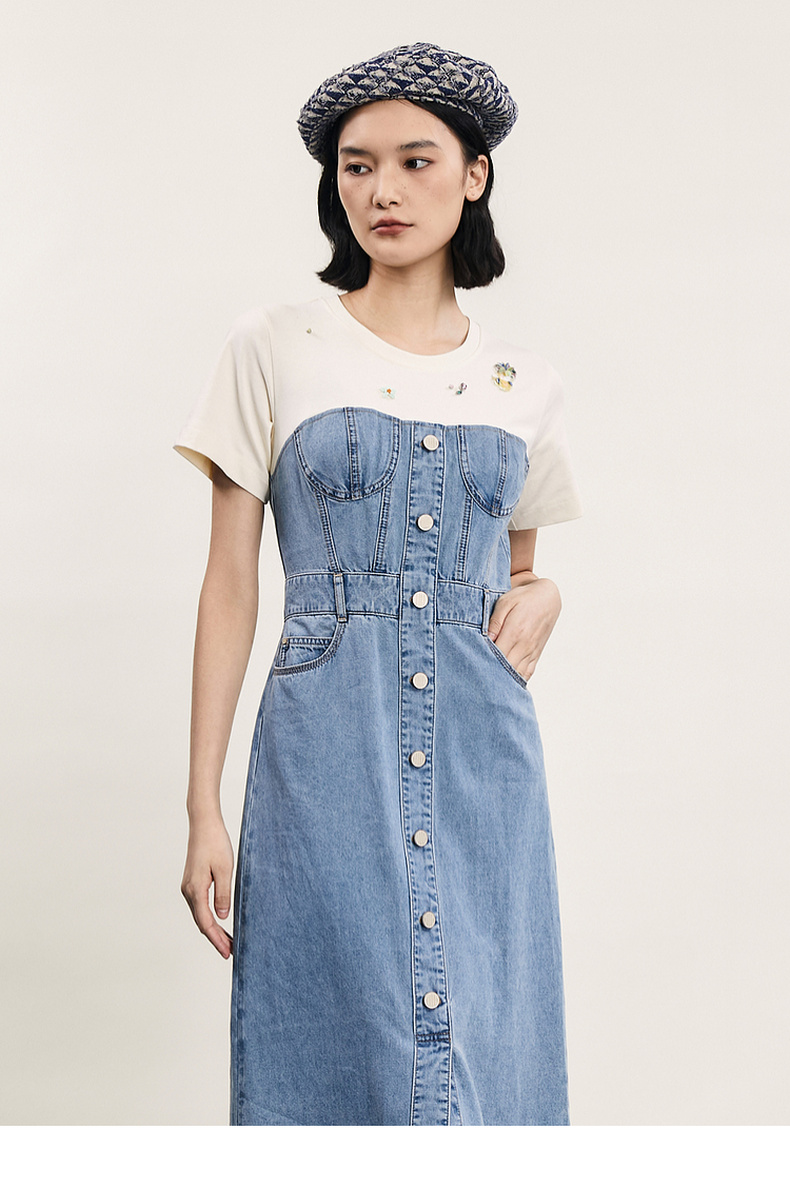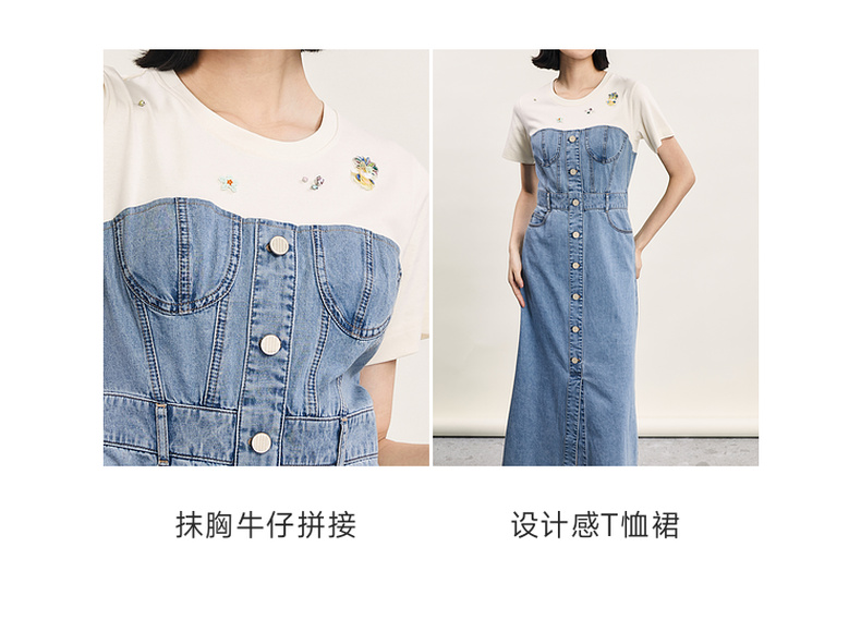 谜底拼接牛仔长裙2024年夏款时尚休闲钉珠绣连衣裙短袖242ML0559