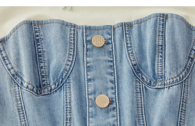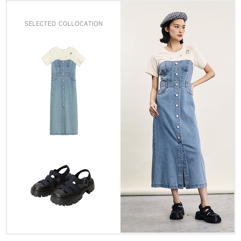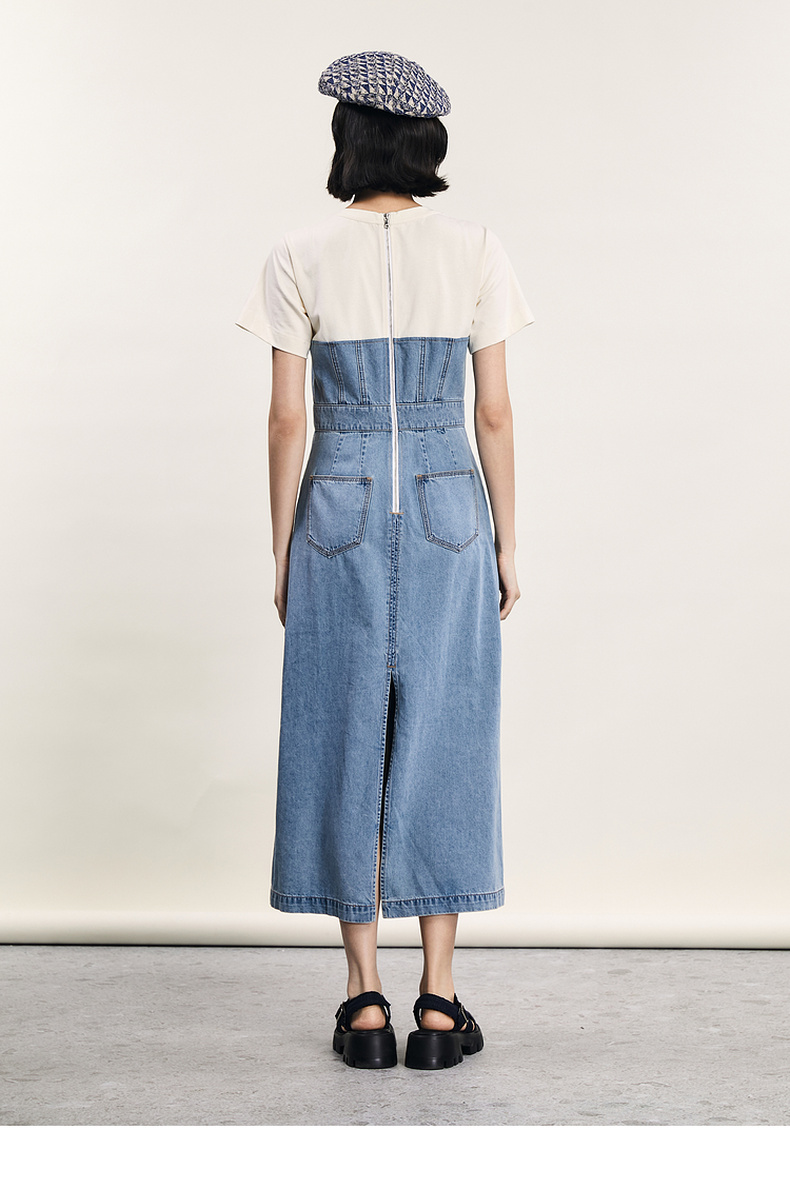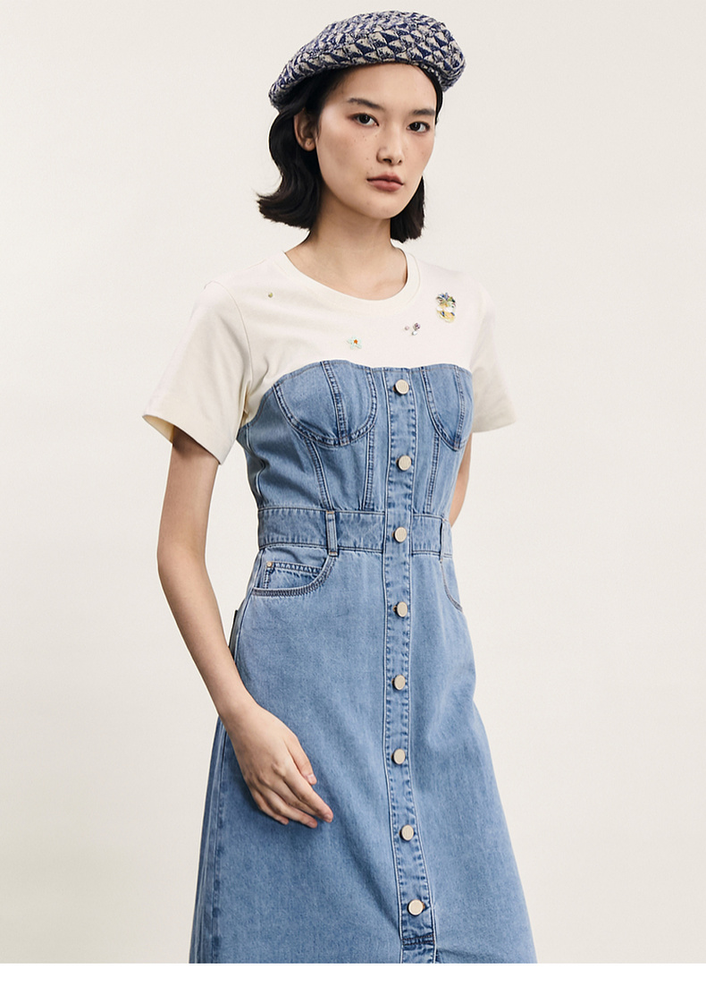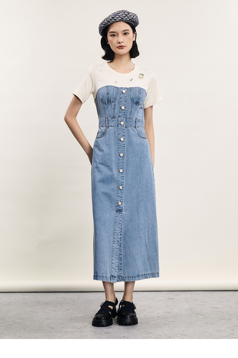 谜底拼接牛仔长裙2024年夏款时尚休闲钉珠绣连衣裙短袖242ML0559