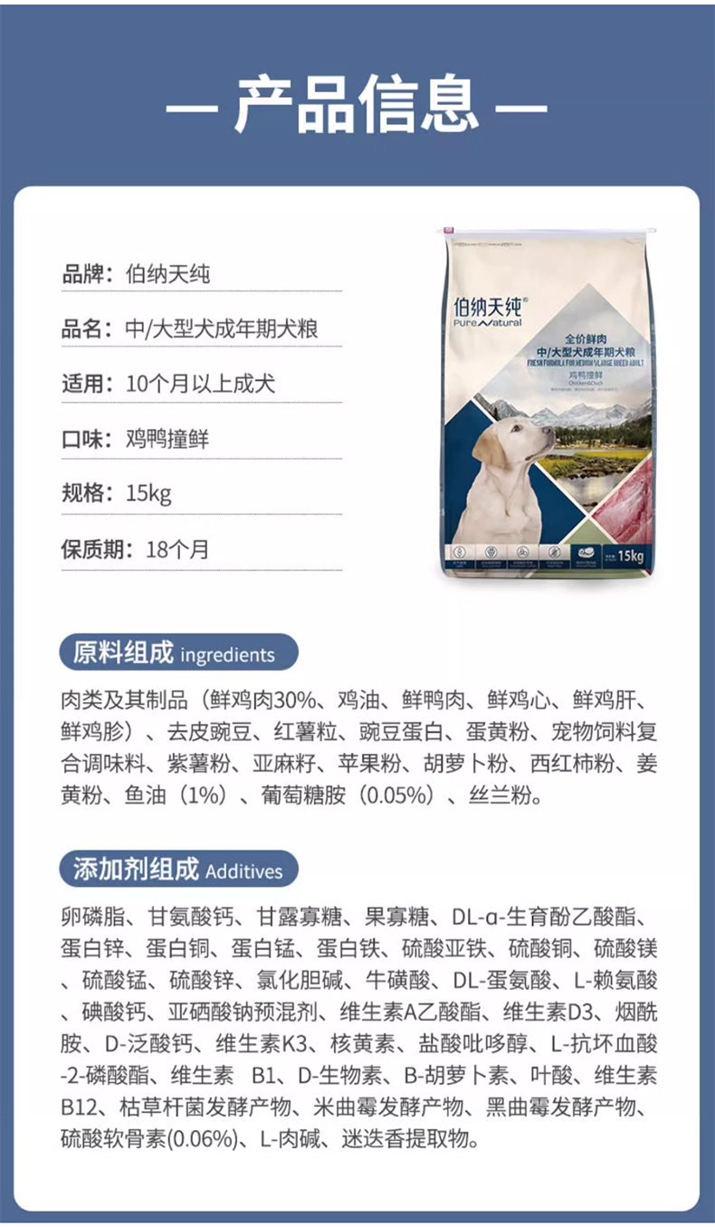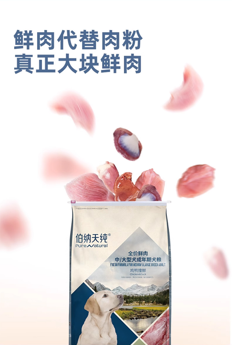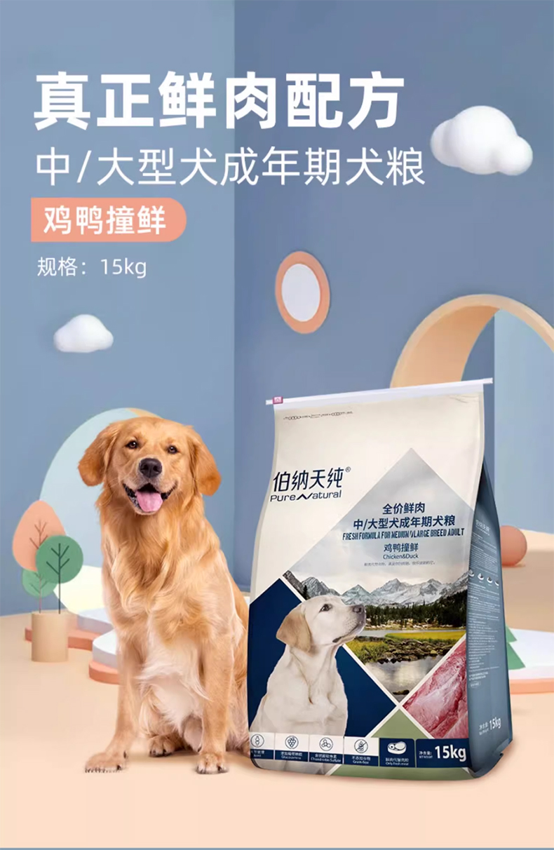 【鲜肉系列】伯纳天纯鲜肉狗粮 中大型犬成犬粮专用粮鸡鸭撞鲜15kg