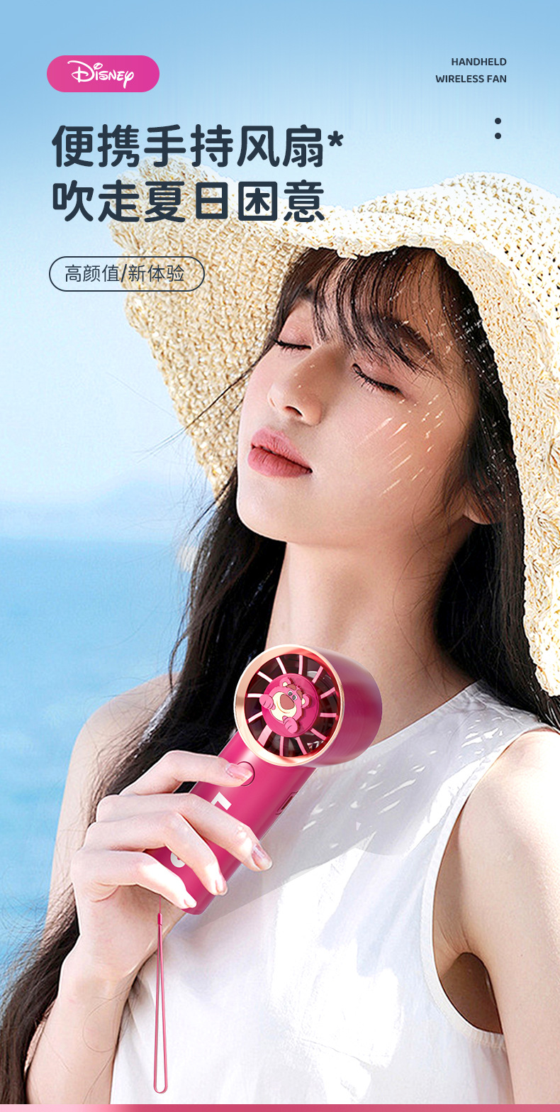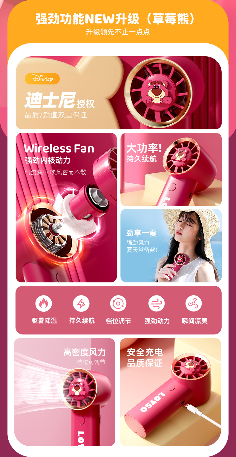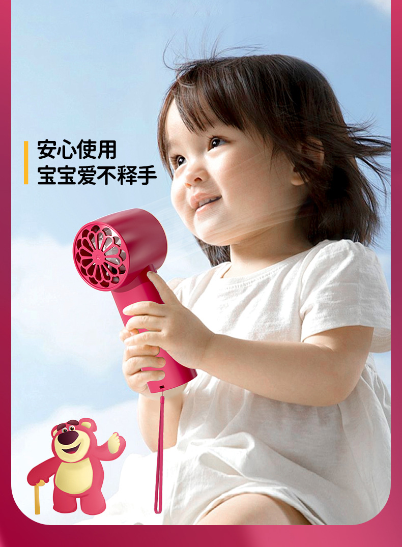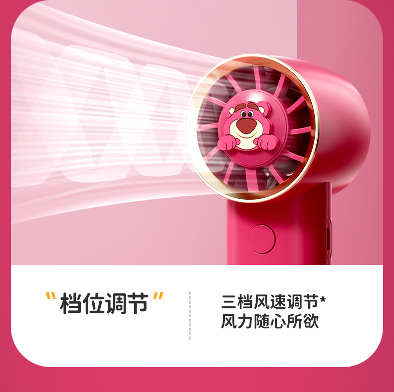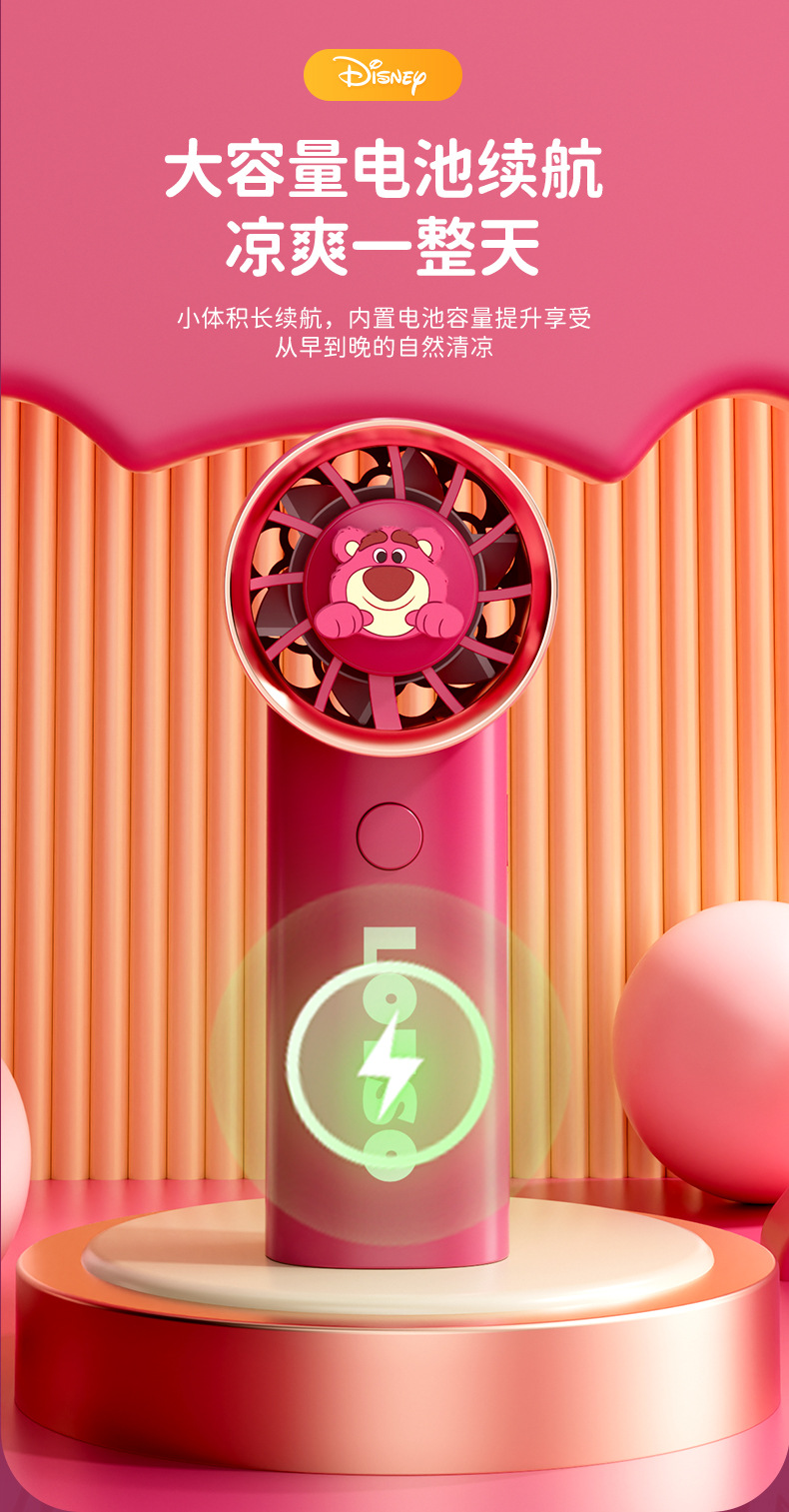【夏日必备!迪士尼草莓熊手持风扇】USB充电,强劲内核动力,三档调节,低音低噪。小巧便携,随身携带,安心使用,大容量续航;宝宝爱不释手!