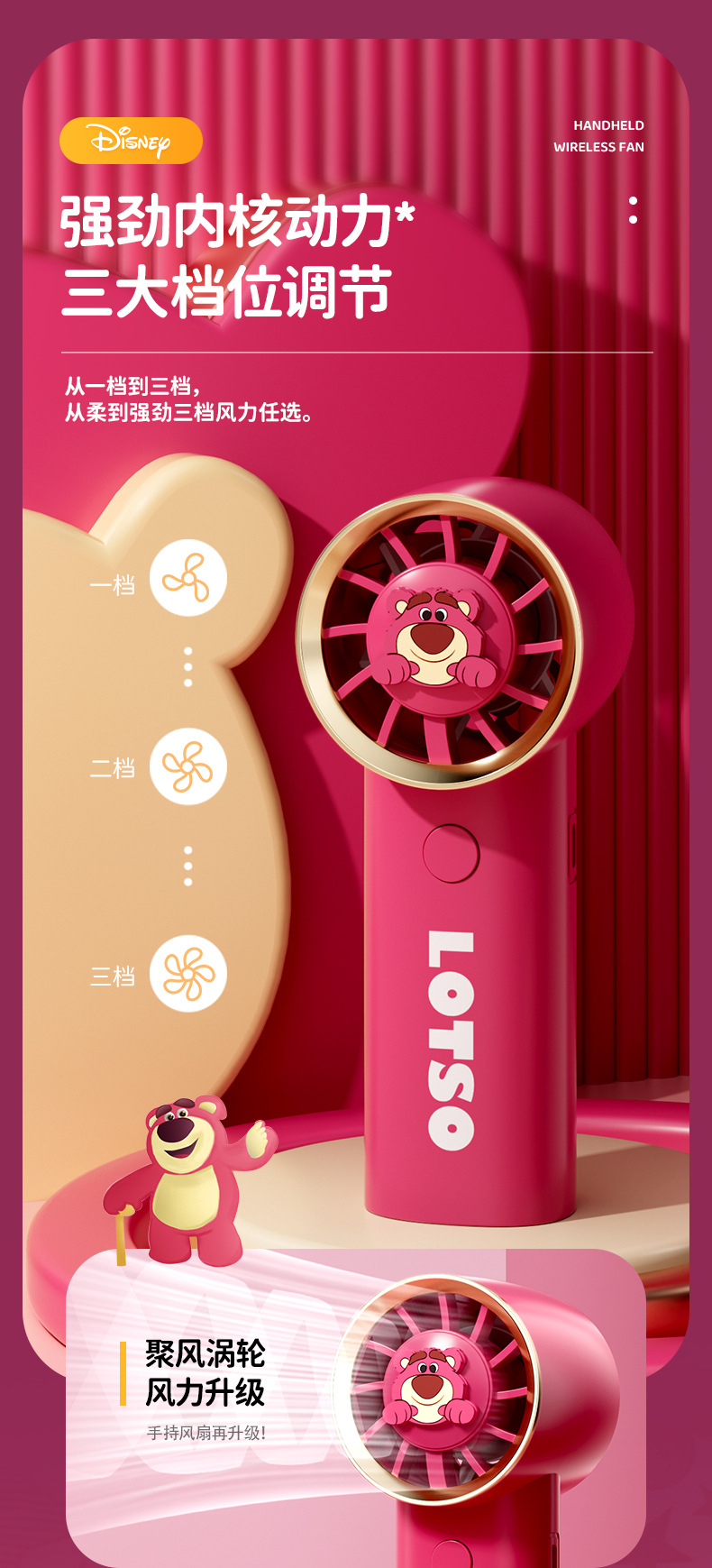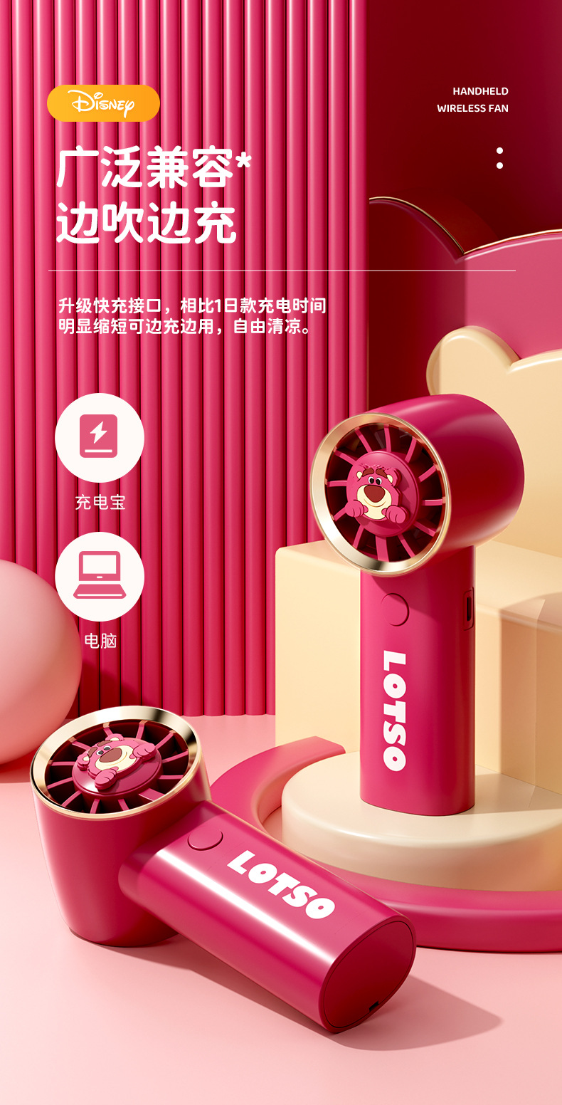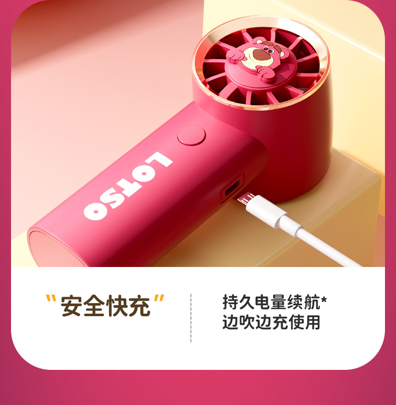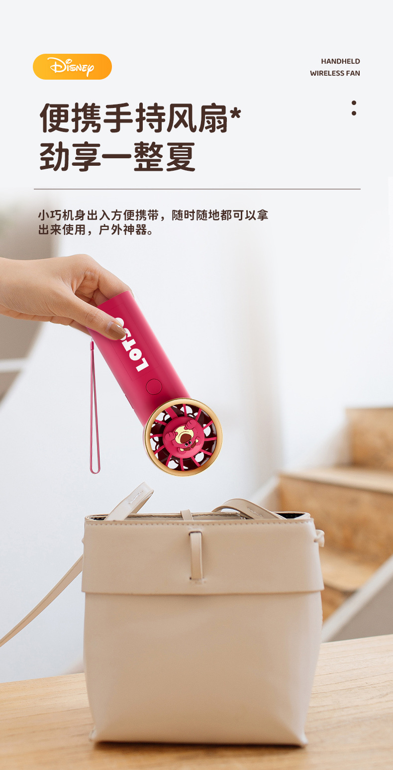 【夏日必备!迪士尼草莓熊手持风扇】USB充电,强劲内核动力,三档调节,低音低噪。小巧便携,随身携带,安心使用,大容量续航;宝宝爱不释手!
