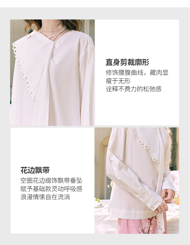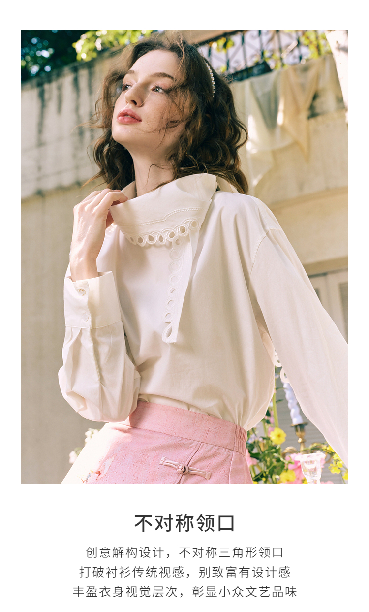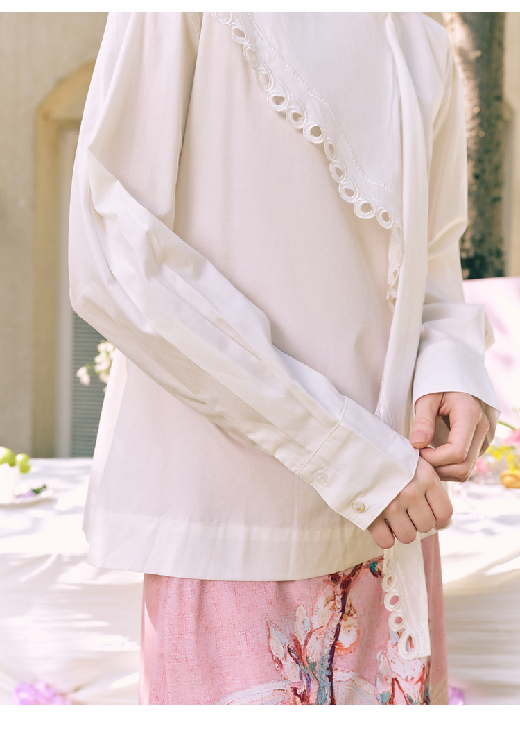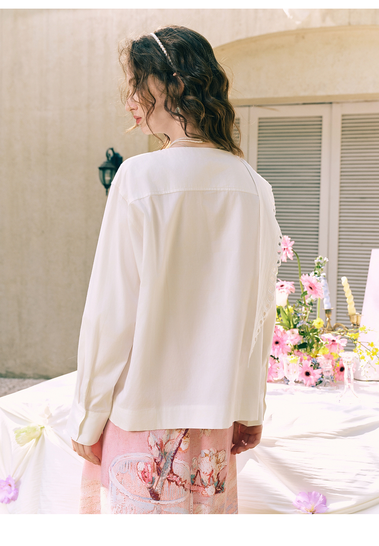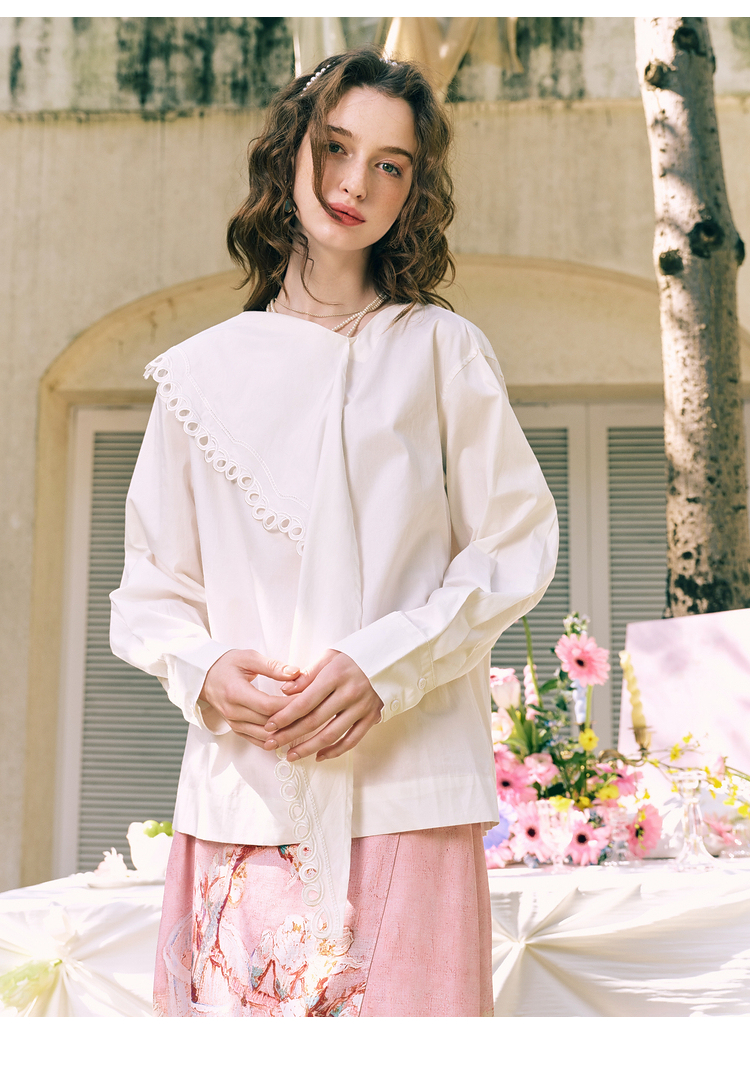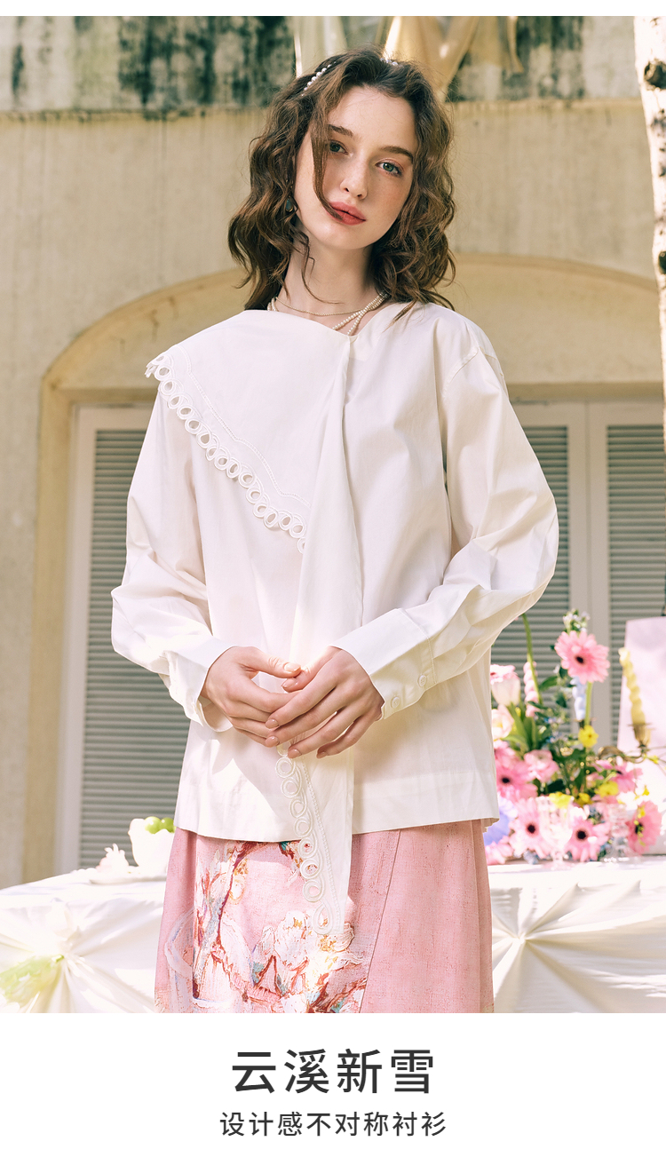 两三事 云溪新雪 2025冬季新款小清新镂空花边围巾领长袖衬衫女