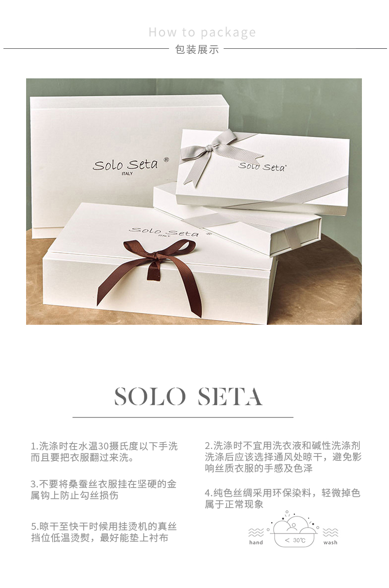 - soloseta专注于真丝织物,灵感源自意大利语,中文含义为“只做真丝”的意思。让睡衣变时尚,居家和外出瞬间切换,使其更具有出街,度假,参加宴会等功能。