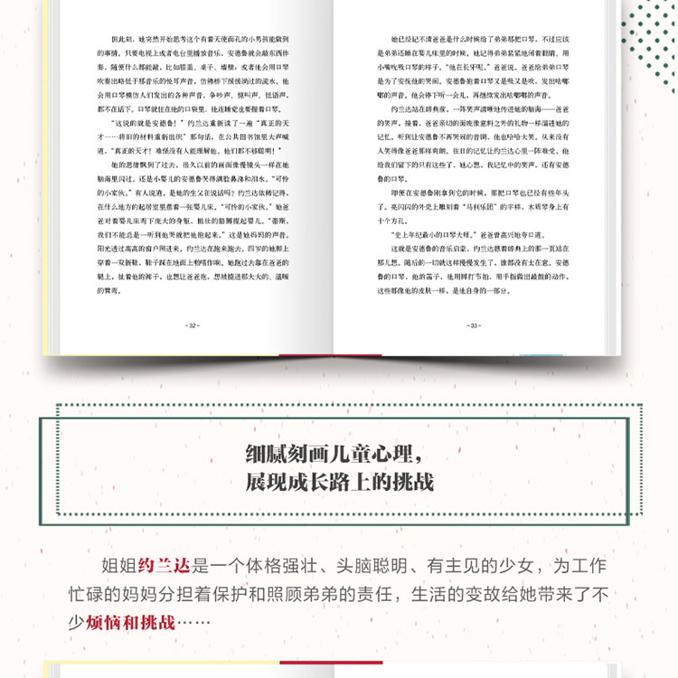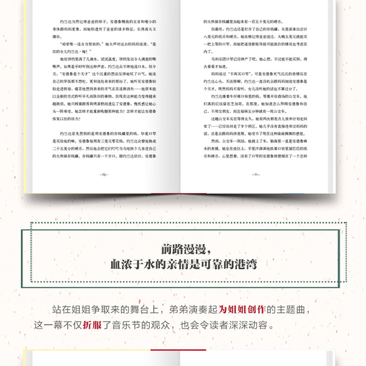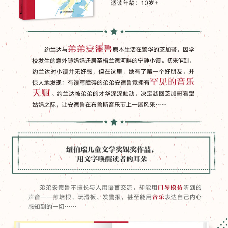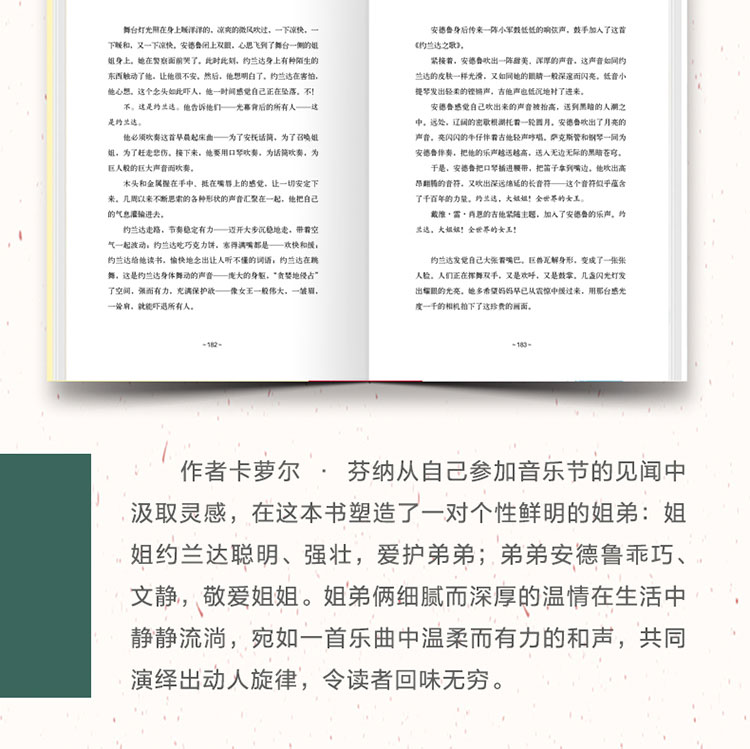 作者卡萝尔·芬纳从自己参加音乐节的见闻中汲取灵感,在这本书塑造了一对个性鲜明的姐弟:姐姐约兰达聪明、强壮,爱护弟弟;弟弟安德鲁乖巧、文静,敬爱姐姐。姐弟俩细腻而深厚的温情在生活中静静流淌,宛如一首乐曲中温柔而有力的和声,共同演绎出动人旋律,令读者回味无穷。