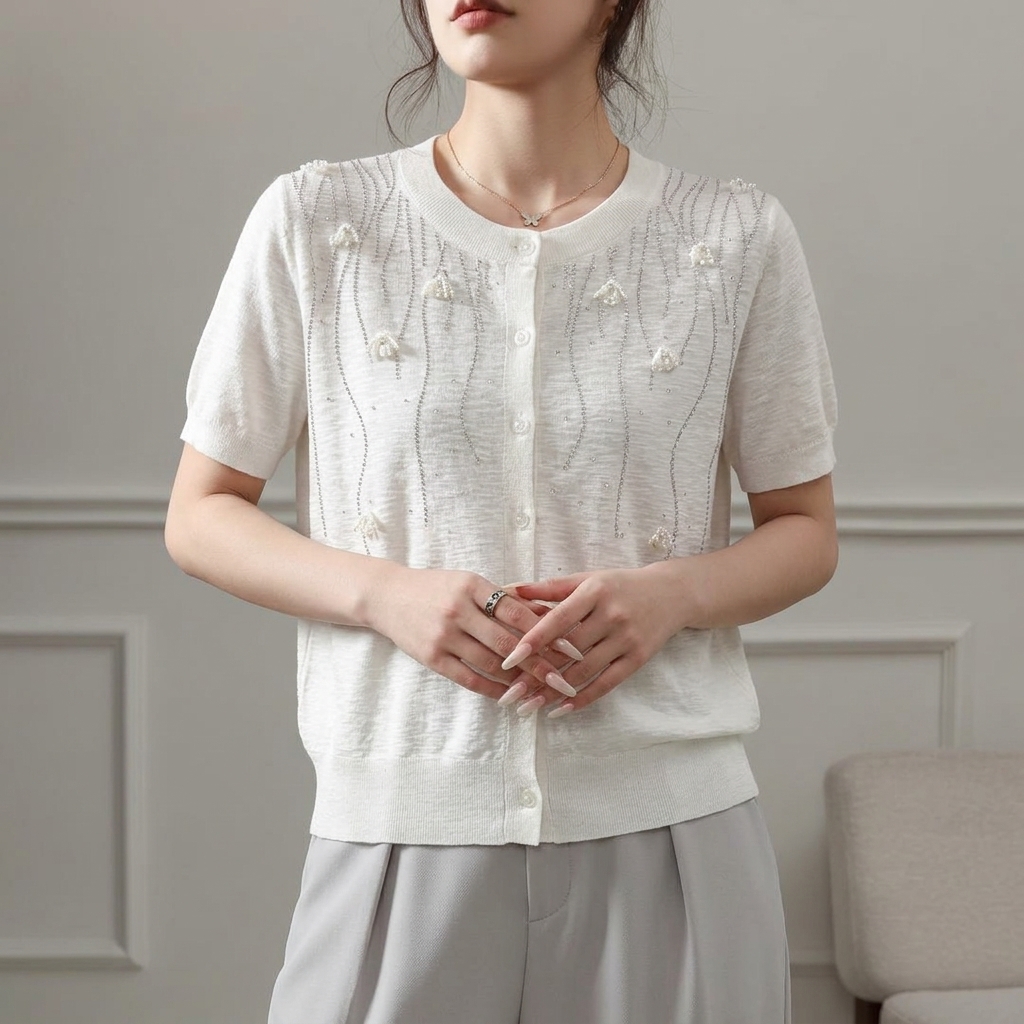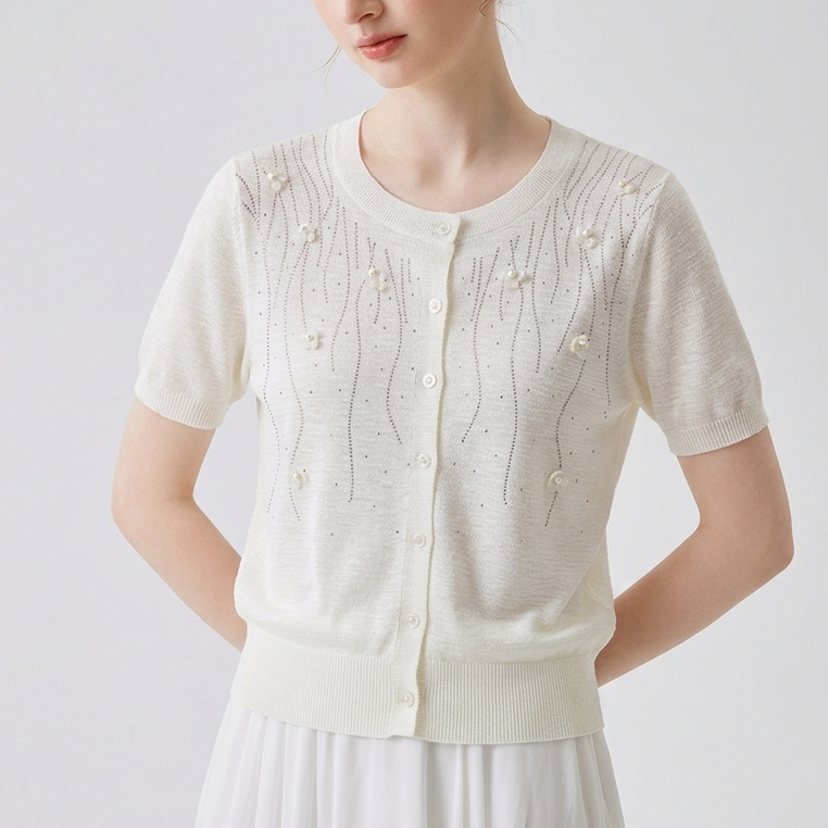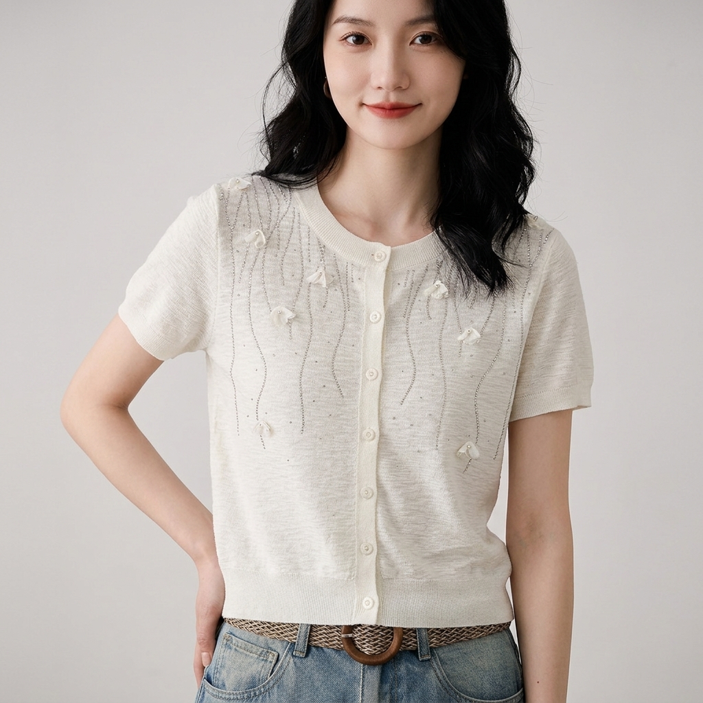 汀兰雪絮~高级感重工烫钻莱赛尔 亚麻立体花朵开衫 百搭宽松针织衫