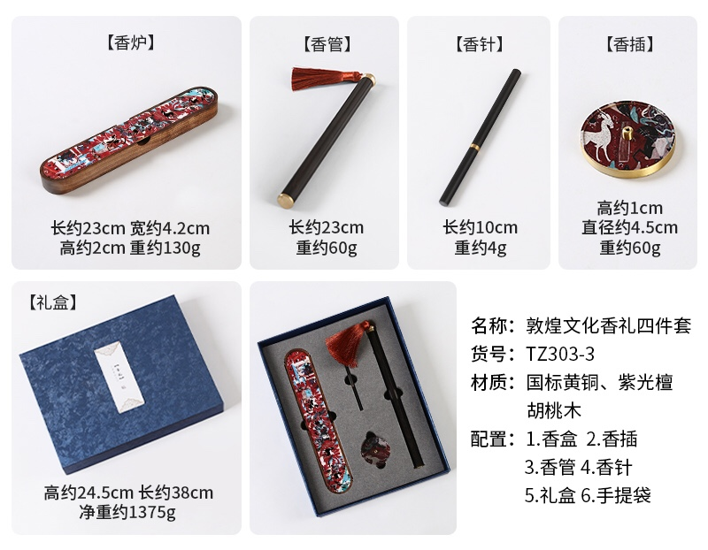 【尺寸】香炉约23*4.2*2 重约130g,香管长约23*1.5cm 重约60g,香针长约10cm 约4g,香插约4.5*1cm 重约60g,礼盒尺寸约28*21*4.5cm 重约665g