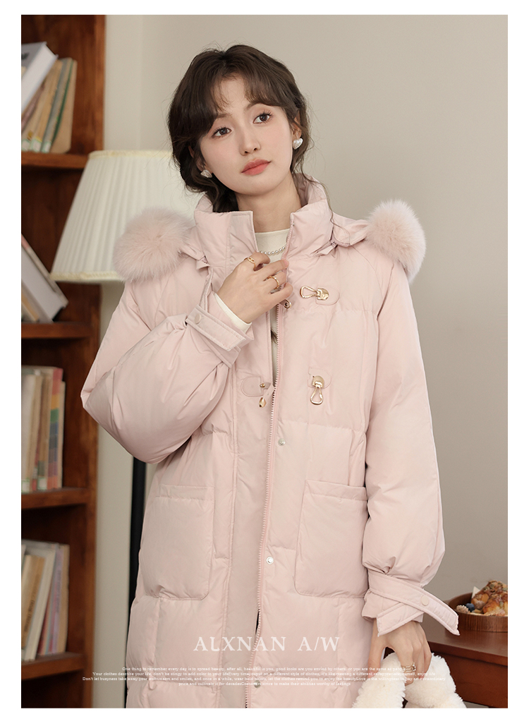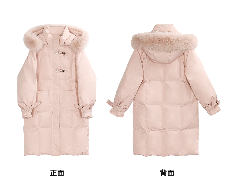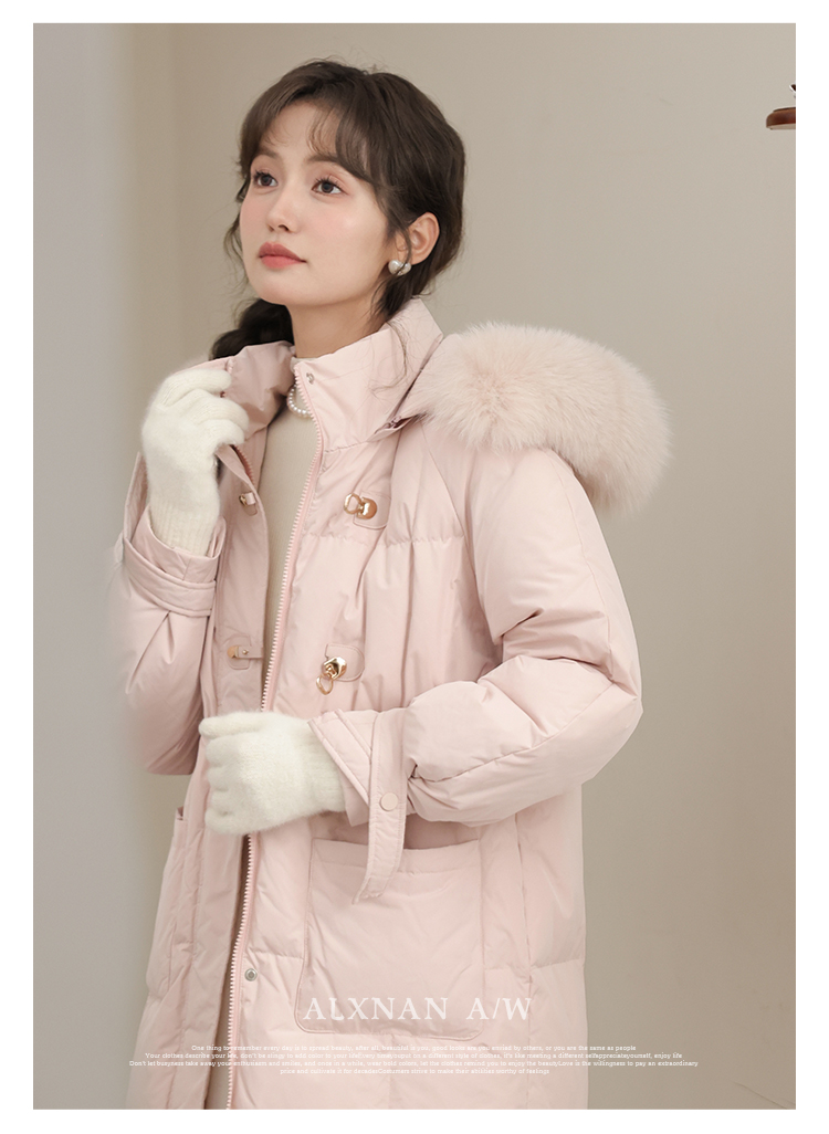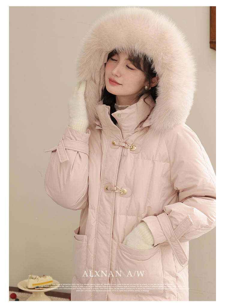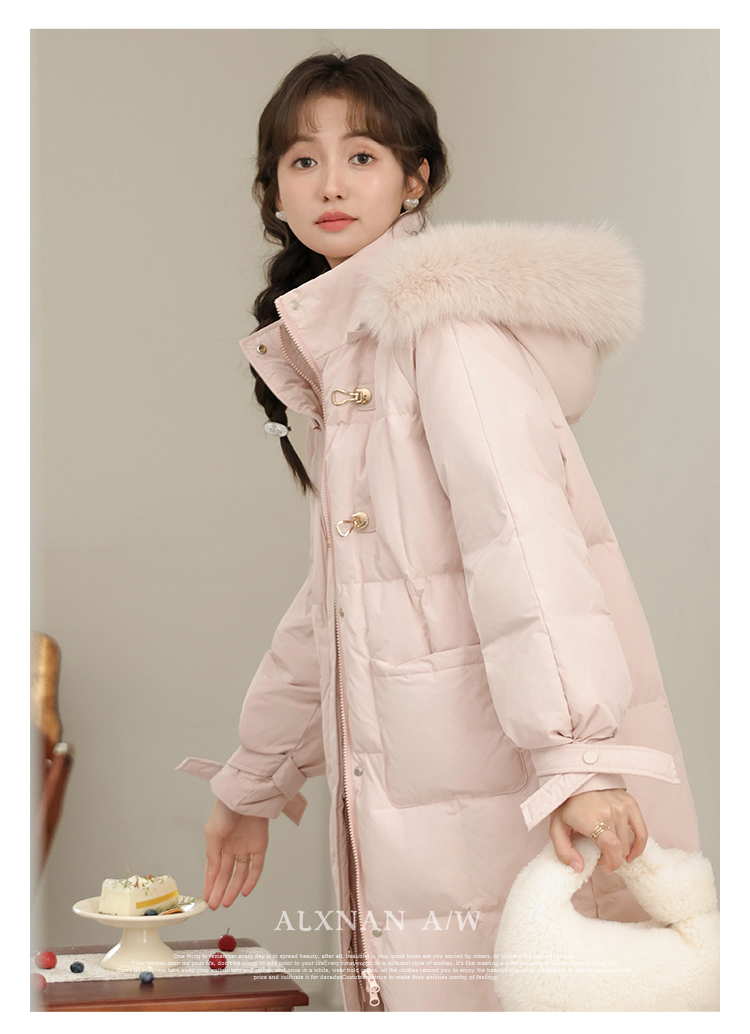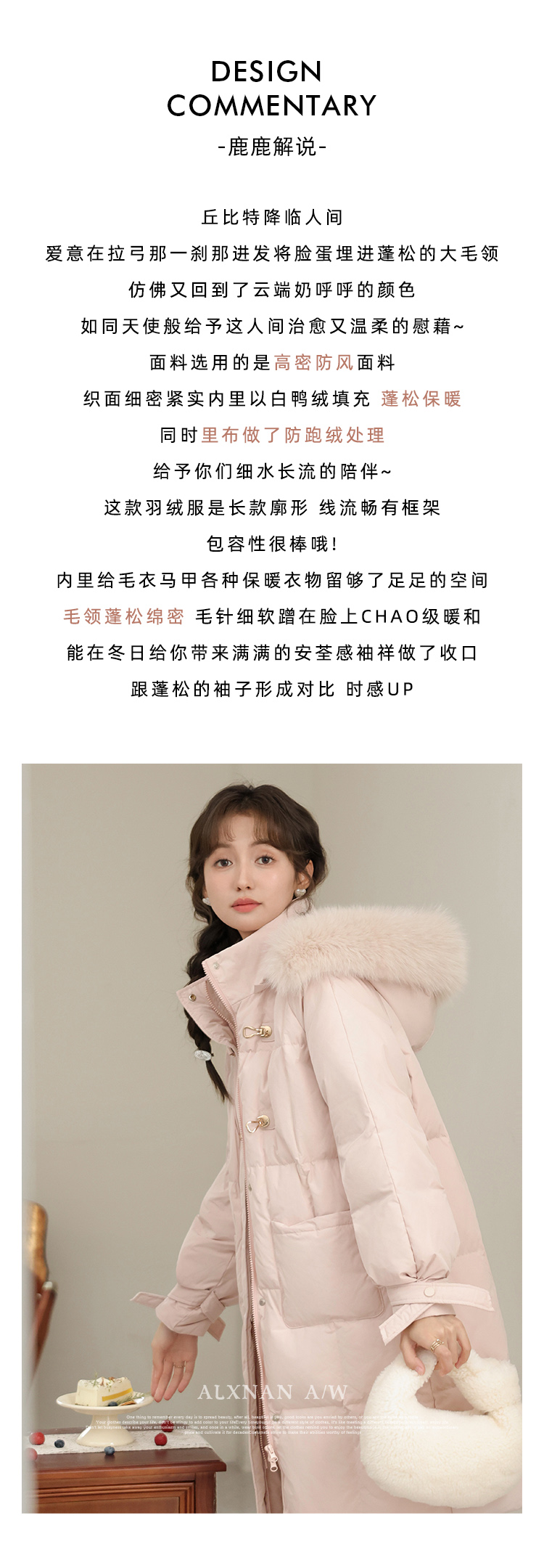 鹿向南《温暖氛围感》90白鸭绒粉色羽绒服女2025冬季真毛领长外套