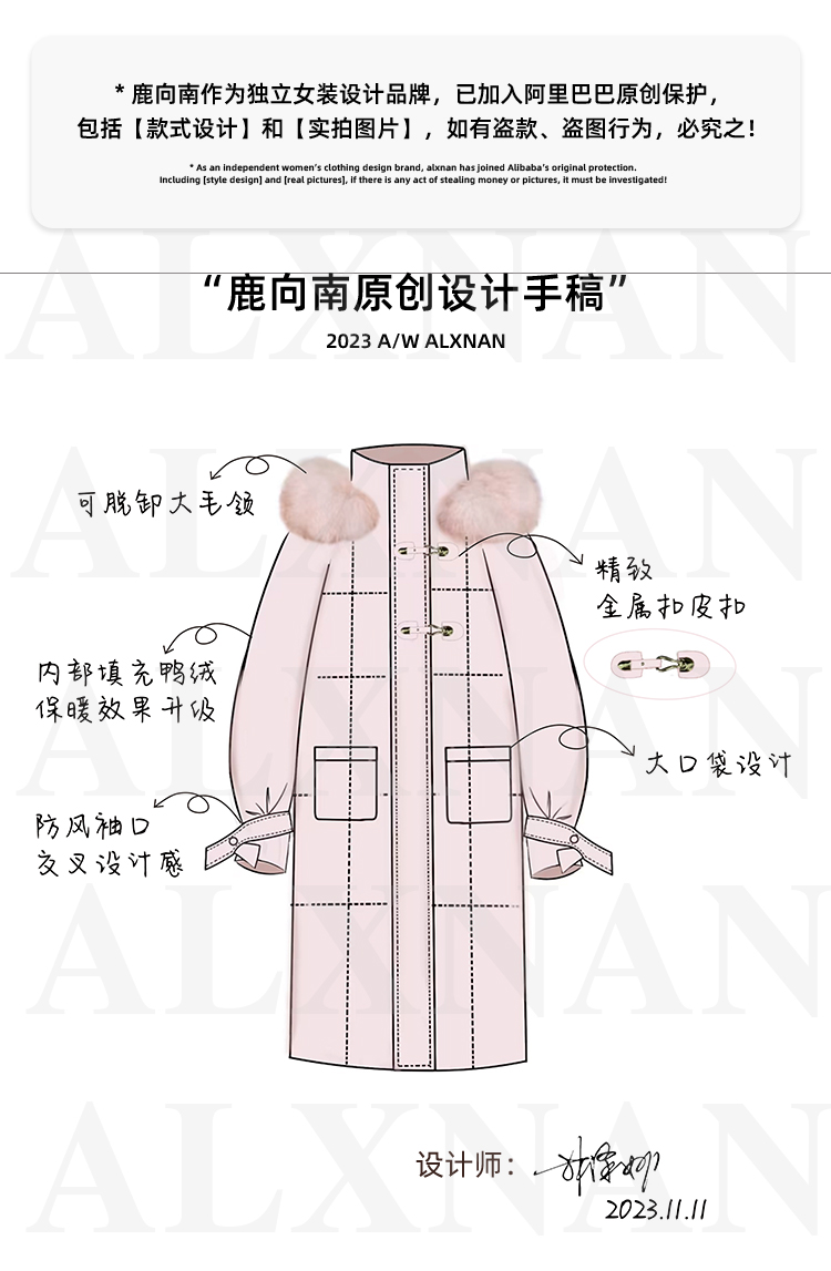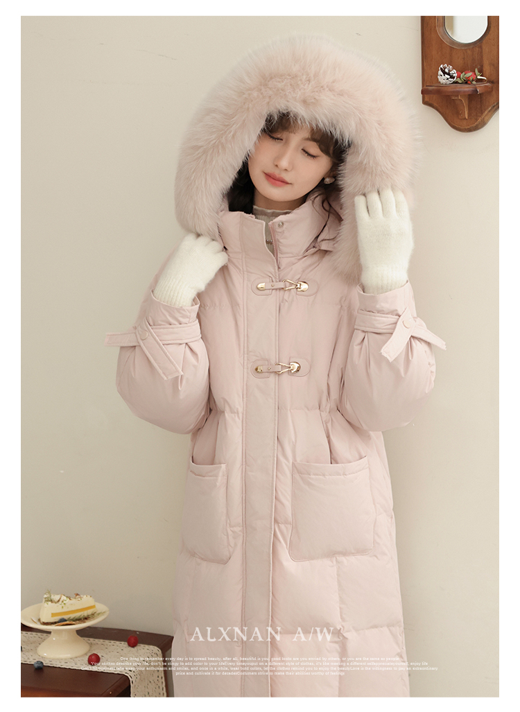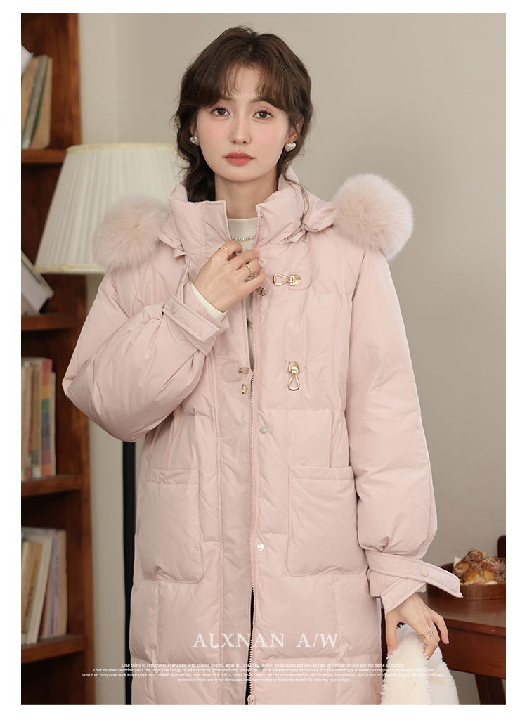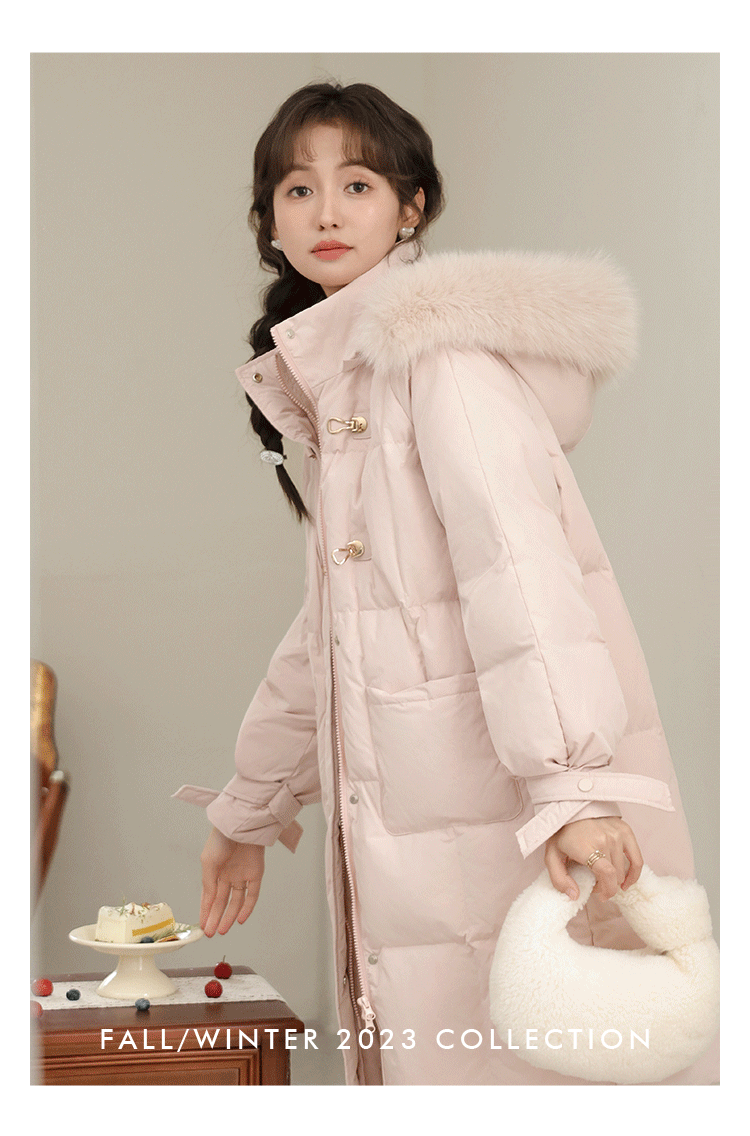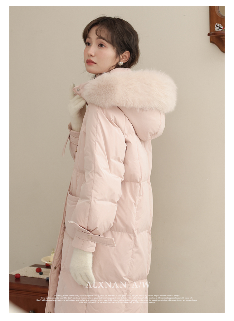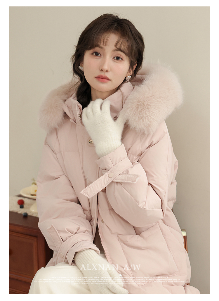 鹿向南《温暖氛围感》90白鸭绒粉色羽绒服女2025冬季真毛领长外套
