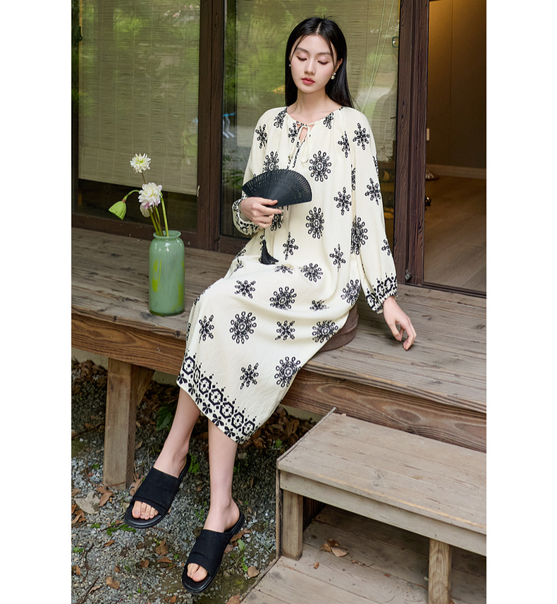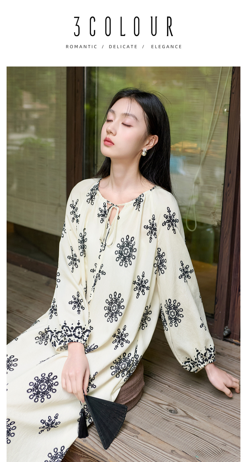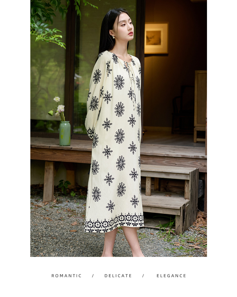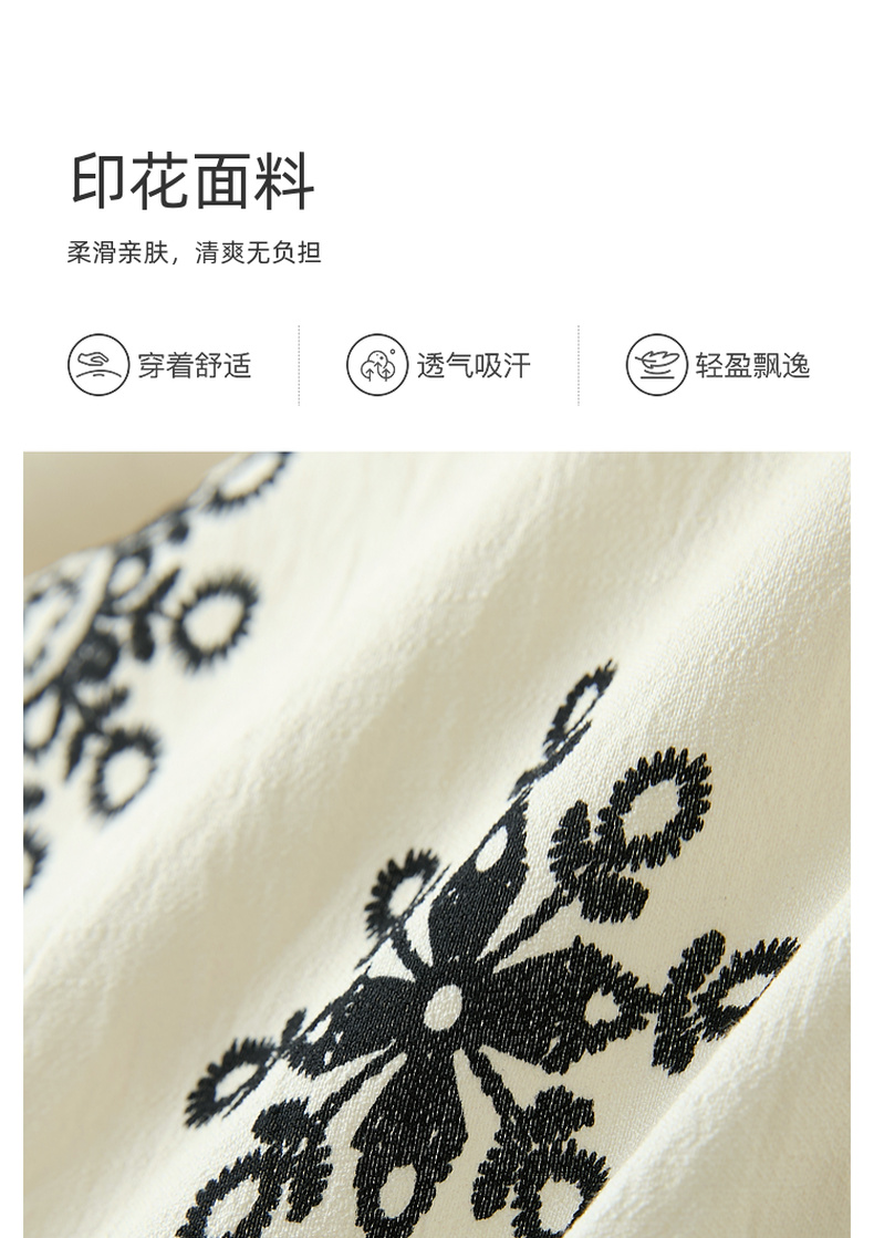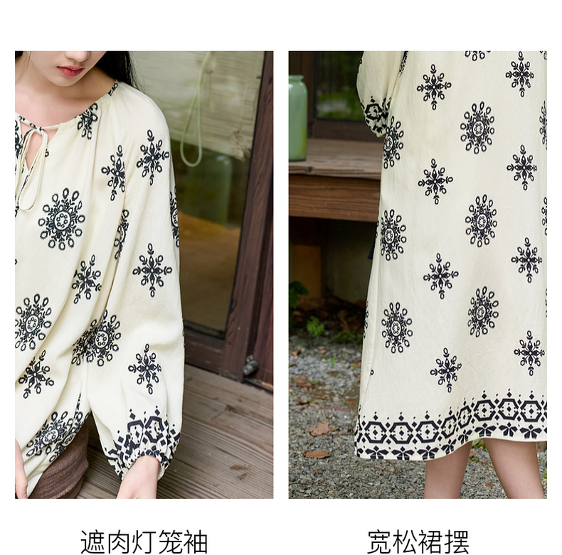 三彩2025秋季新款家居服睡裙印花连衣裙圆领系带长裙M