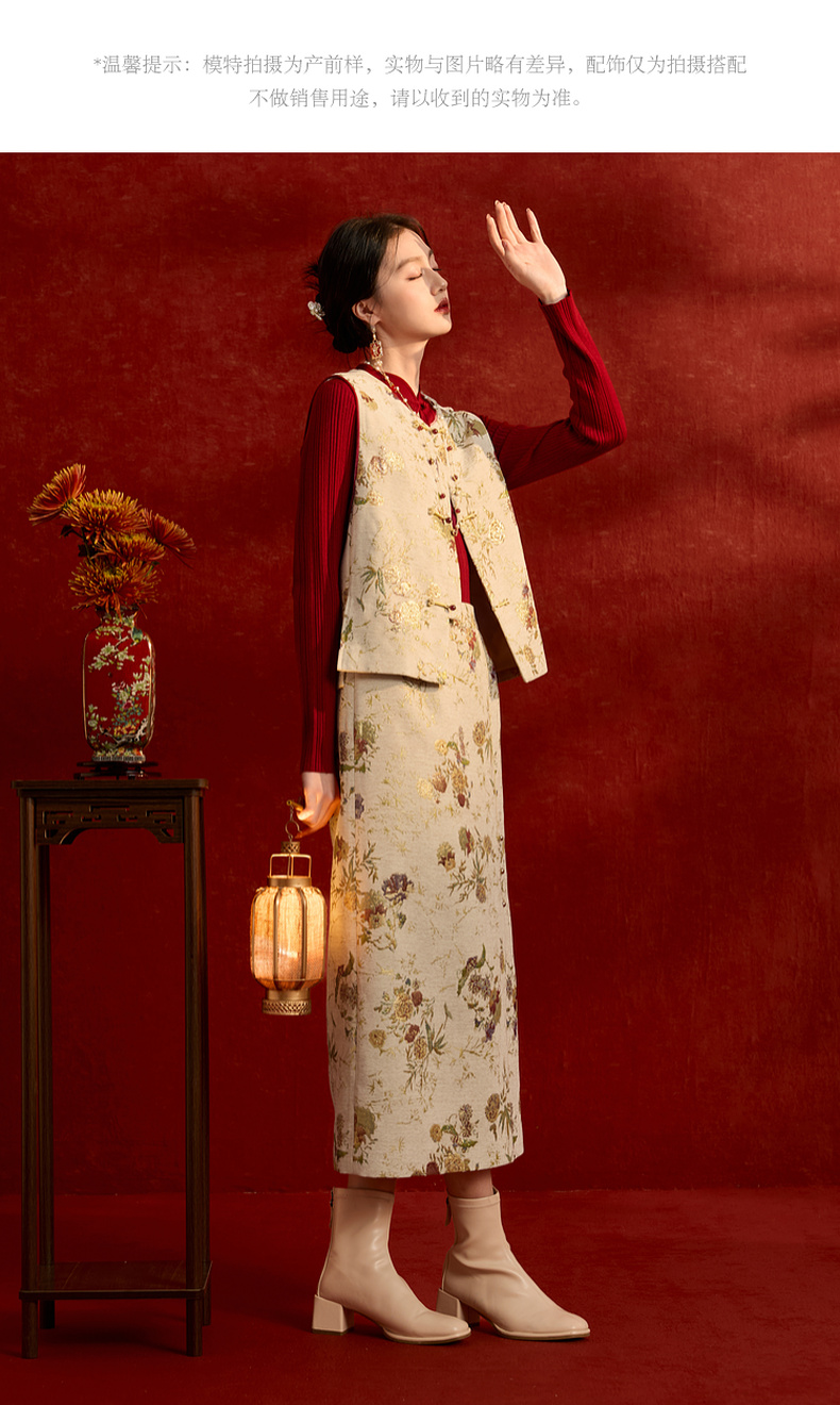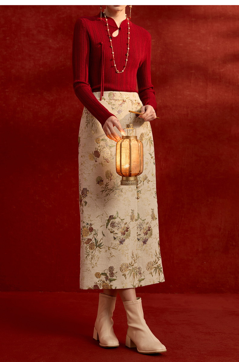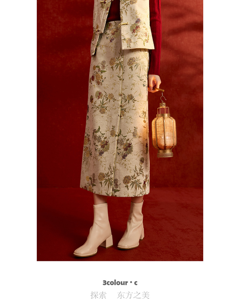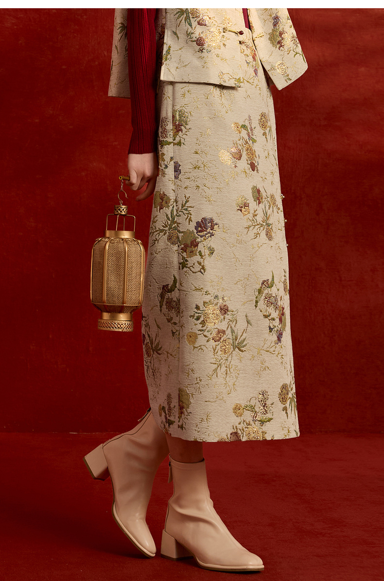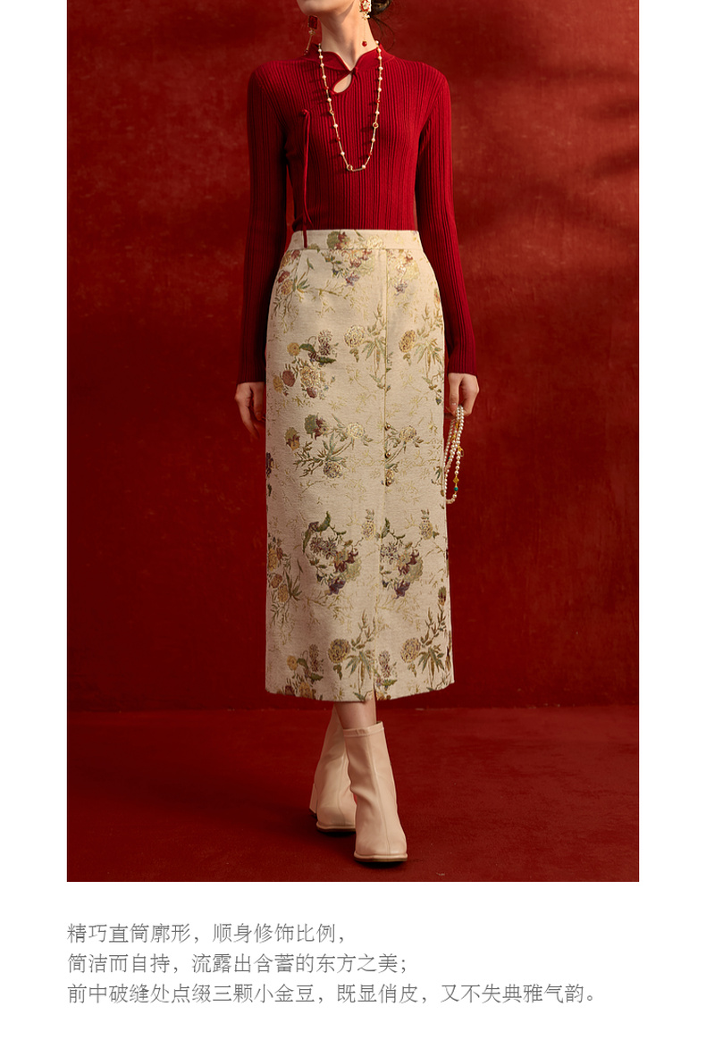 三彩【梦里浮花】2025冬季新款提花半身裙新中式直筒裙长裙C