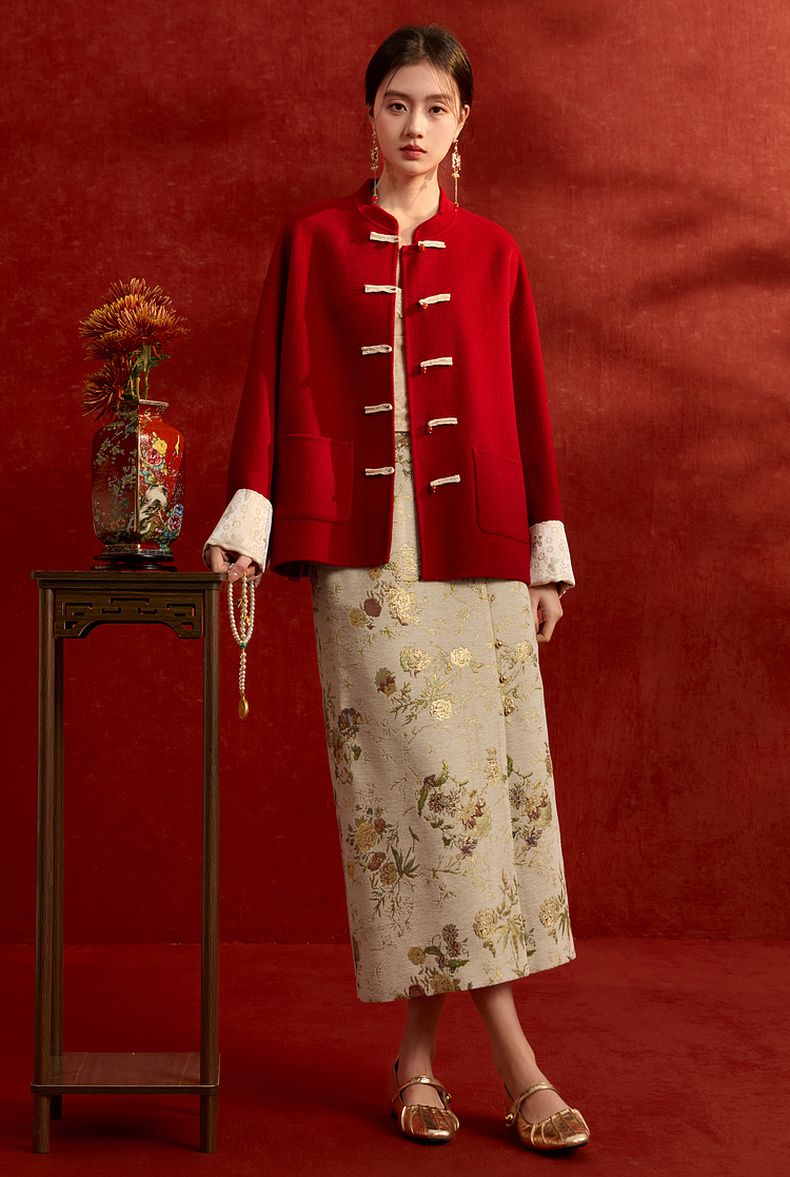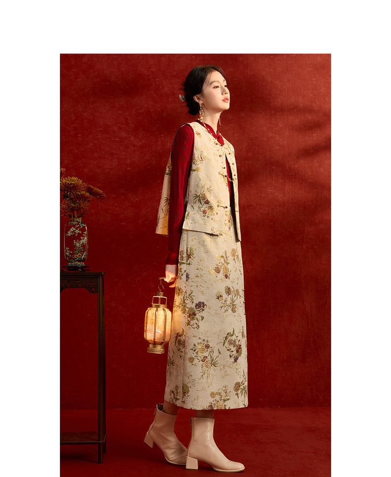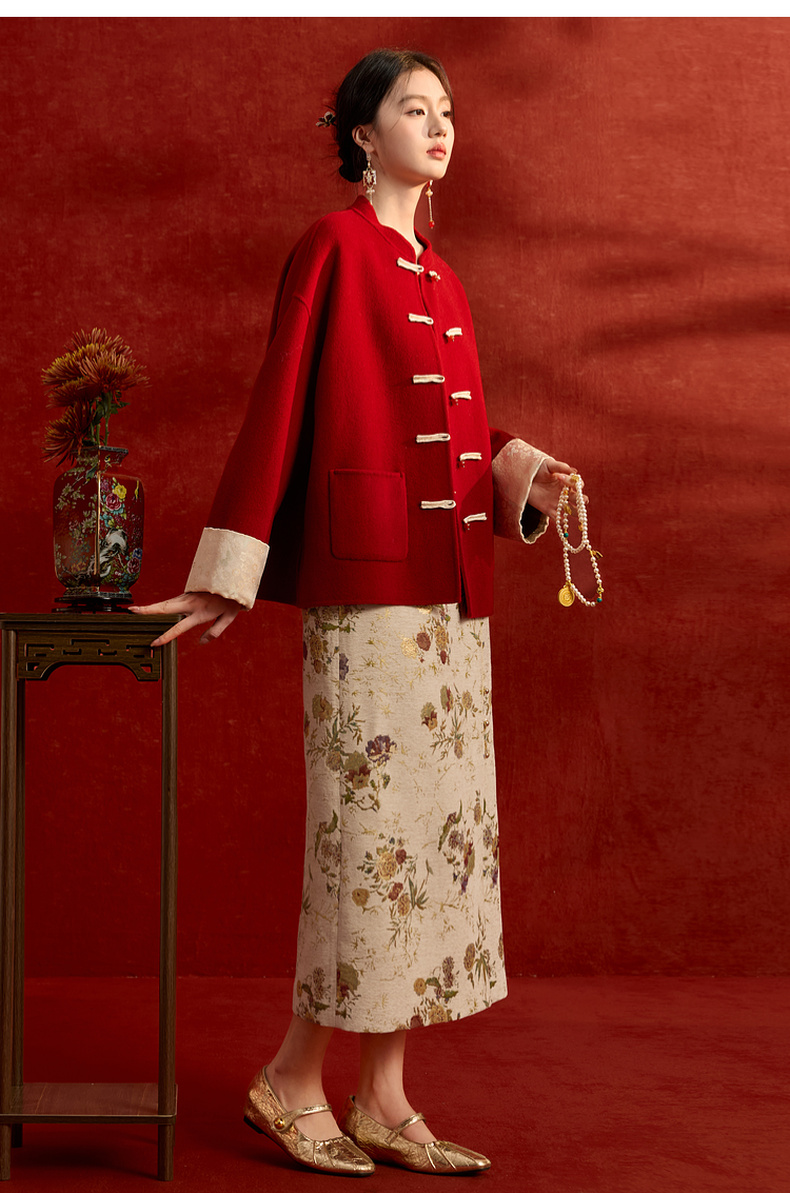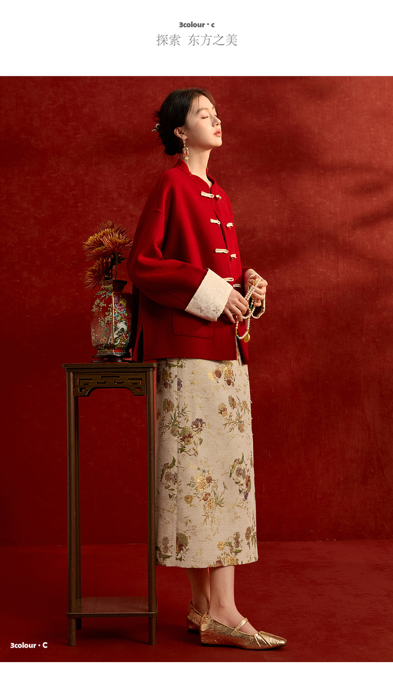 三彩【梦里浮花】2025冬季新款提花半身裙新中式直筒裙长裙C