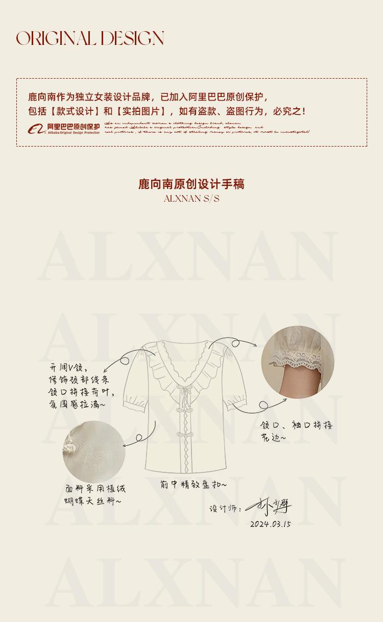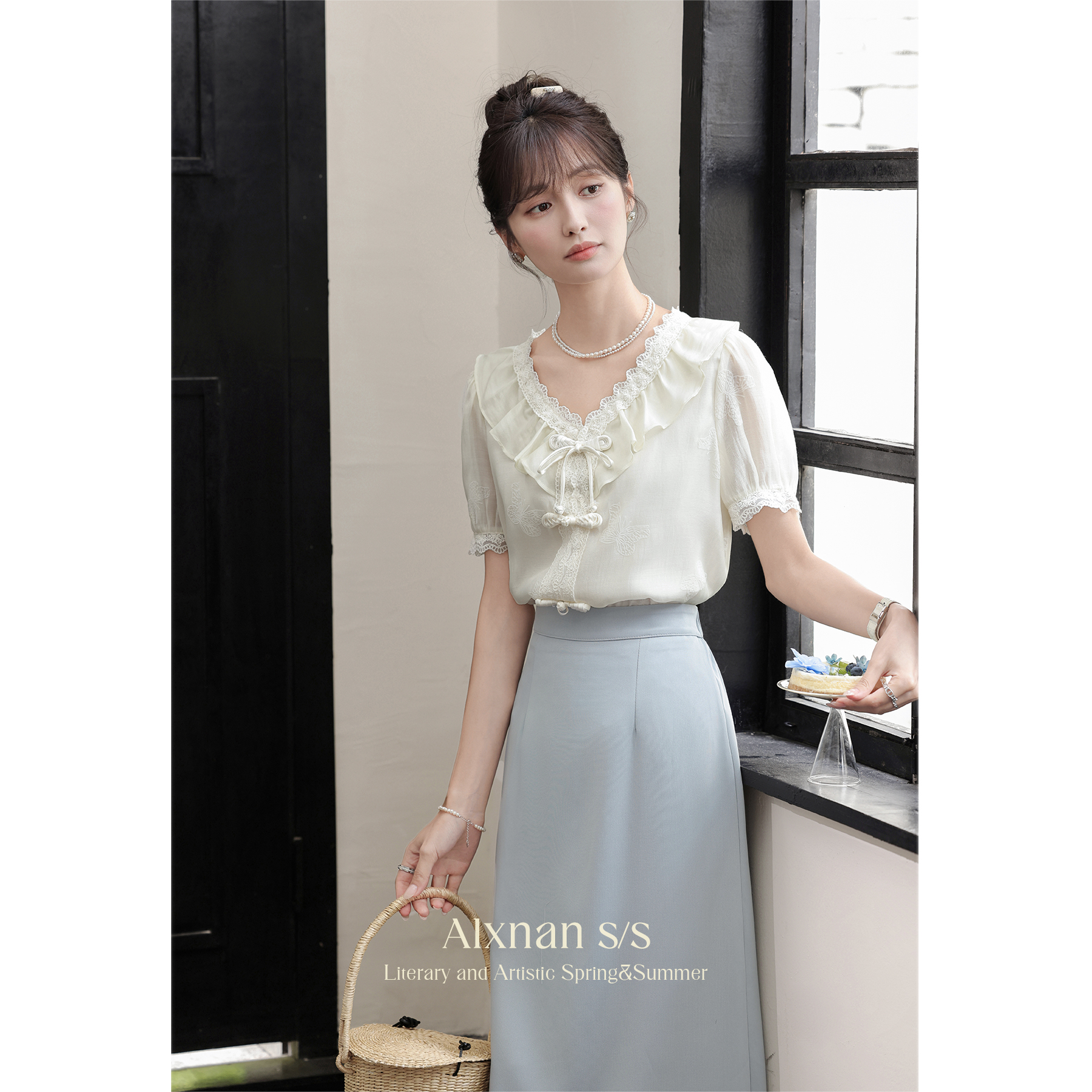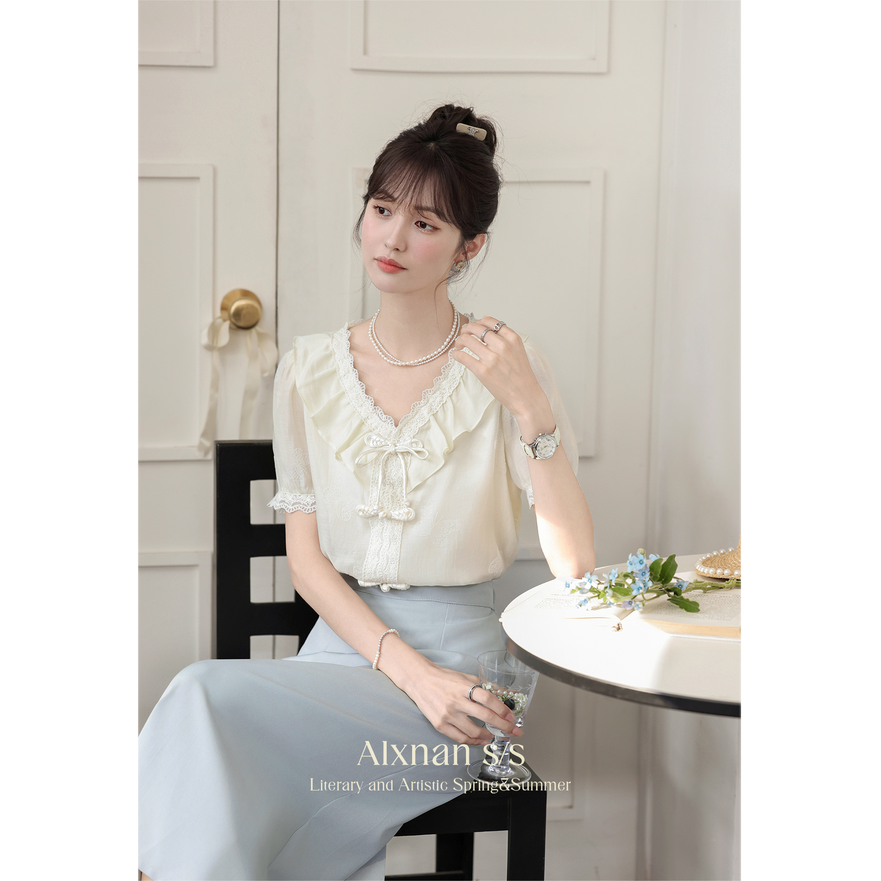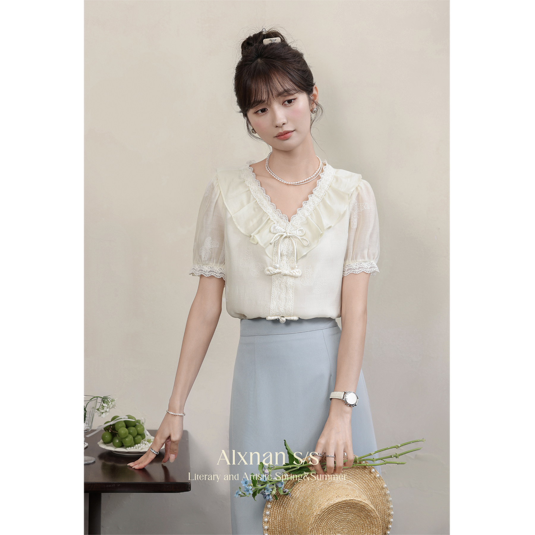 【6折秒杀】鹿向南「如梦令」法式短袖V领衬衫女夏季新款时尚设计感气质上衣L37828