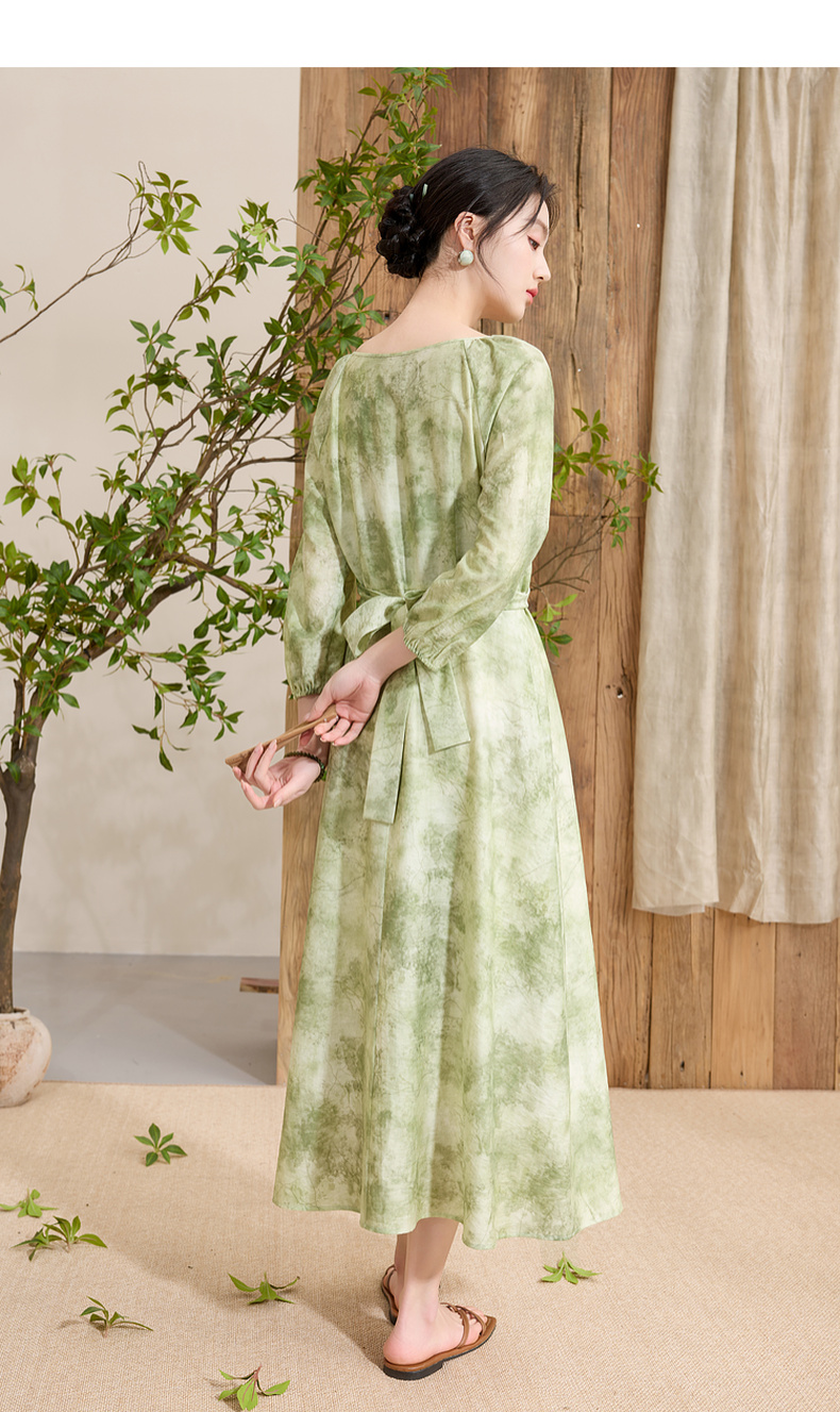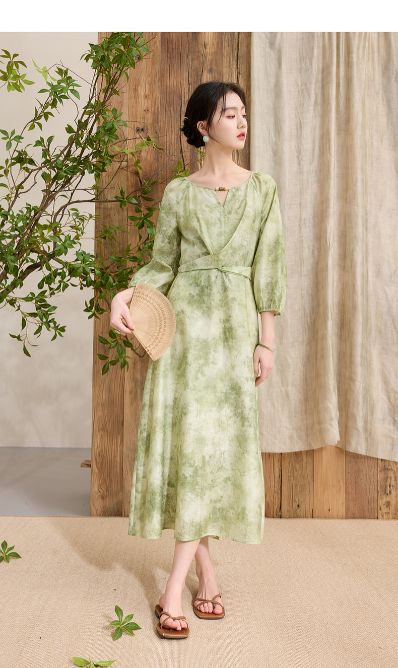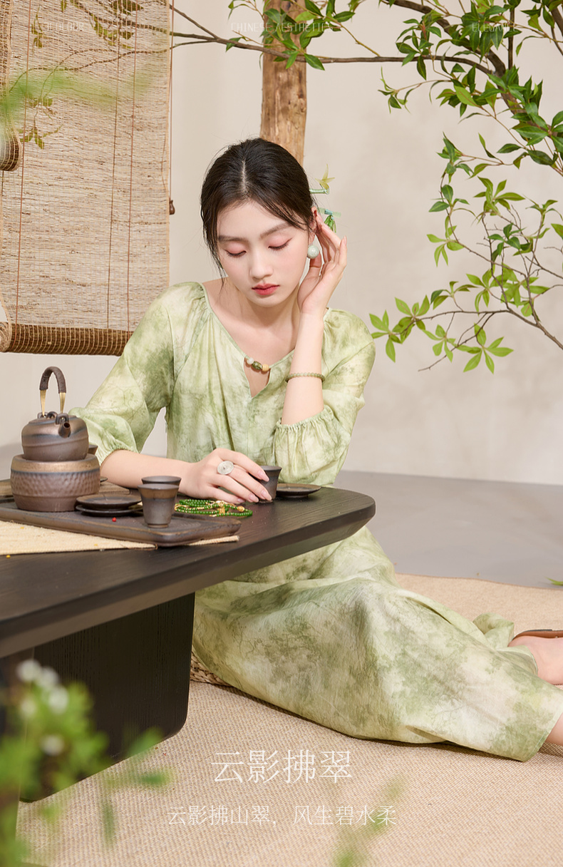 三彩【云影拂翠】2025春季新款新中式晕染印花长裙连衣裙插肩袖C