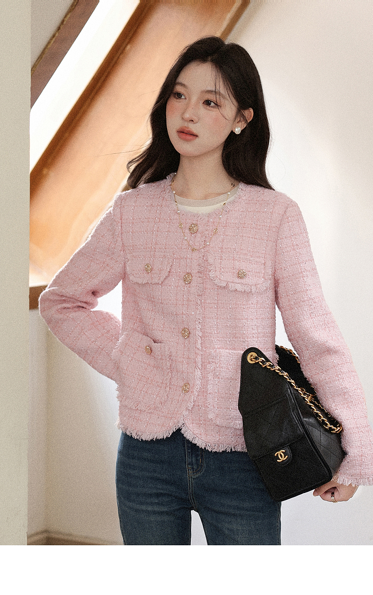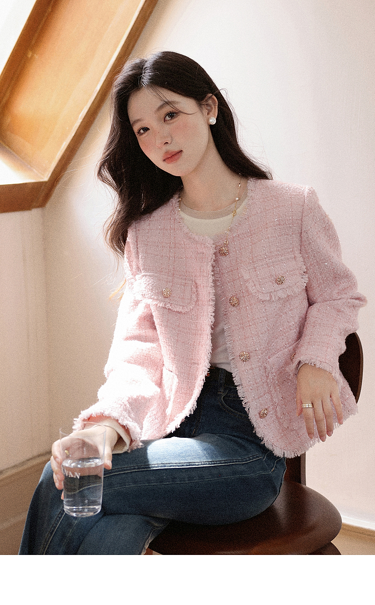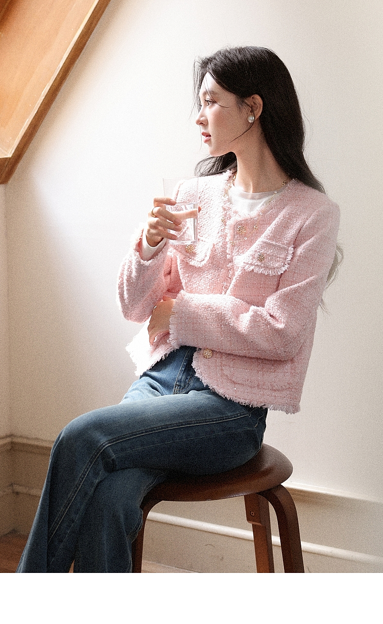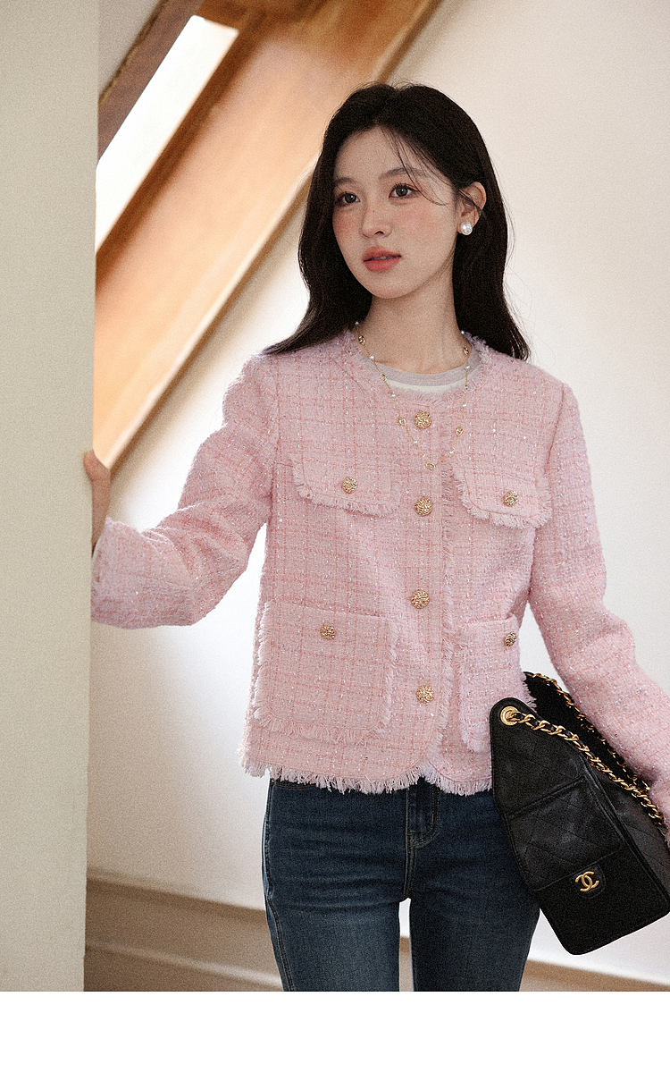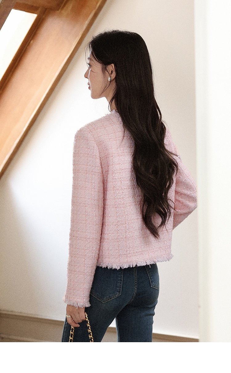 【65折秒杀】鹿向南「海岛粉盐」粉色正肩小香风外套女秋季新款巨好看短款上衣
