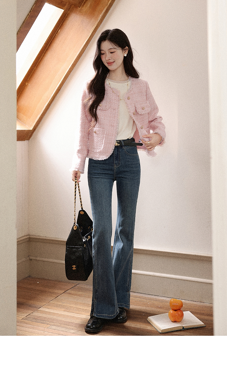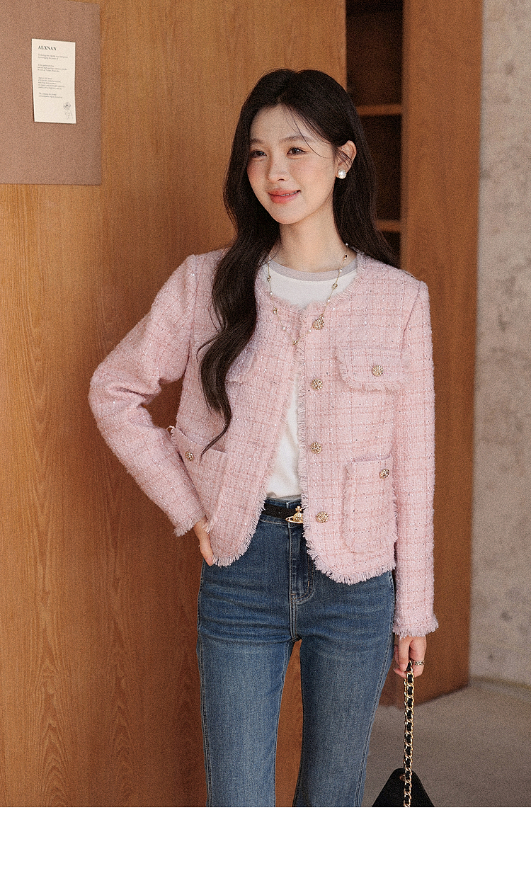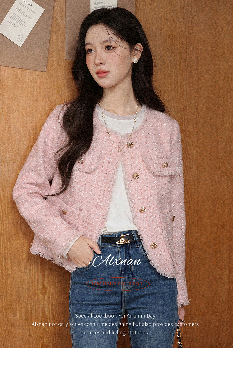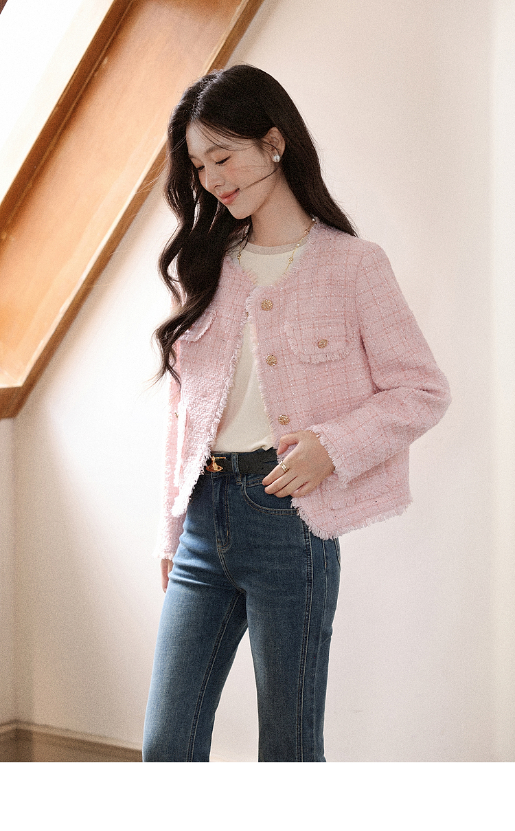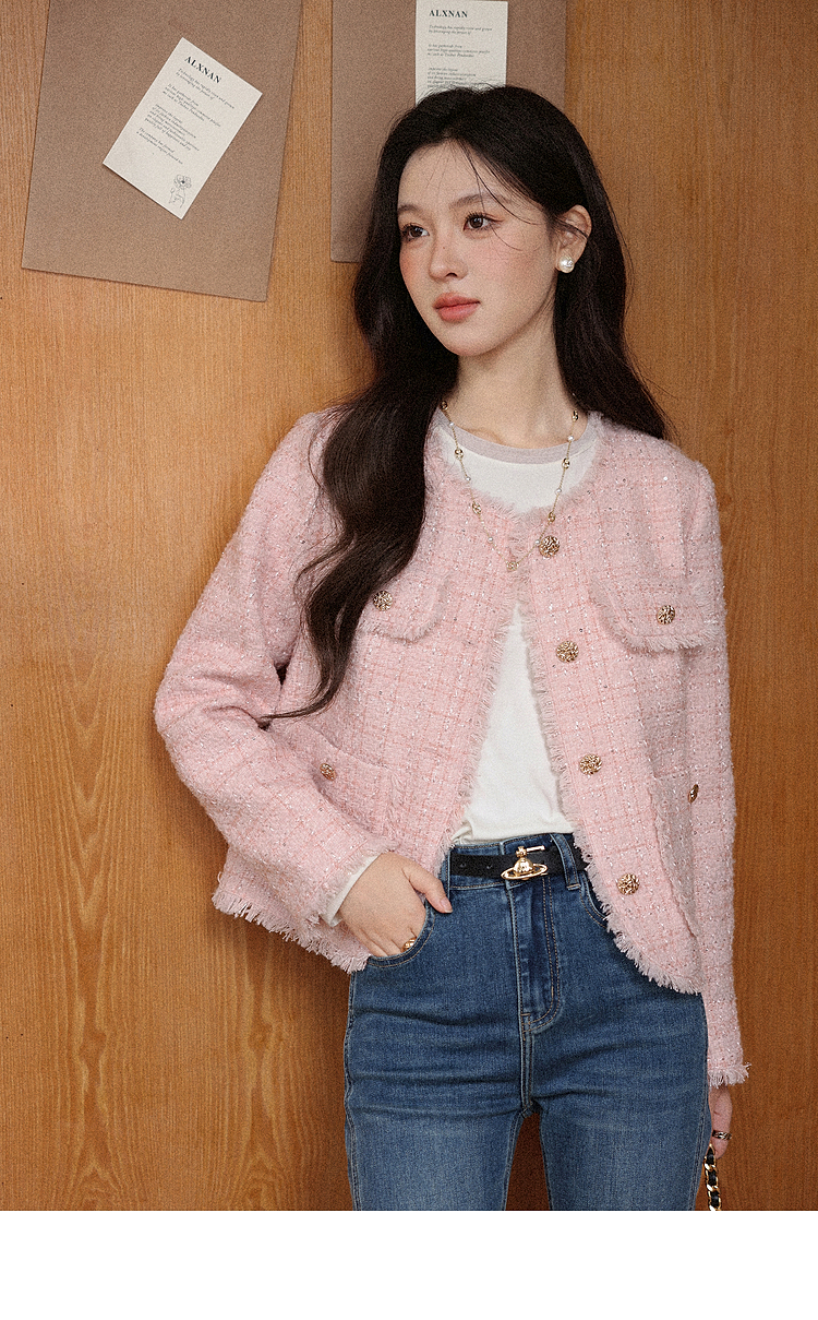 【65折秒杀】鹿向南「海岛粉盐」粉色正肩小香风外套女秋季新款巨好看短款上衣