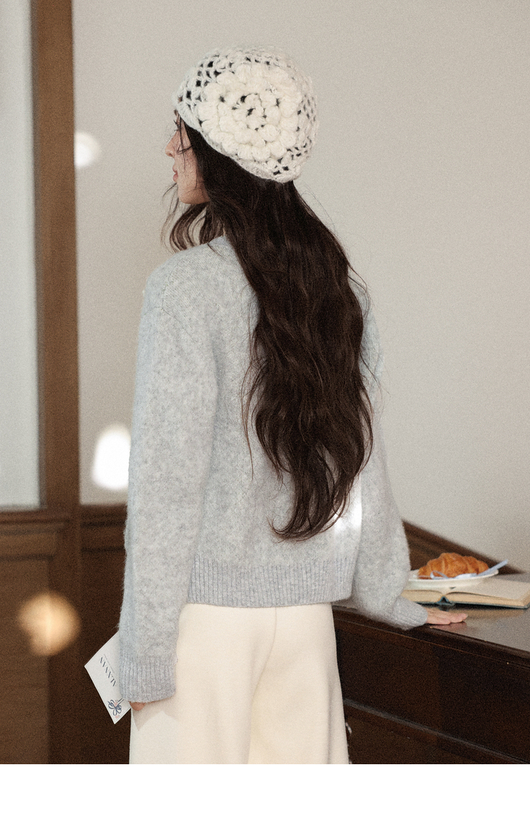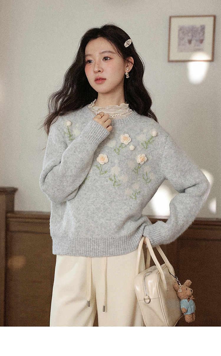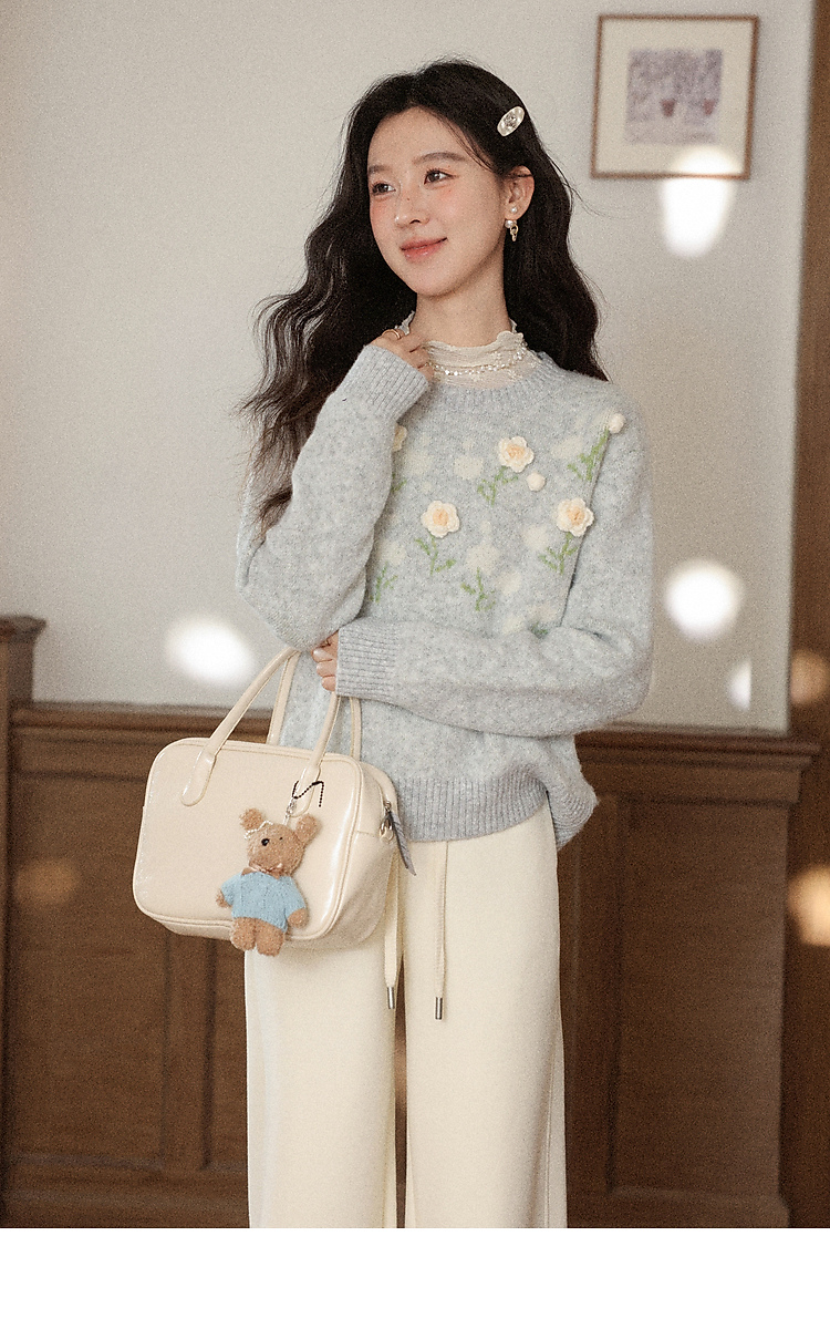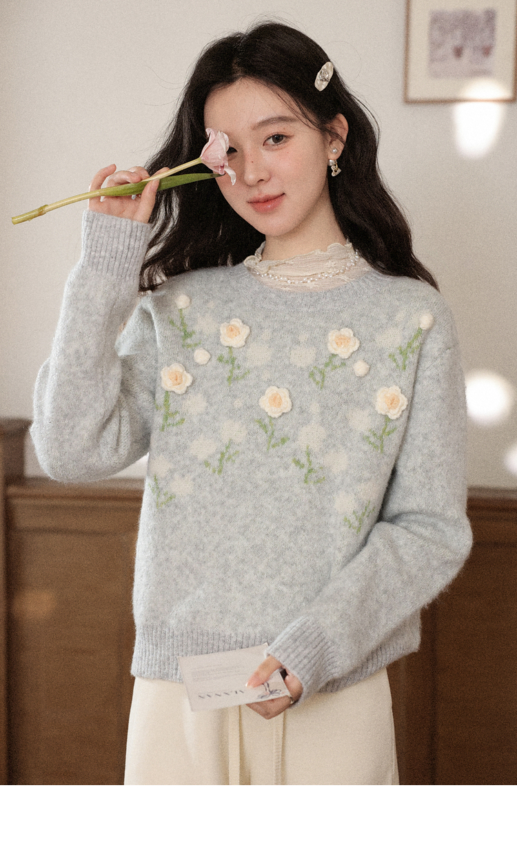 鹿向南「蓝焰暖冬」蓝色花朵毛衣女秋冬新款法式慵懒感针织衫上衣