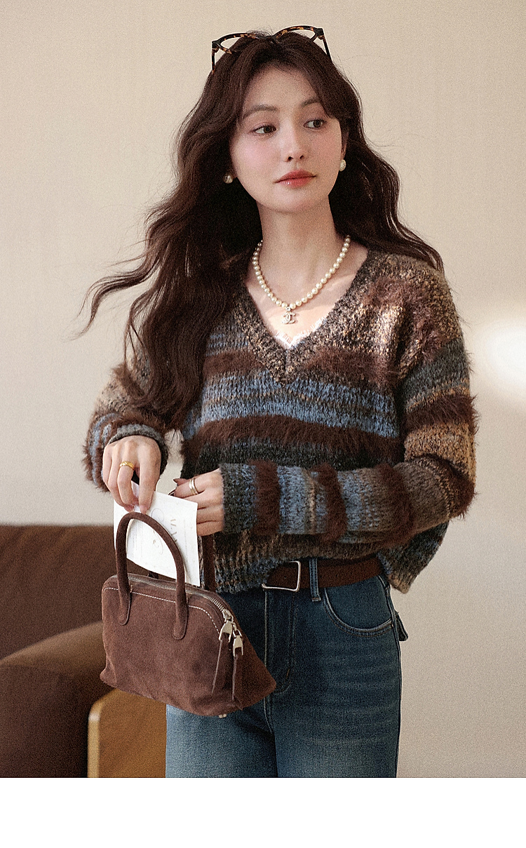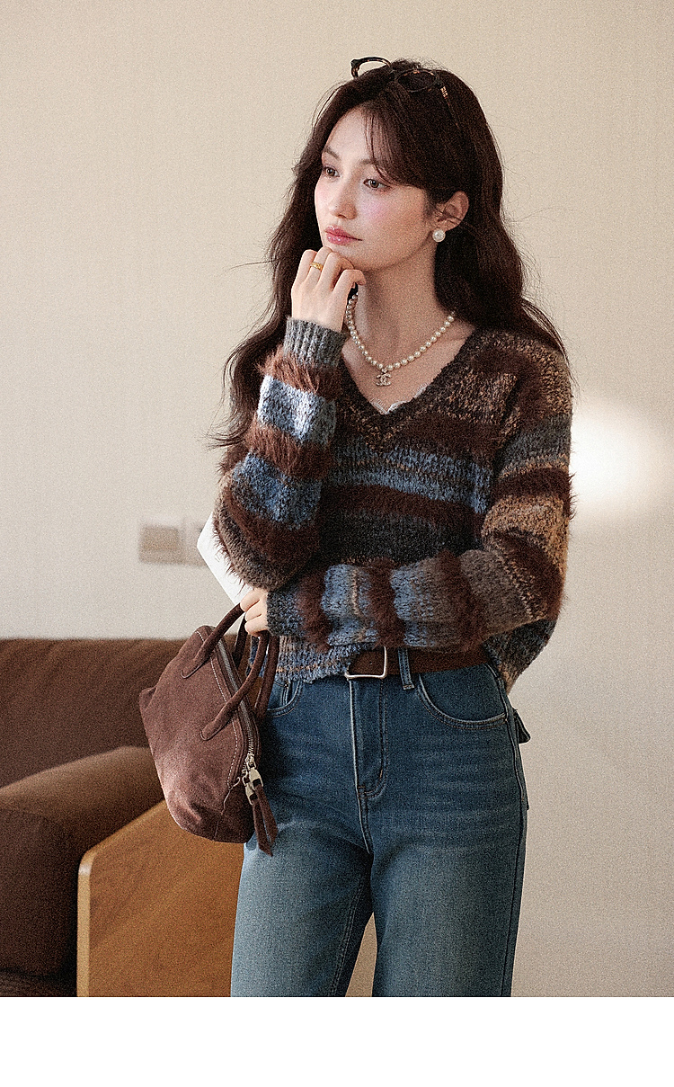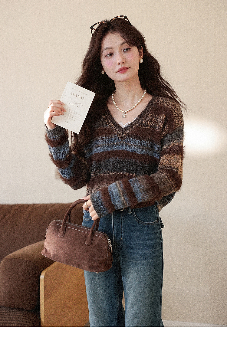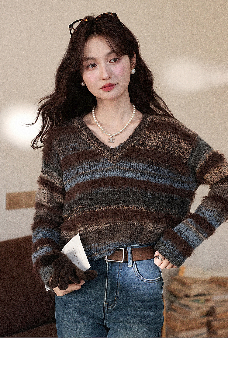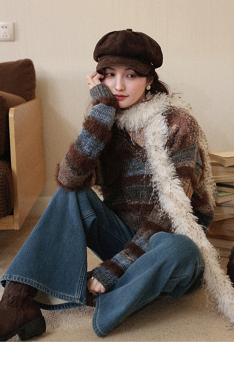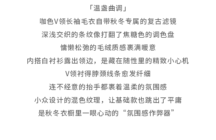 鹿向南「温盏曲调」复古咖色V领长袖毛衣女秋冬小众设计感针织衫