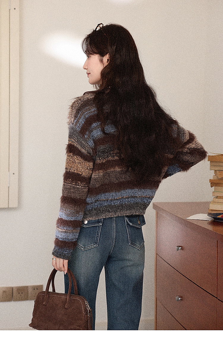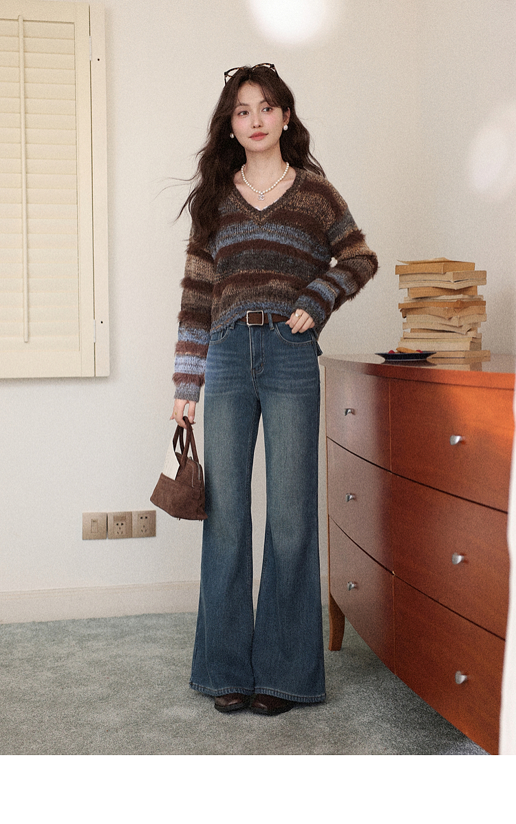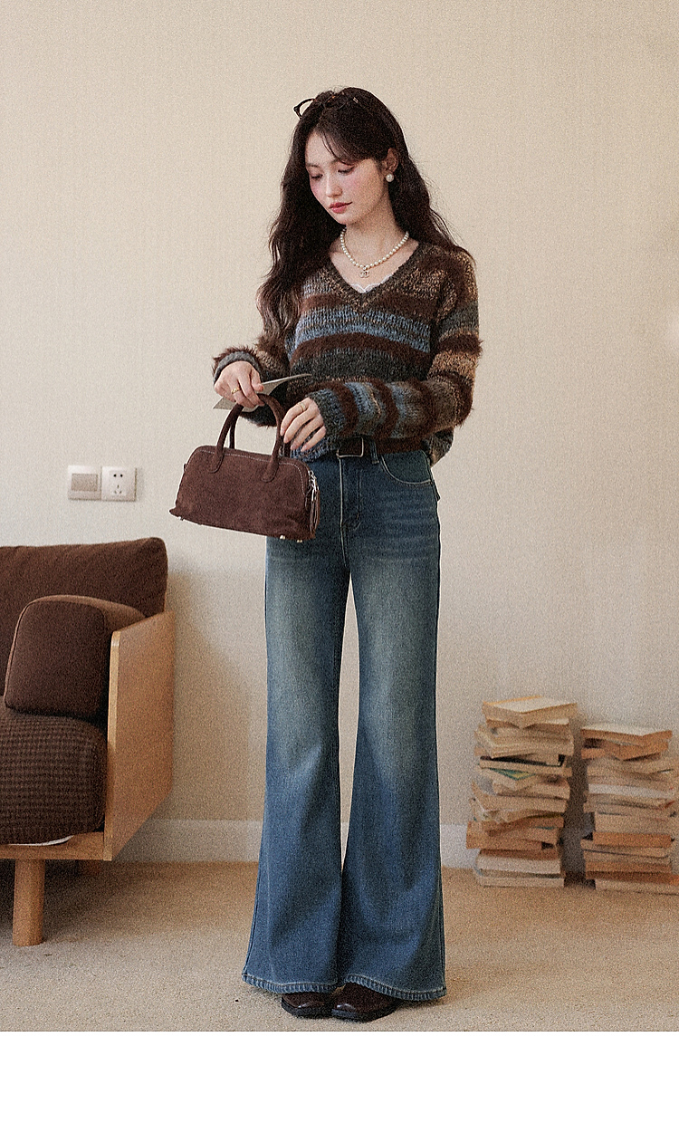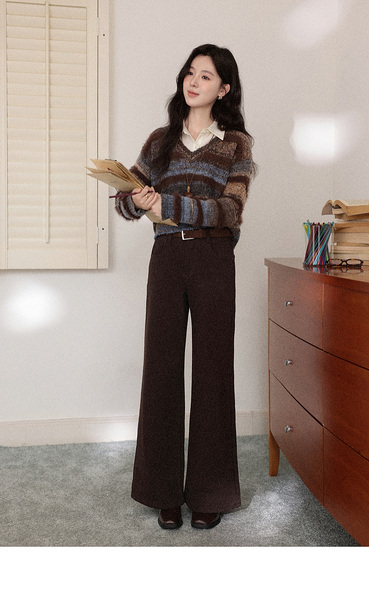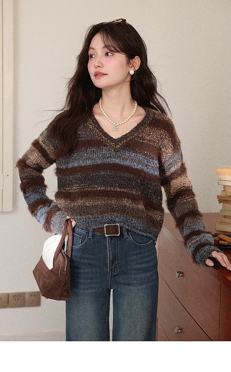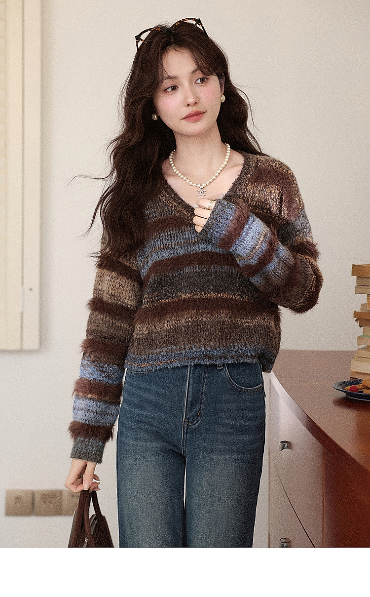 鹿向南「温盏曲调」复古咖色V领长袖毛衣女秋冬小众设计感针织衫