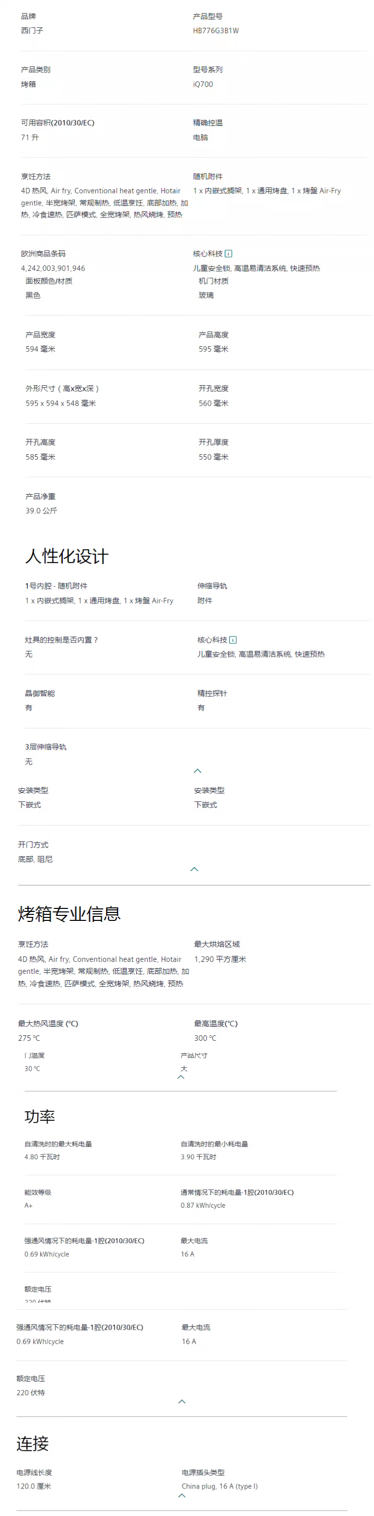 西门子/烤箱/HB776G3B1W/大容量电烤箱71L带探针IQ700新款 嵌入式烤箱 黑色