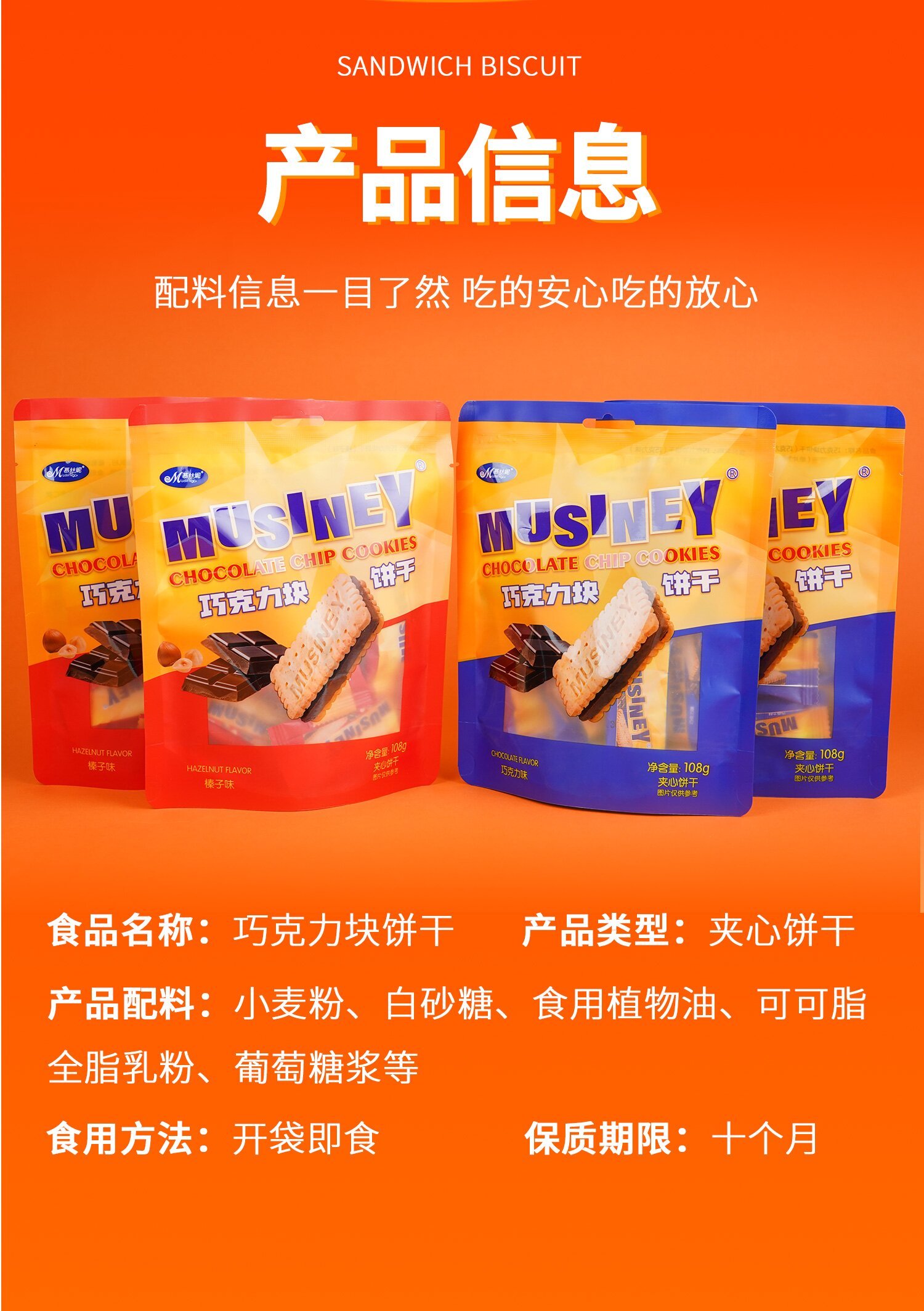 【品牌】慕丝妮 【品名】巧克力块饼干(巧克力味/榛子味) 【规格】3袋 (108g/袋) 【保质期】10个月 【发货地】广东汕头 【产地】广东汕头 【发货快递】圆通快递 【运费模板】新西不发,甘肃 宁夏 青海 内蒙+5,其他地区包邮 【售后标准】 1、产品破损、异物,退货退款。 2、口味问题不支持售后