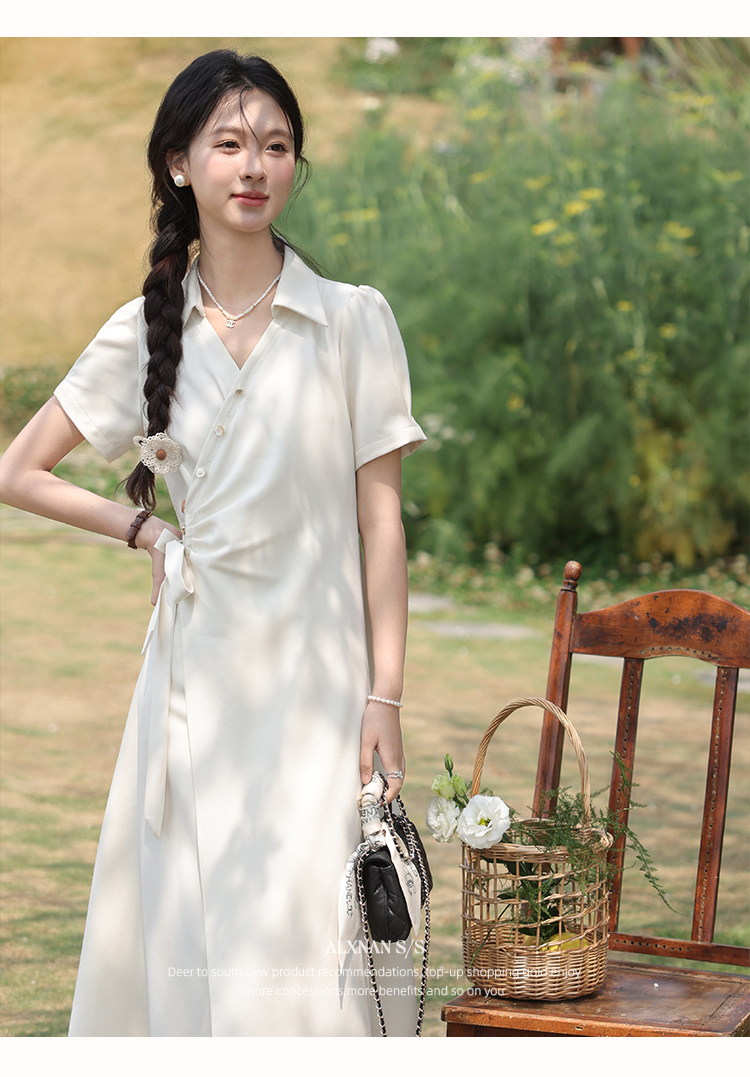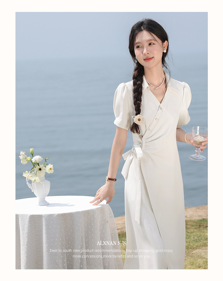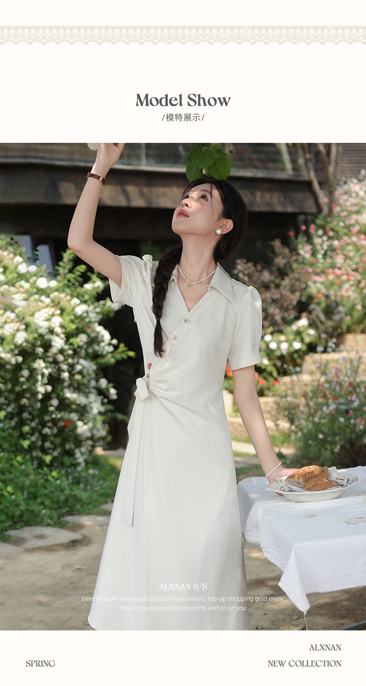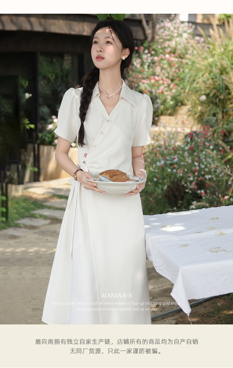【6折秒杀】鹿向南 「月光恋人」气质设计感杏色短袖连衣裙女夏A字翻领长裙