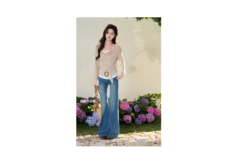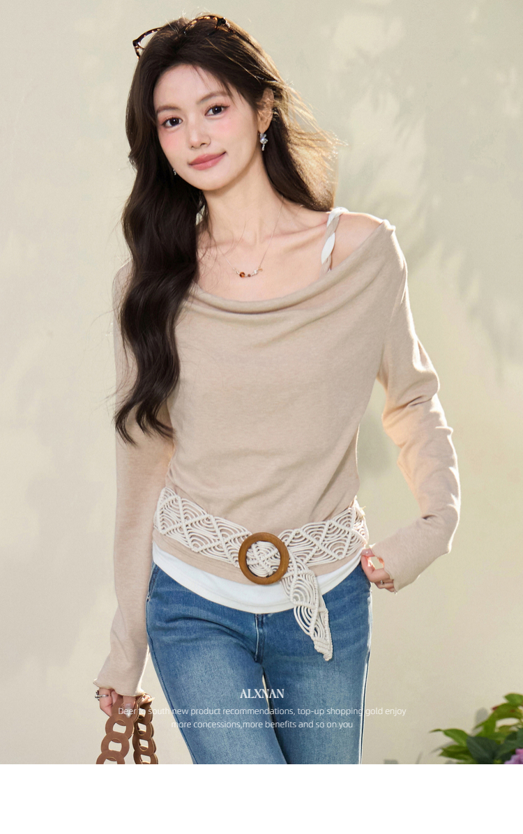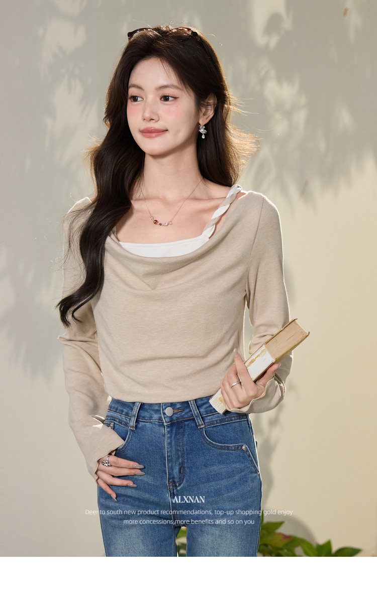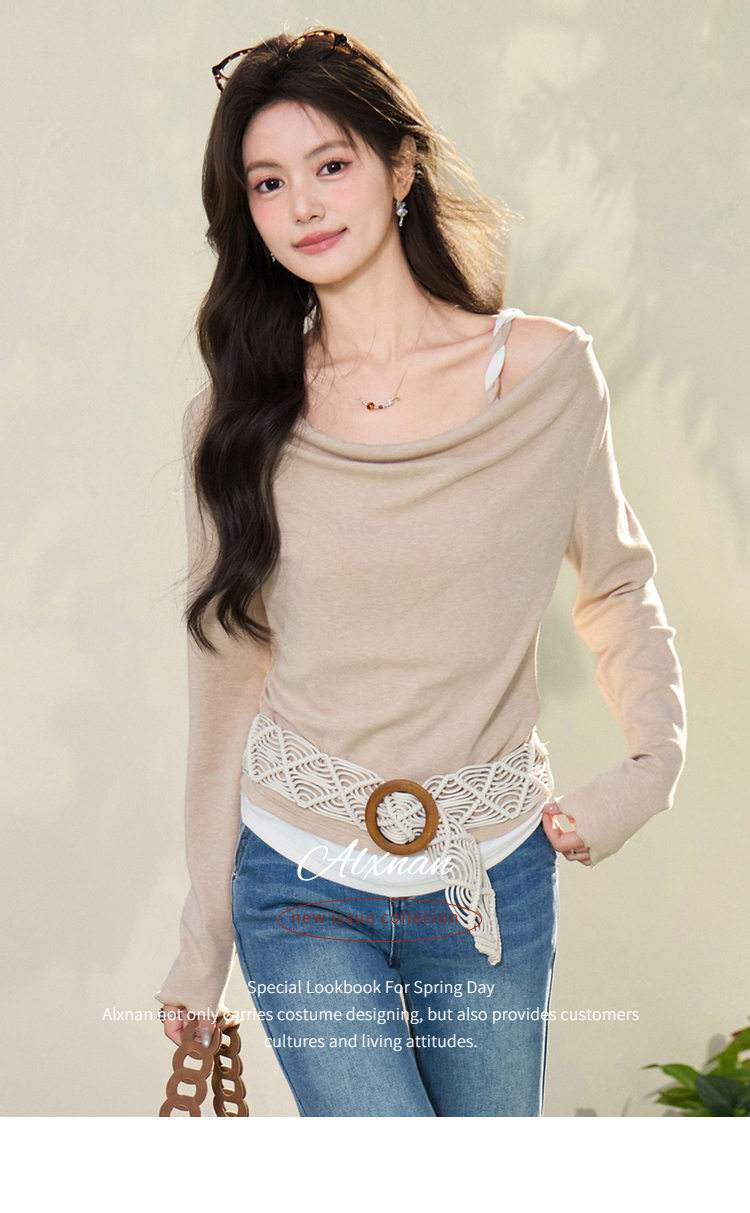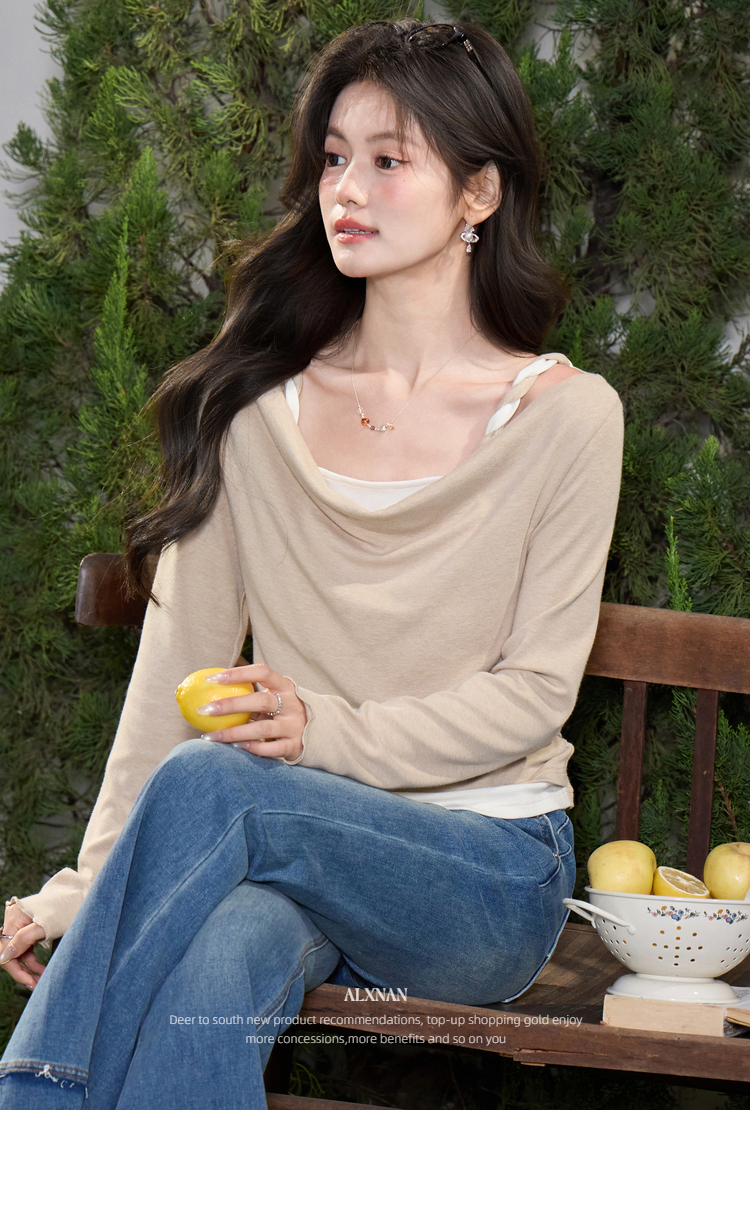 鹿向南「醒春集」不规则燕麦色荡领假两件T恤长袖显瘦女春季上衣