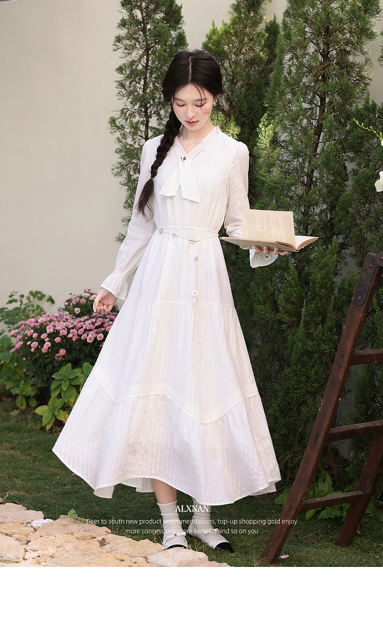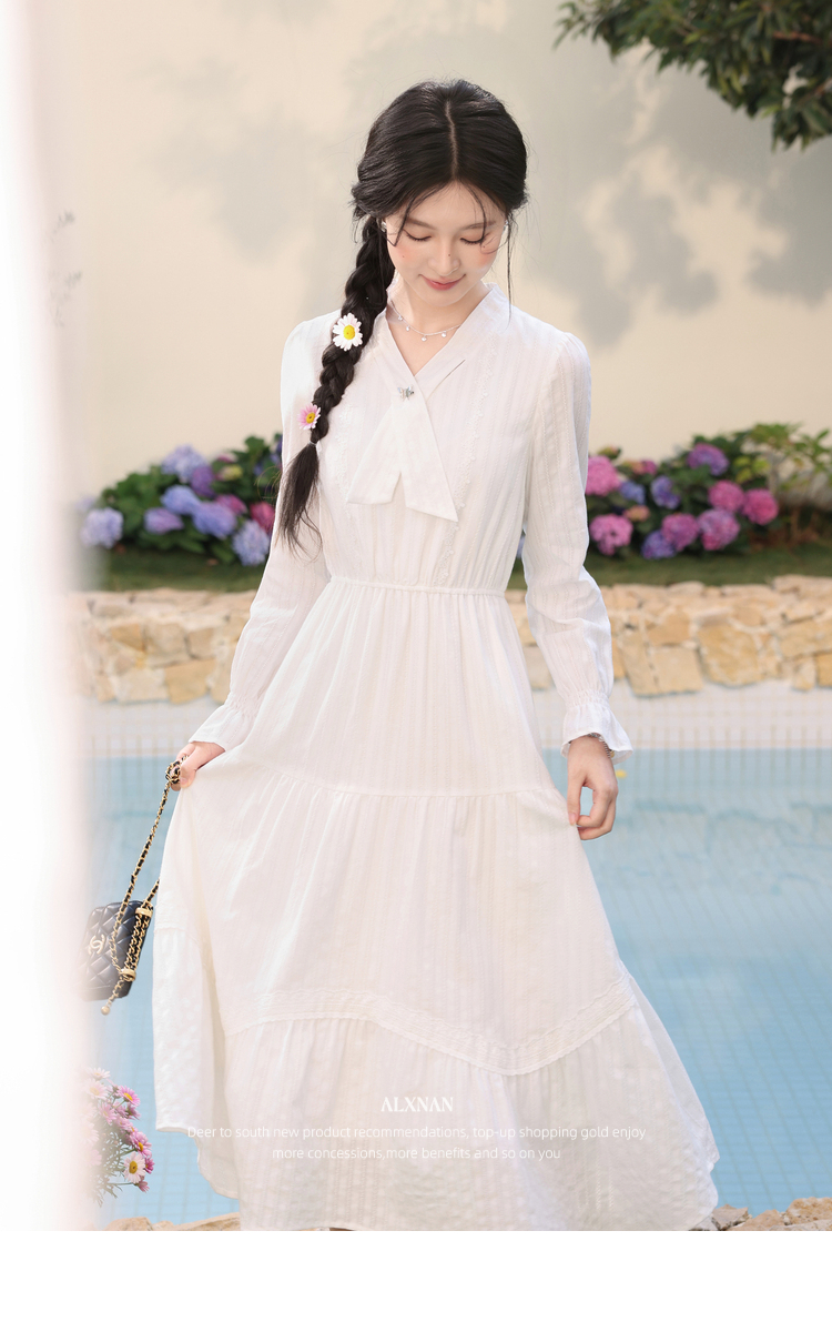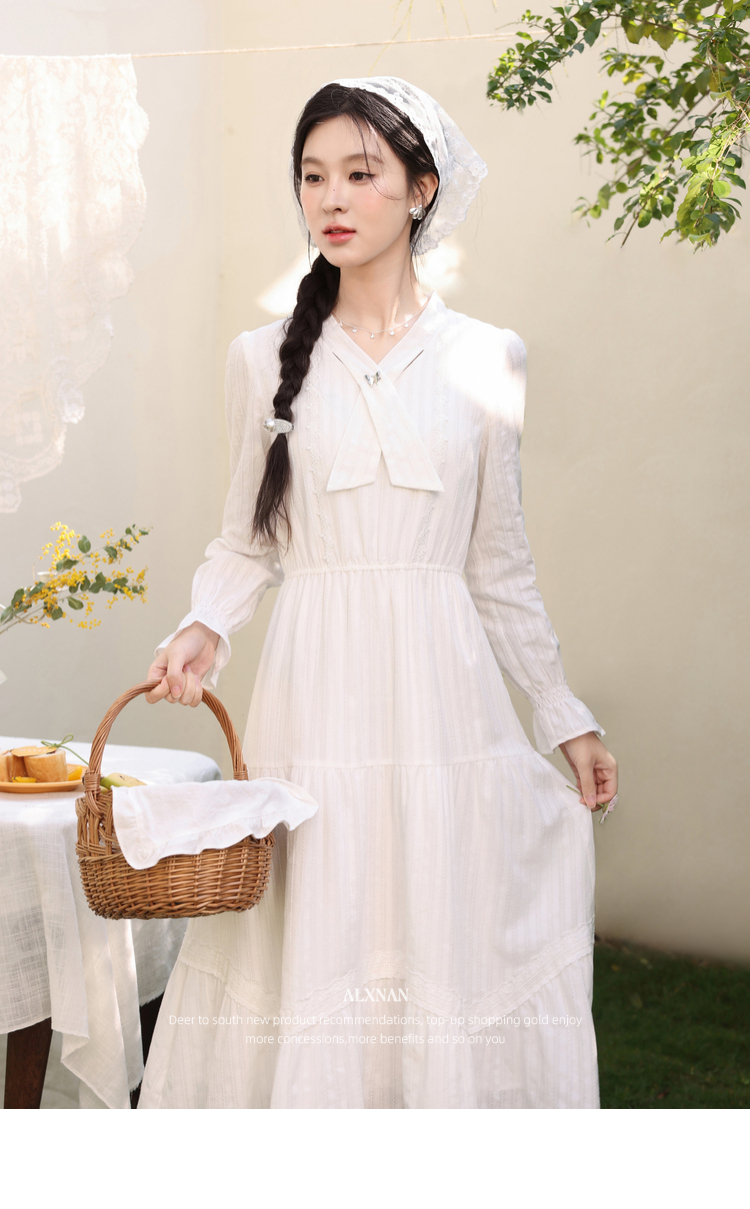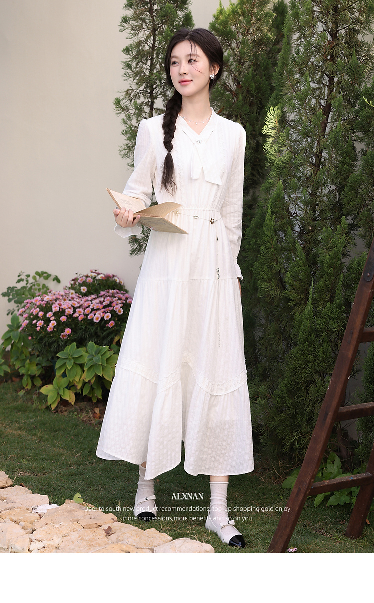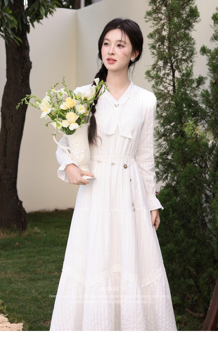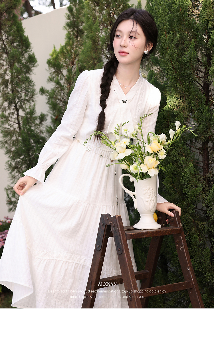 鹿向南「淡雅栀子」米白色长袖连衣裙春新款时尚高腰修身A字裙女
