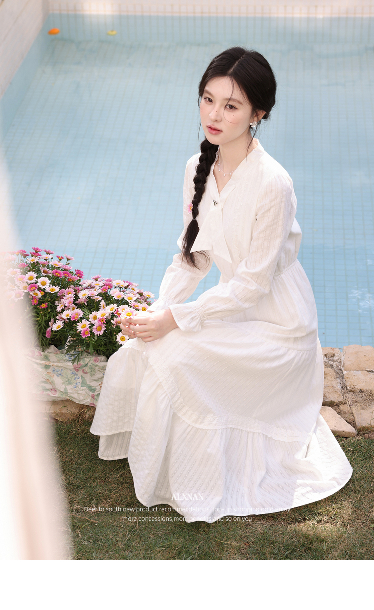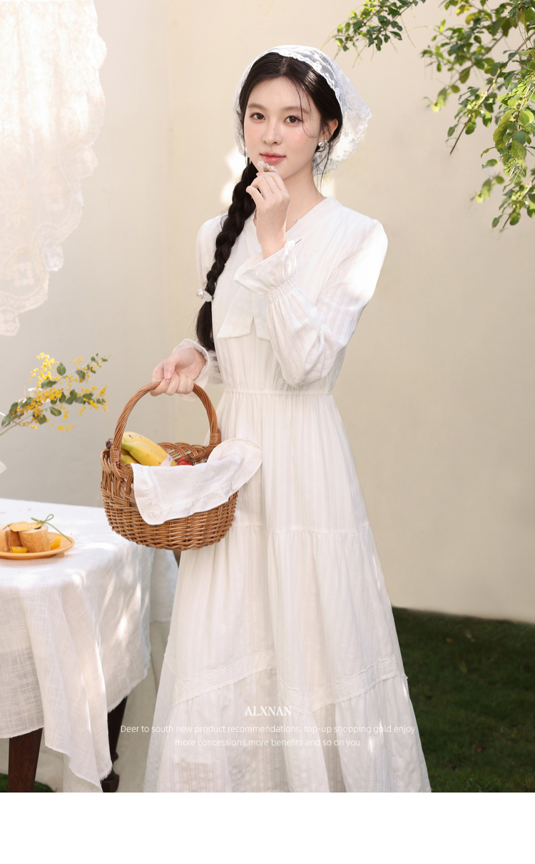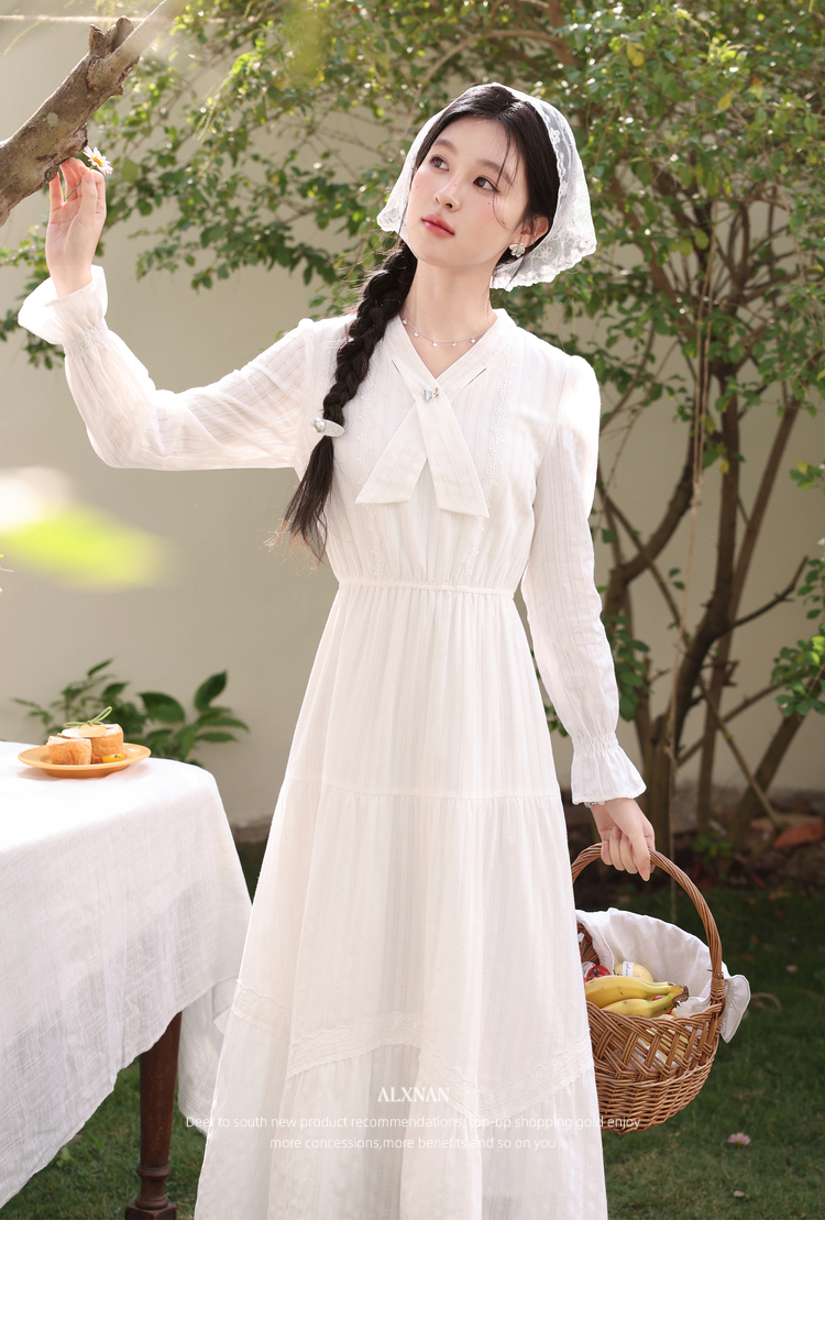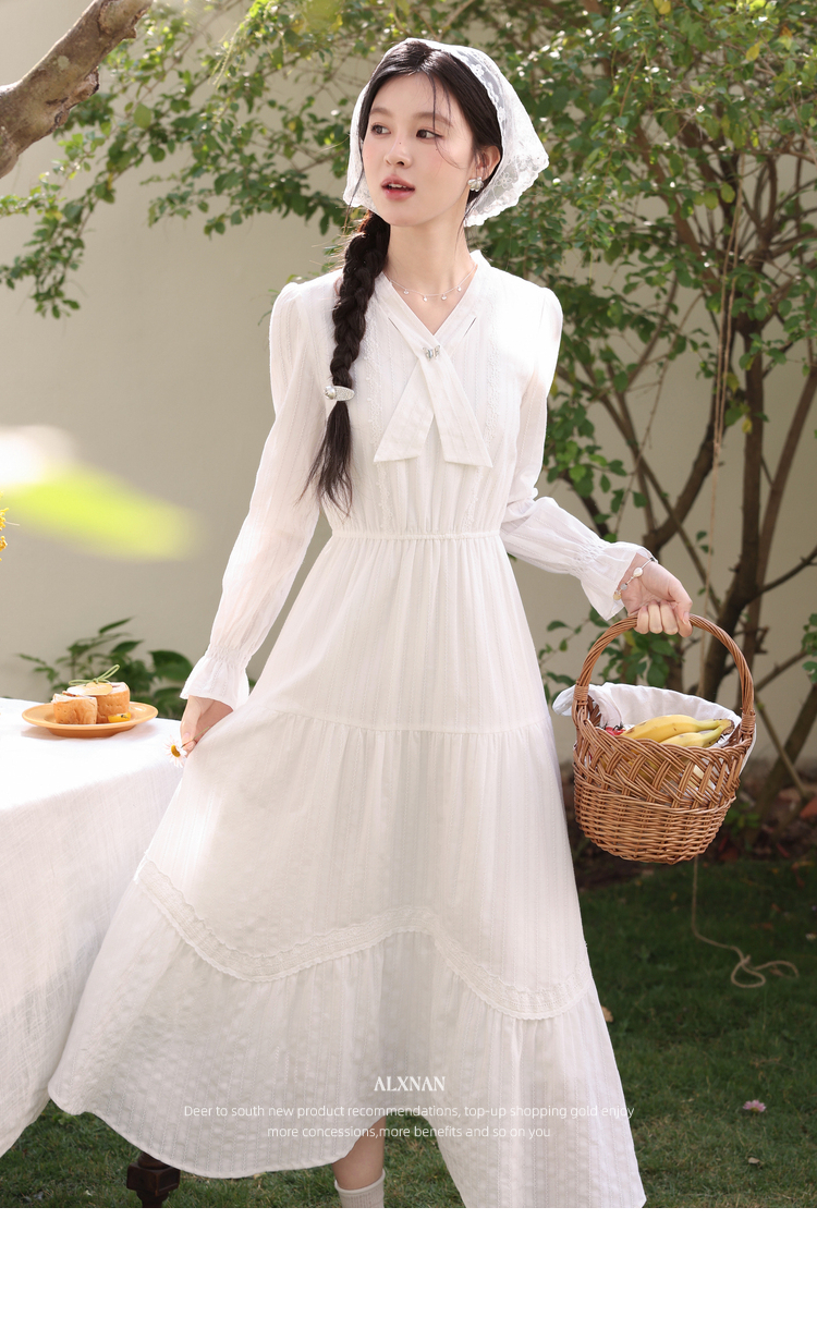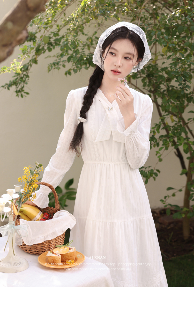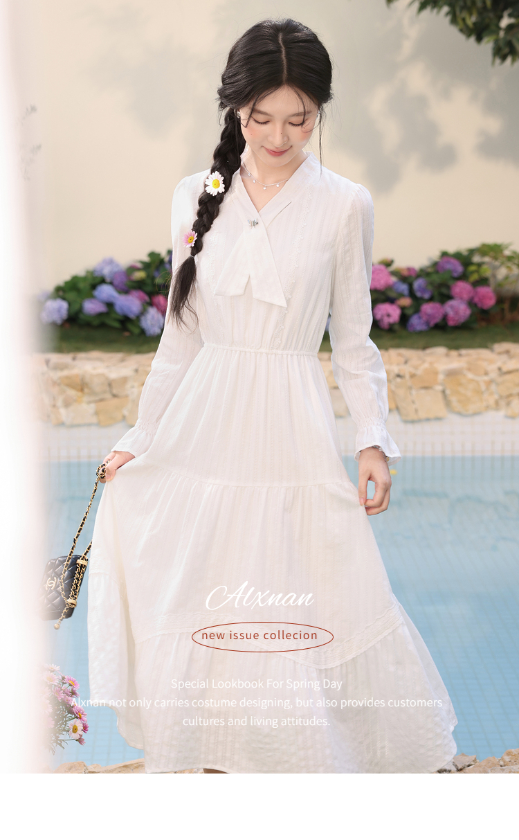 鹿向南「淡雅栀子」米白色长袖连衣裙春新款时尚高腰修身A字裙女