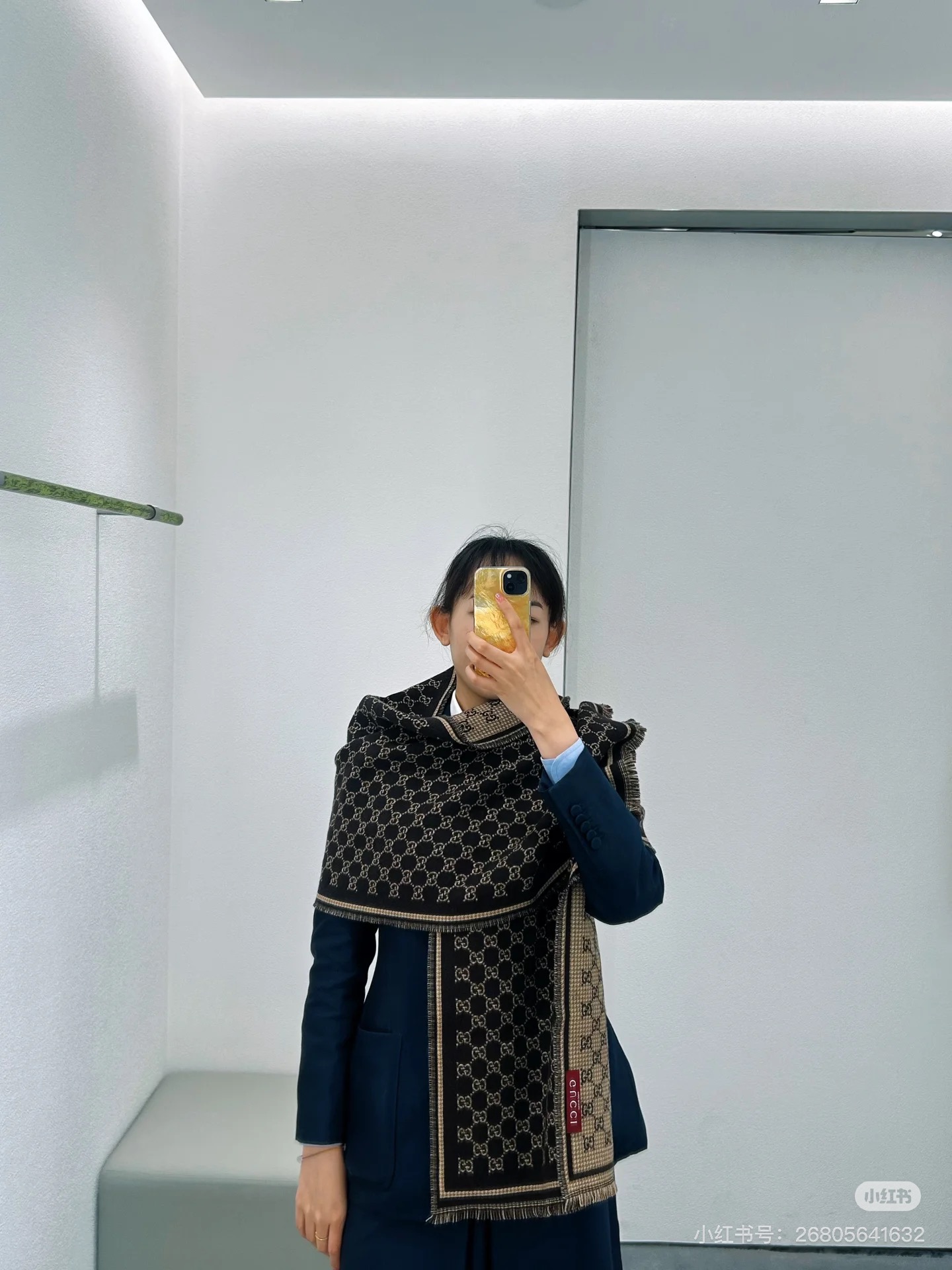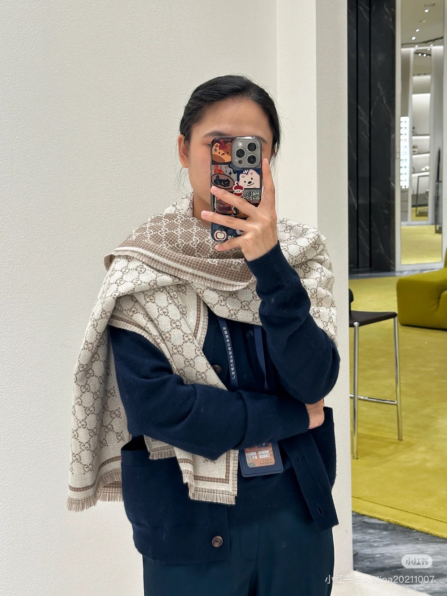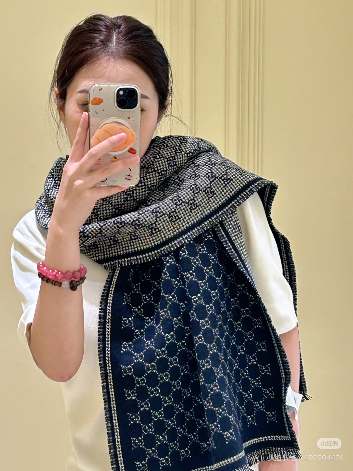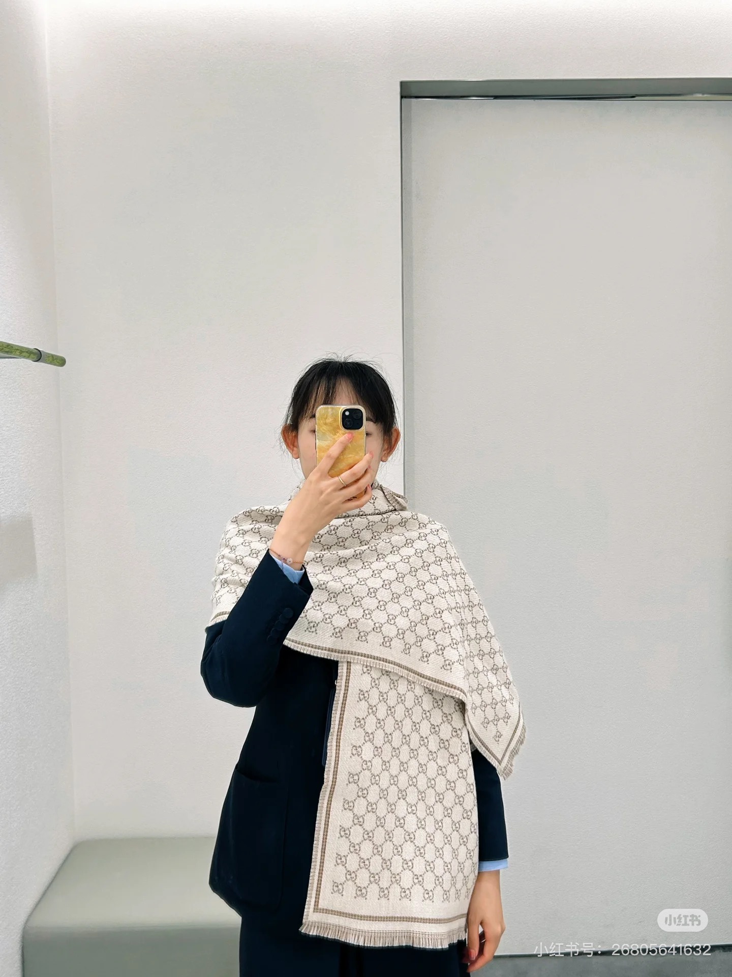 𝐆𝐔𝐂𝐂𝐈 新《GG羊毛围巾》 GG羊毛围巾2025早秋桑蚕丝软配饰系列以精致滚边、品牌标识贴饰和精美刺绣为品牌元素注入新鲜活力。这款围巾以GG羊毛面料匠心打造,巧妙缀饰流苏滚边。 商品细节 ·GG羊毛 ·流苏滚边 ·47厘米(宽)x180厘米(长)