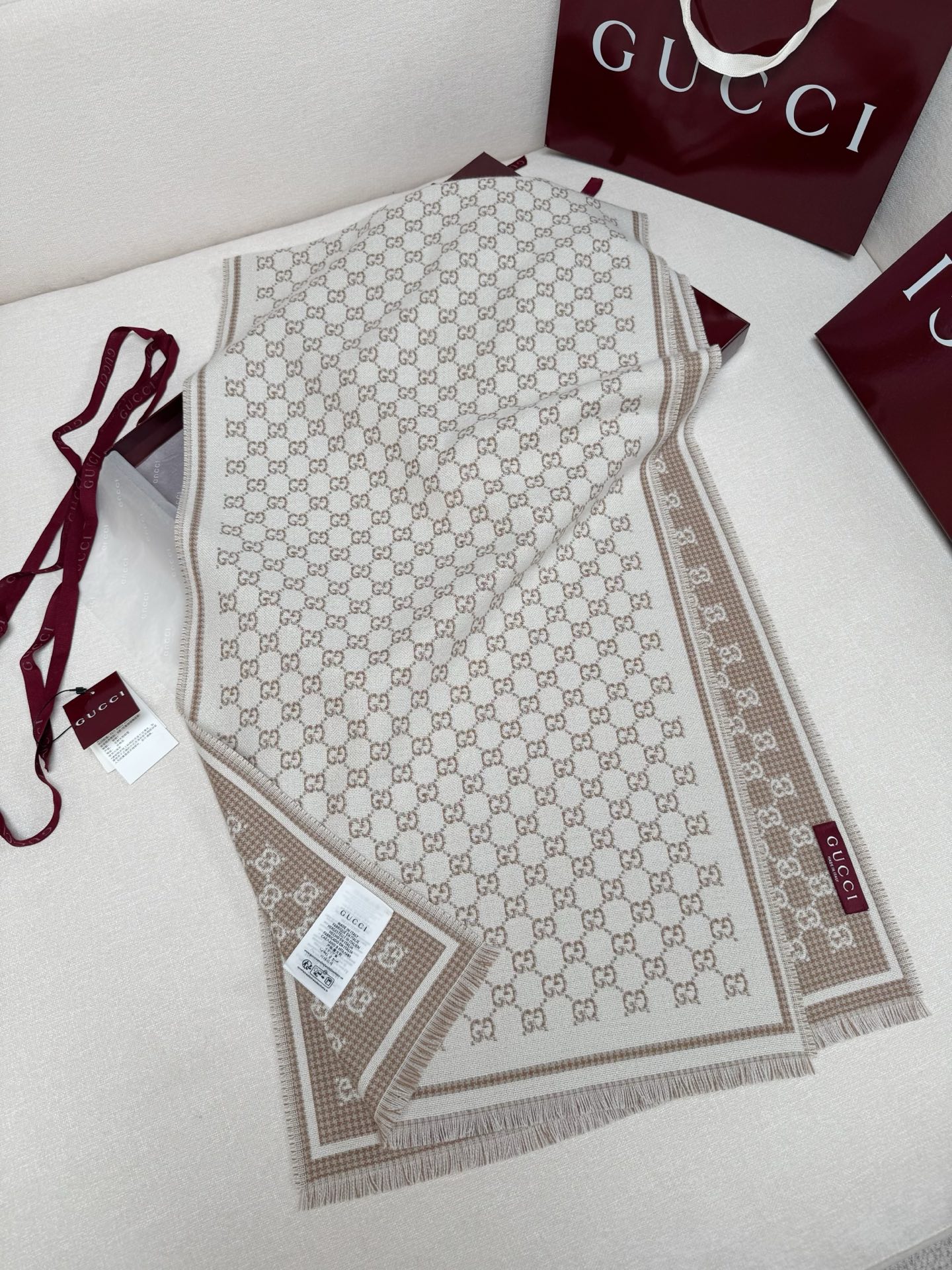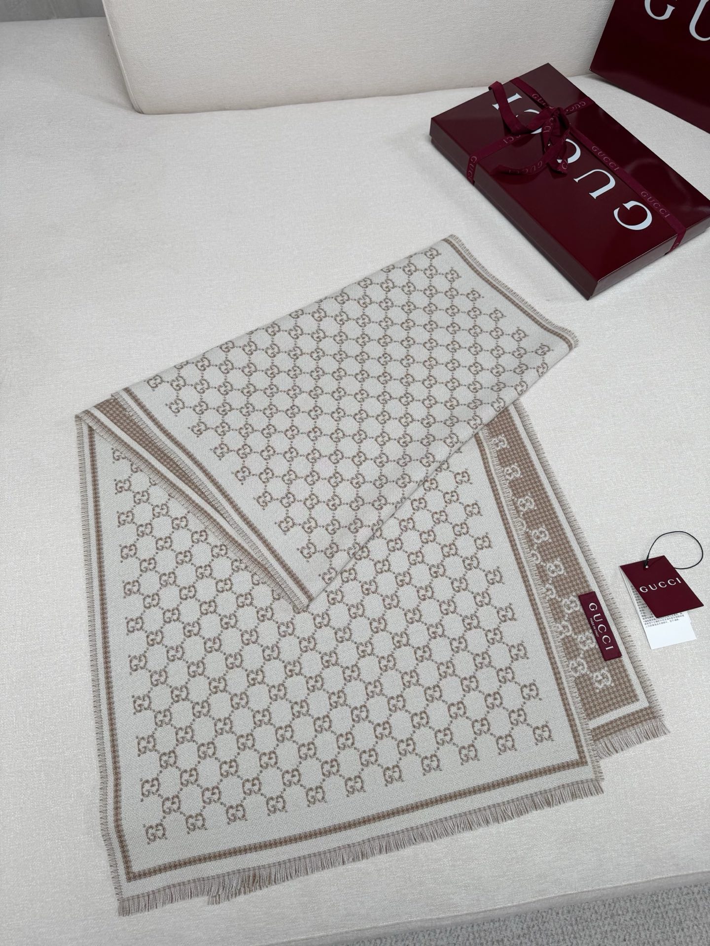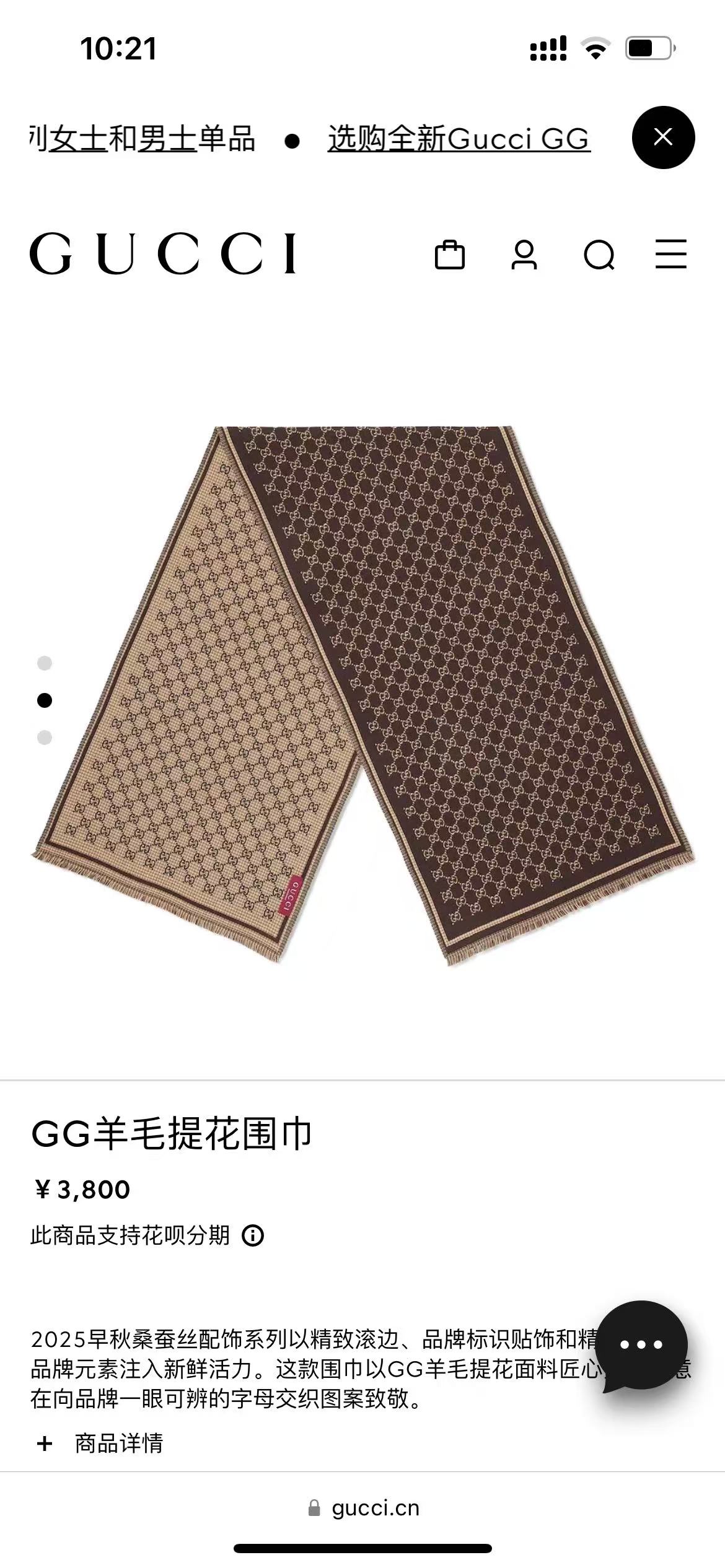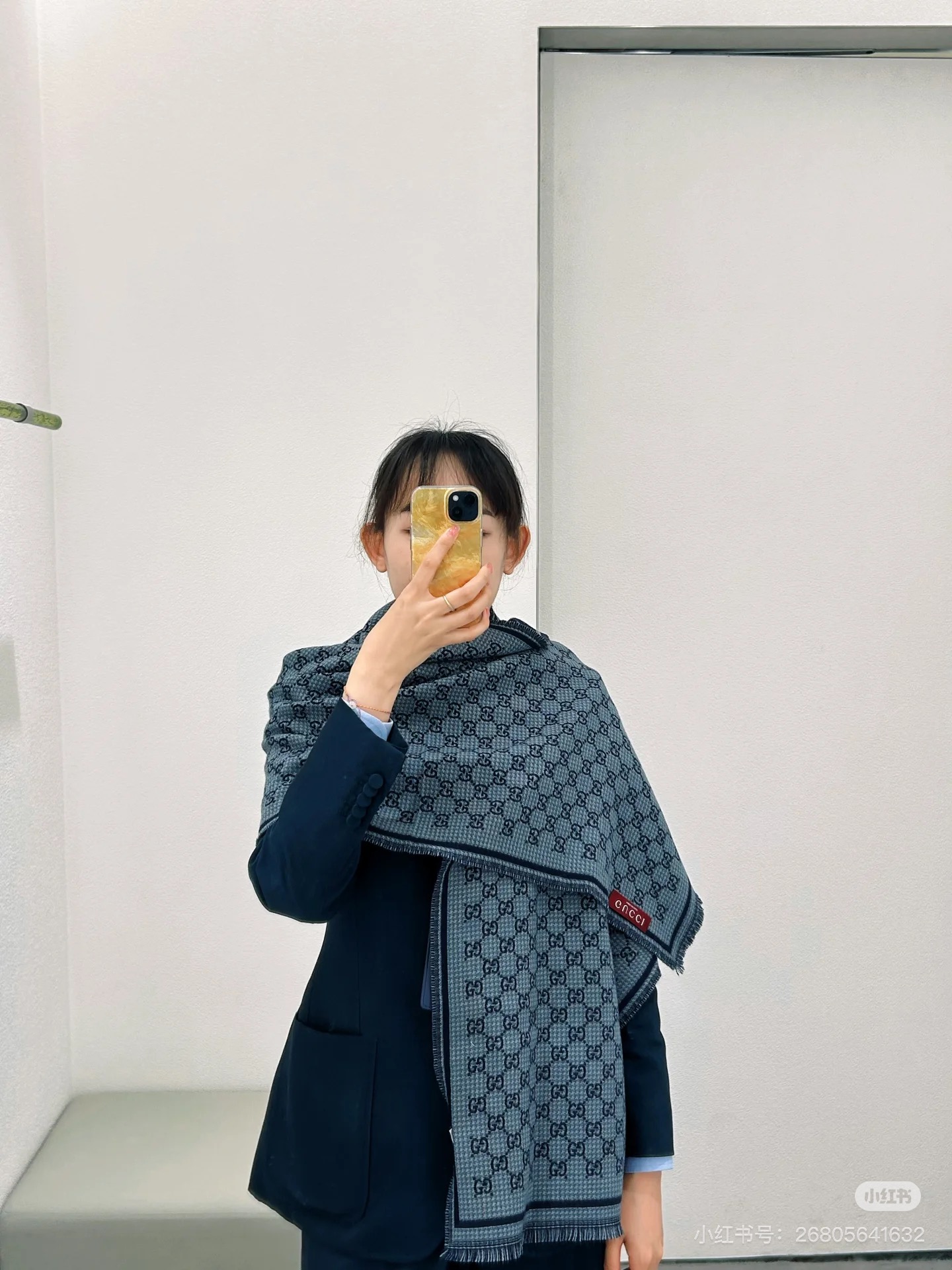 𝐆𝐔𝐂𝐂𝐈 新《GG羊毛围巾》 GG羊毛围巾2025早秋桑蚕丝软配饰系列以精致滚边、品牌标识贴饰和精美刺绣为品牌元素注入新鲜活力。这款围巾以GG羊毛面料匠心打造,巧妙缀饰流苏滚边。 商品细节 ·GG羊毛 ·流苏滚边 ·47厘米(宽)x180厘米(长)