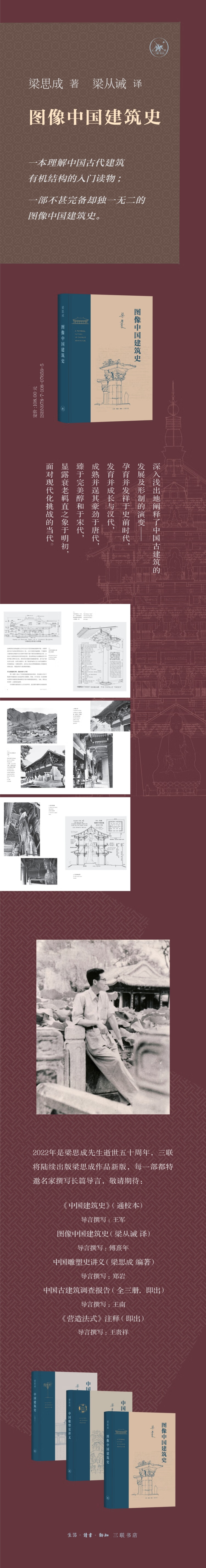 本书为中英文双语版,由梁思成之子——梁从诫先生——翻译成中文,从诫先生的名字即从《营造法式》的修撰者李诫而来。从诫先生虽然没有继承父业,但通过《图像中国建筑史》的中译,也与父亲一道,为推动中国古建筑的研究与传承做出了贡献。