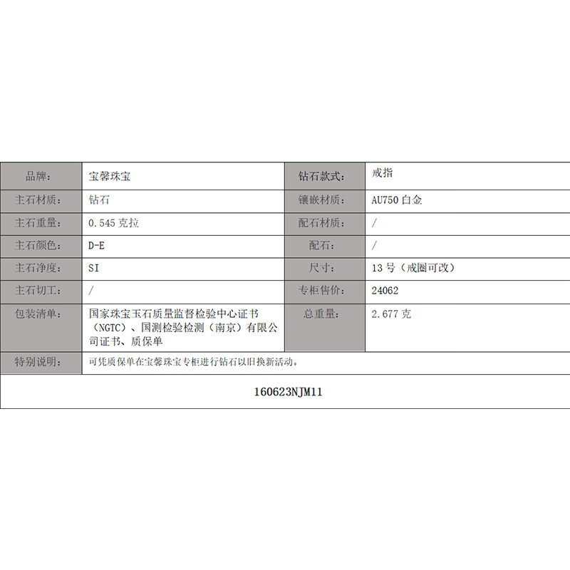 【天然正品】宝馨珠宝 0.545克拉钻石 戒指 钻戒 钻石戒指 13号160623NJM11