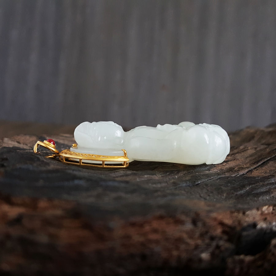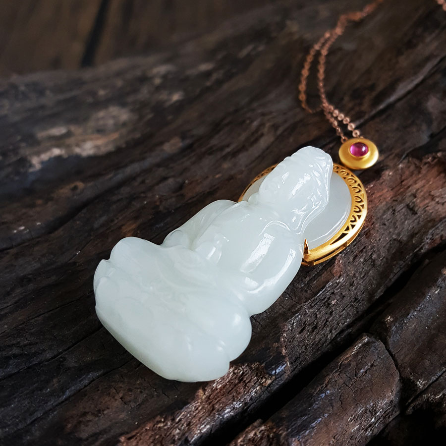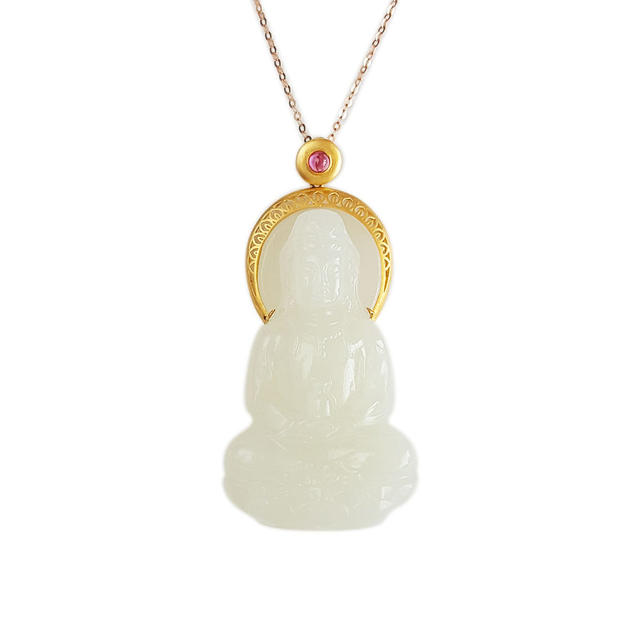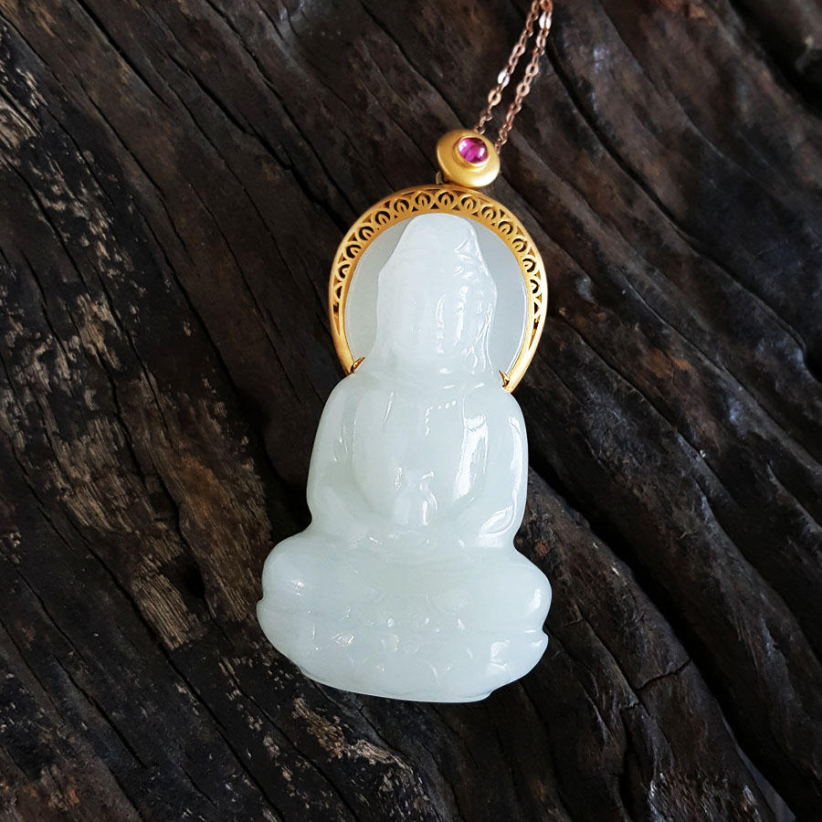 名称 | AU750黄金镶天然细腻青海料一级白油润度佳观音坐莲(平安安乐)和田玉吊坠项链 |