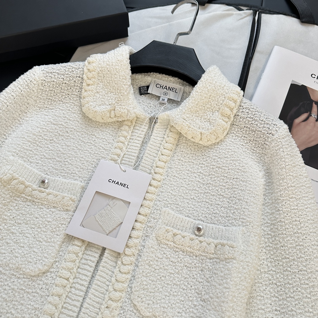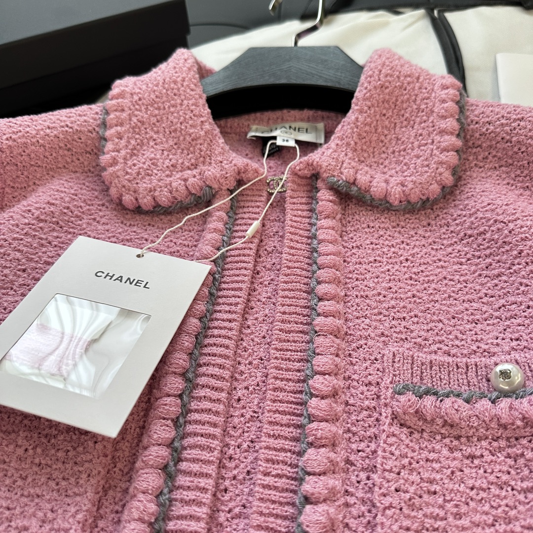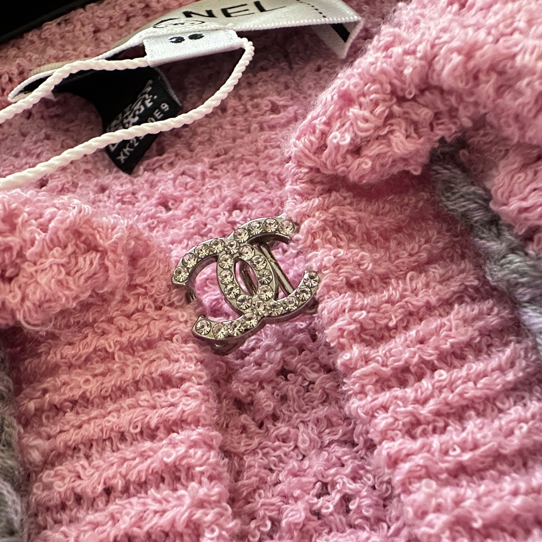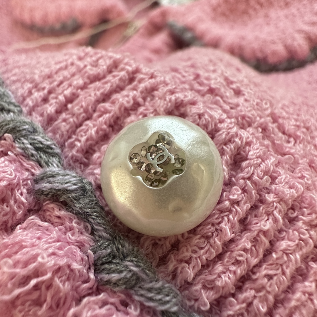 翻领拼接灰色编织珍珠,浮雕工艺精致到发丝,门禁处钻标金属双C抓扣,开合间满是奢华感。口袋珍珠上藏着mini双C标志,精致感拉满!领内侧和下摆里层的绗缝立体边工艺,满满的细节彰显品质