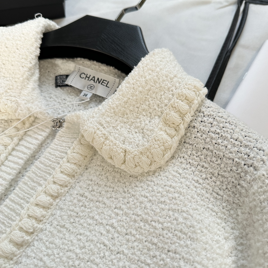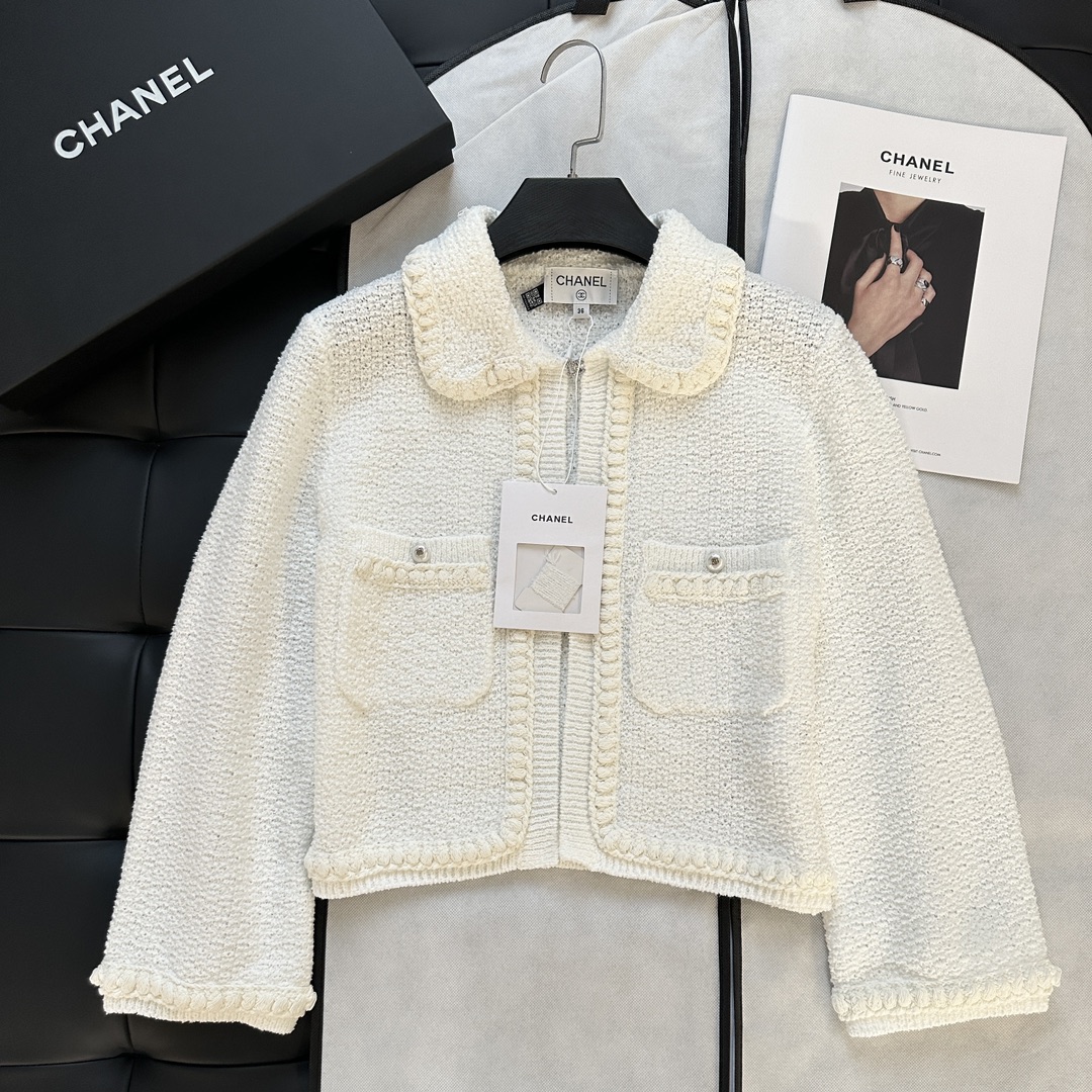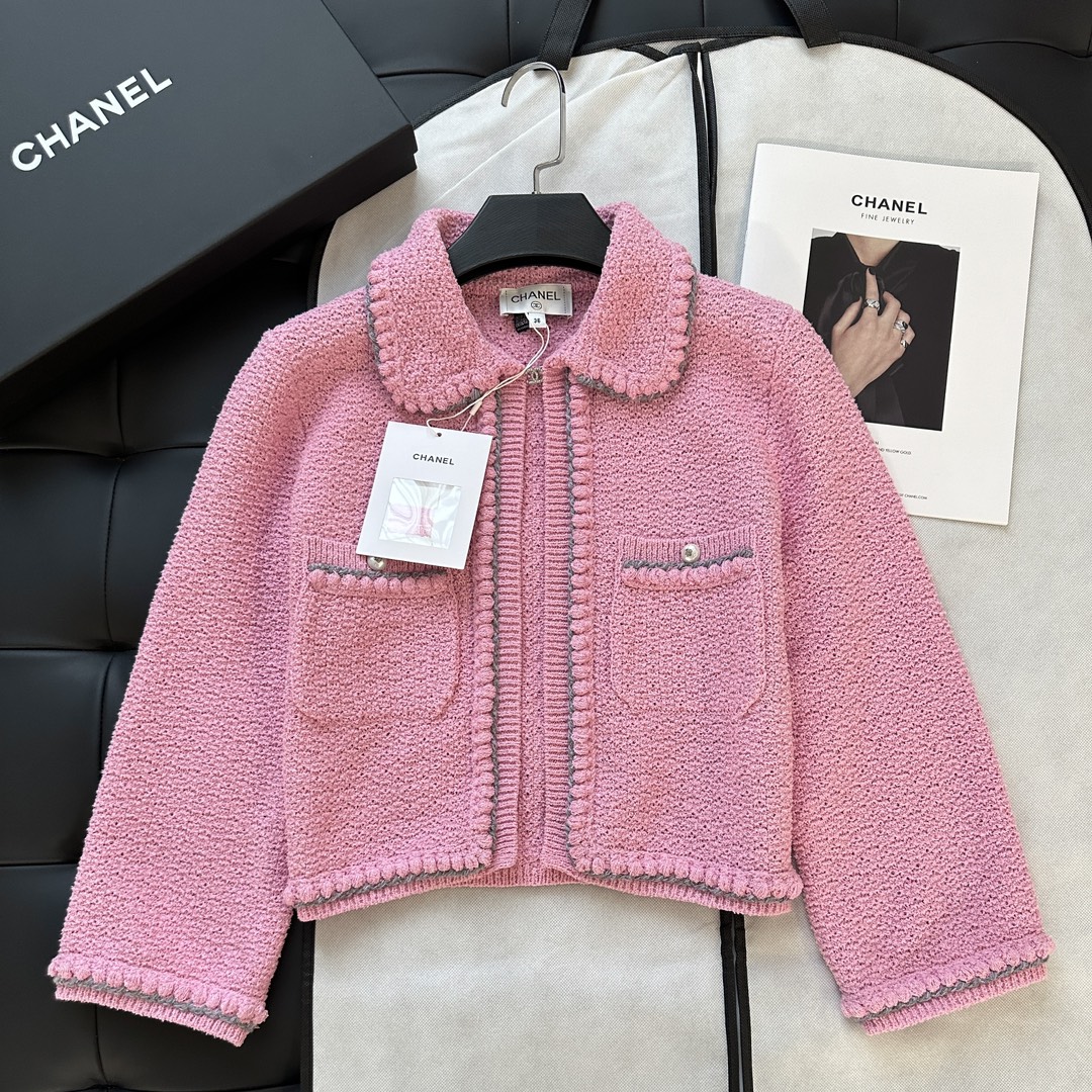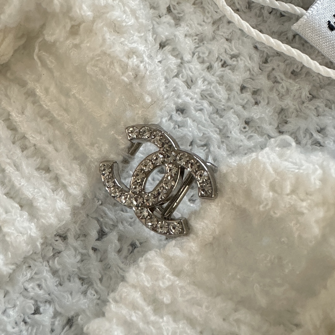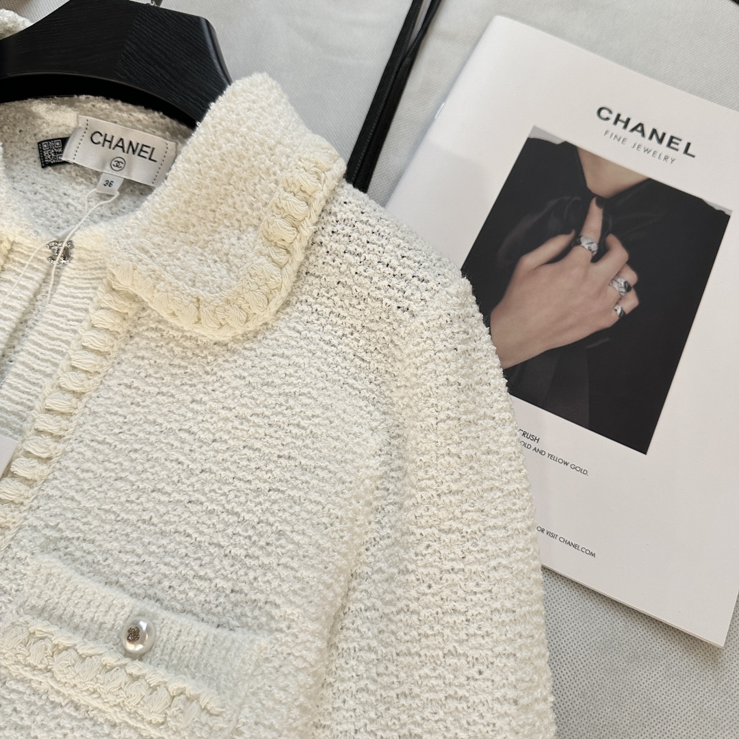 翻领拼接灰色编织珍珠,浮雕工艺精致到发丝,门禁处钻标金属双C抓扣,开合间满是奢华感。口袋珍珠上藏着mini双C标志,精致感拉满!领内侧和下摆里层的绗缝立体边工艺,满满的细节彰显品质