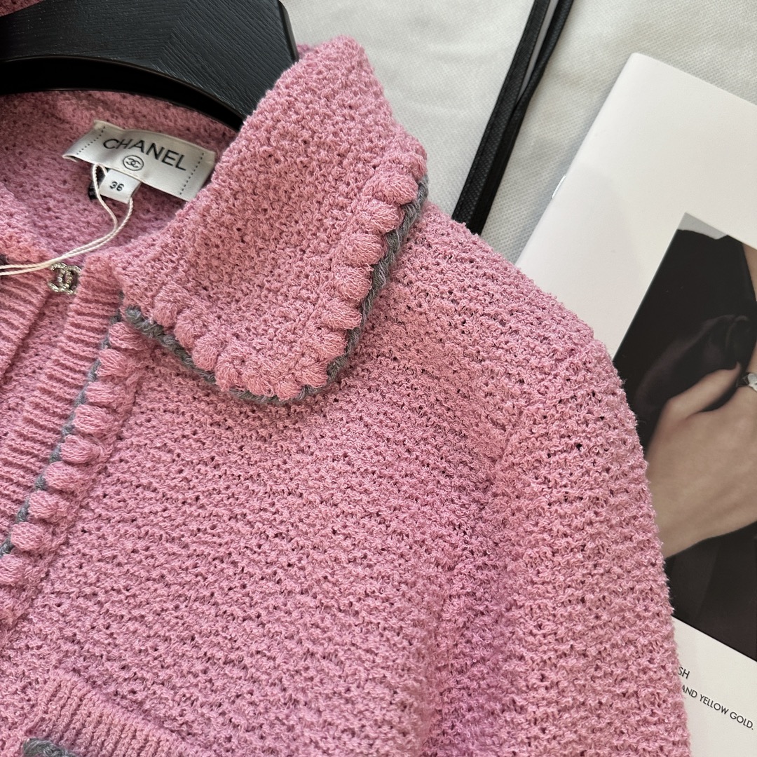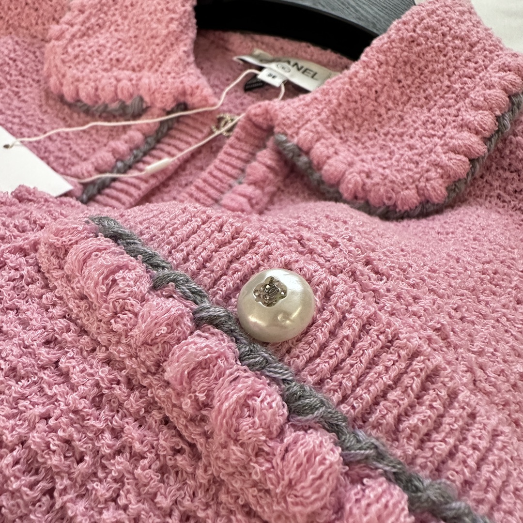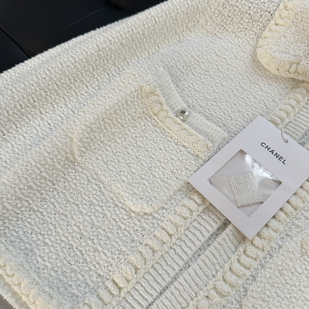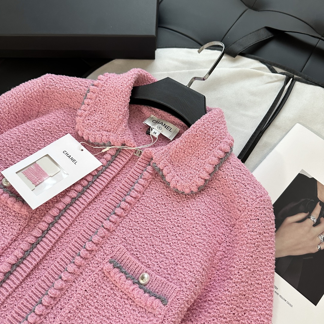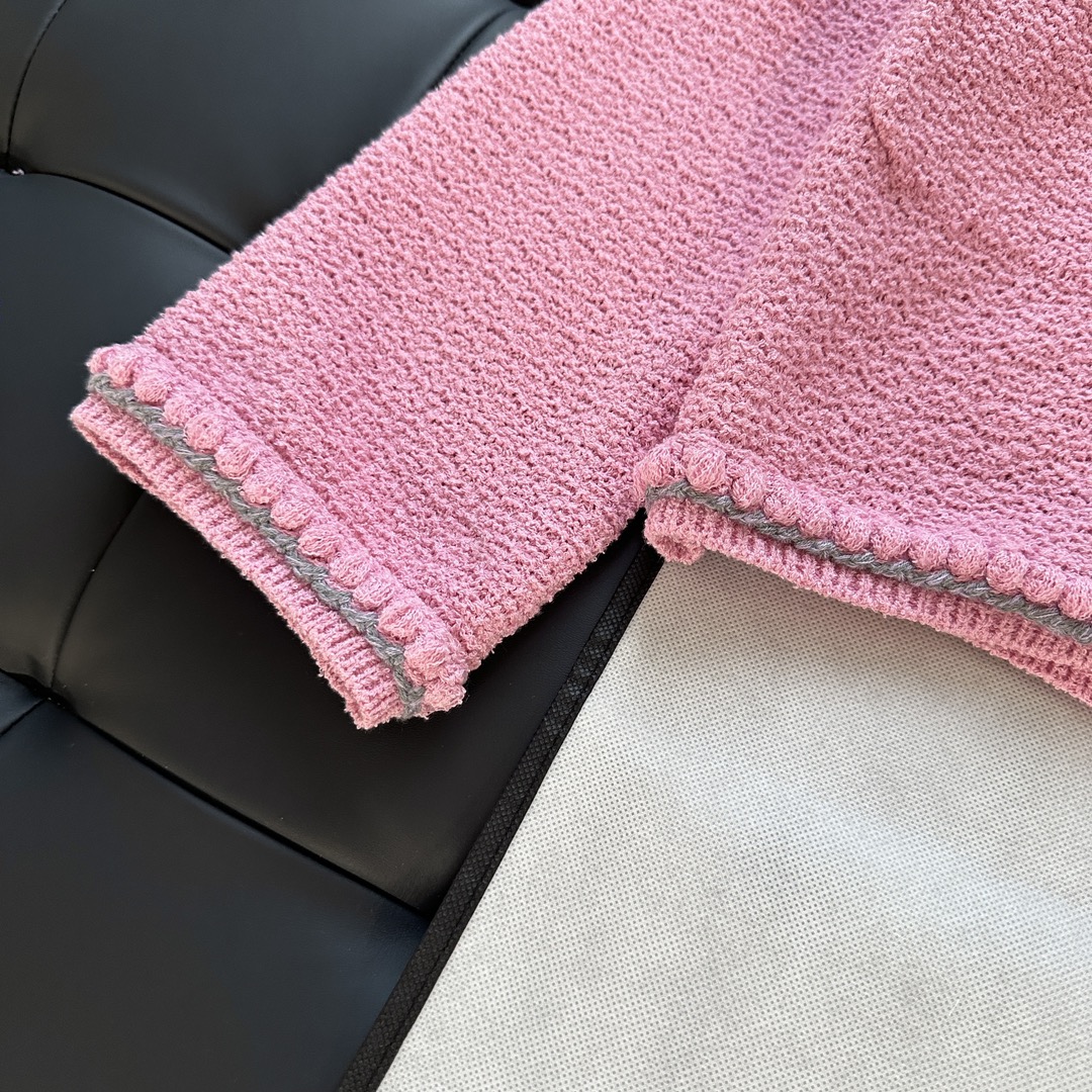 整件衣服领边、袖口、门襟、口袋、下摆全部都是纯手工编织 ,细节经得起放大镜检验。就拿颜色来说,白色手工边部分和大身用不同纱线制作,而粉色则是一种纱线,这细微差别,彰显品质高低。而且我们的白色在室内室外呈现不同颜色,这可是小香独有的特色,和那些室内室外同色的现成纱线一对比,高下立判!