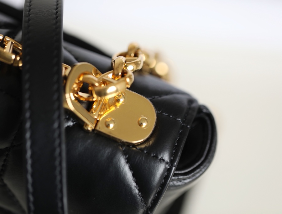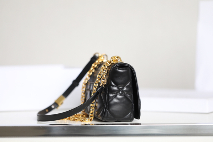 Dior Caro 手袋结合典雅气质与现代风范。采用白牛皮革精心制作,搭配原创的绗缝效果超大藤格纹缉面线,别具一格。翻盖饰以金属覆层旋钮式“CD”扣环,灵感源自 Christian Dior 香水瓶的封口。小号款式,搭配可拆卸的“CD”标志链条肩带,可手提或肩背,亦可替换成 Dior 的刺绣宽肩带,点缀日常造型或为晚装亮丽点睛。