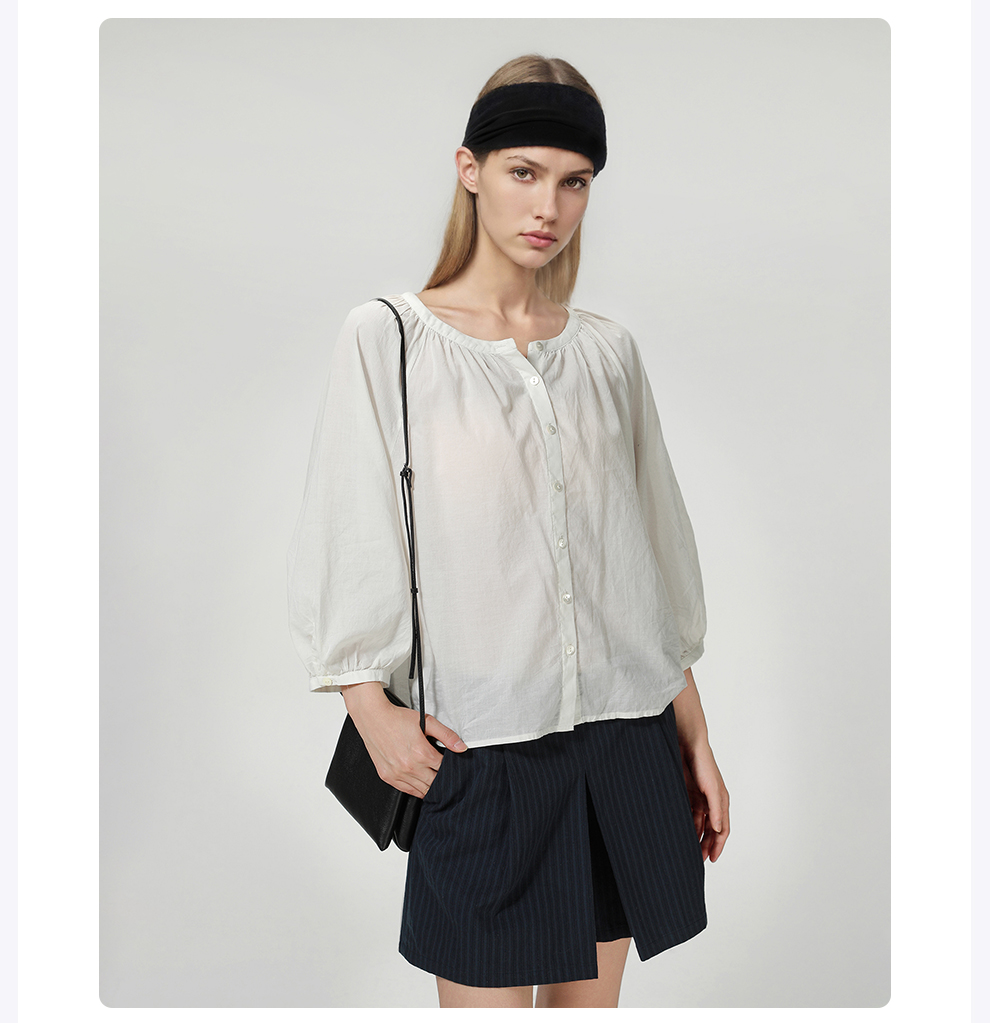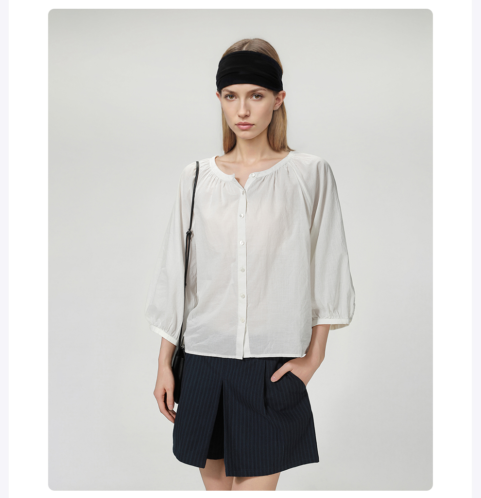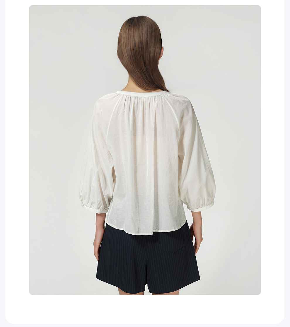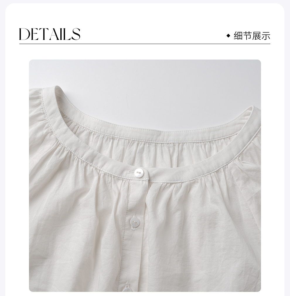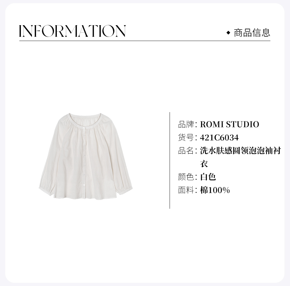 ROMI STUDIO“棉的印迹”100超纤棉洗水肤感圆领泡泡袖衬衣421C6034