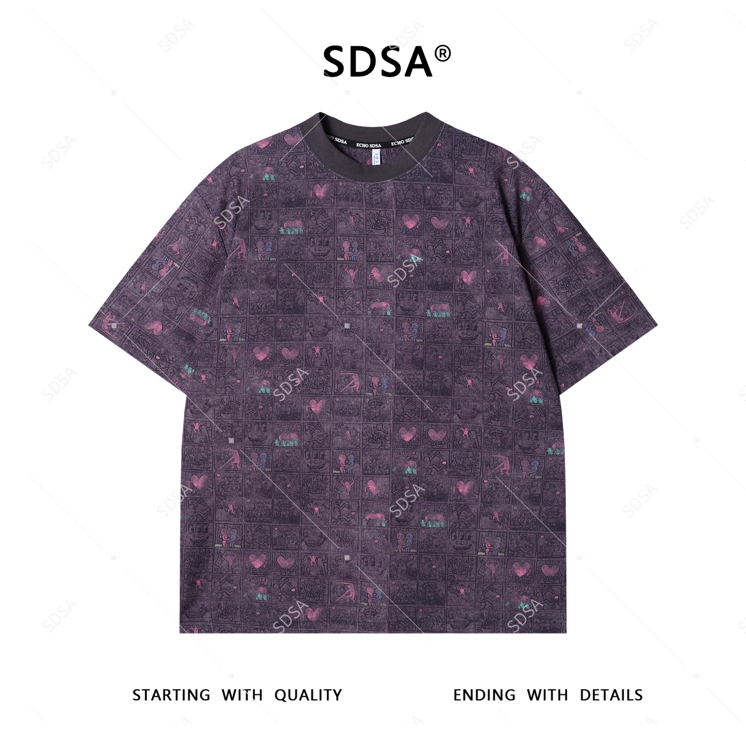 T4030夏季高级感新款男士美式格纹图案爱心印花短袖T恤百搭圆领上衣
