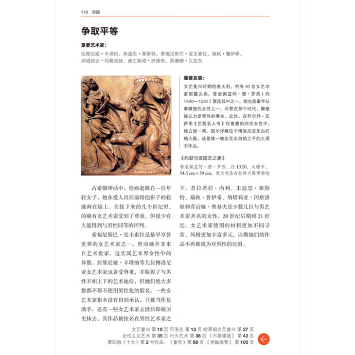 争取平等 重要艺术家: 拉维尼娅·丰塔纳、朱迪思·莱斯特、索福尼斯巴·安圭索拉、瑞秋·鲁伊希、 纳塔莉亚·冈察洛娃、奥古斯塔·萨维奇、苏珊娜·瓦拉东 古希腊神话中,绘画起源自一位年轻女子,她在爱人出征前将他影子的轮廓画在墙上。在接下来的几个世纪里,的确有女艺术家受到了尊重,但很少有人能得到与男性同等的评判。 索福尼斯巴·安圭索拉是最早享誉世界的女艺术家之一,然而她并非来自艺术世家,这实属艺术界女性中的异数。拉维尼娅·丰塔纳等几位博洛尼亚女艺术家也备受尊重,并取得了与男性不相上下的艺术地位,但她们绝大多数都不得不使用男性化的假名。一些女艺术家根本没有得到承认,只被当作是助手,还有一些女艺术家去世后即被历史抹去,其作品被挂名在男性艺术家之下。普拉蒂拉·内利、朱迪思·莱斯特、瑞秋·鲁伊希、纳塔莉亚·冈察洛娃和乔治娅·奥基夫是少数几位与男艺术家齐名的女性。20 世纪后期到 21 世纪,女艺术家使用的材料更加不同寻常、风格更加丰富多元,以期她们的作品不再被视为对男性的比附。 重要发展: 文艺复兴时期的意大利,约有 40 名女艺术家崭露头角,普洛佩兹阿·德·罗西(约1490—1530)便是其中之一。她也是最早从事雕塑的女性之一,尽管在那个时代,雕塑被认为是男性的事业。此外,在乔尔乔·瓦萨里《艺苑名人传》仅着墨的四位女性中,她占据一席。图示浮雕位于博洛尼亚圣白托略大殿,这是唯一被坐实出自她之手的大理石作品。