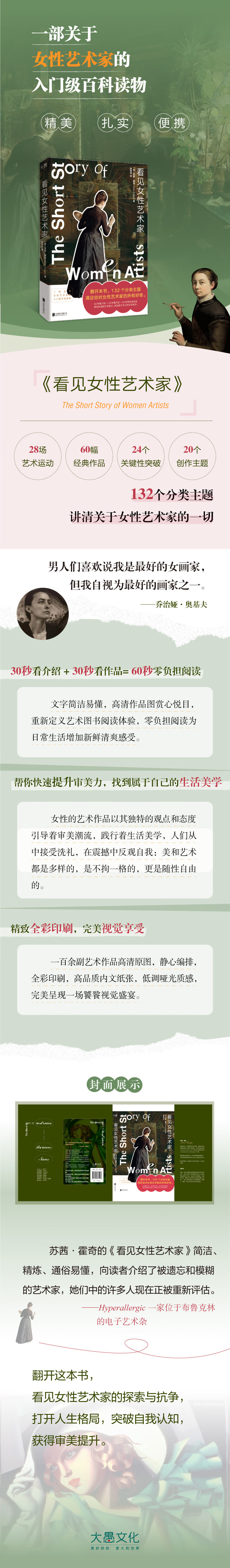 一部关于女性艺术家的入门级百科读物,书中包含: 28场艺术运动,探索女性在其中的作用与贡献; 60幅经典作品,展现女性艺术家数世纪来的尝试与摸索; 24个关键性突破,追溯艺术史上与女性相关的定义性时刻; 20个创作主题,传递女性特定的观点和态度。 共132个分类主题满足人们对女性艺术家的所有好奇。