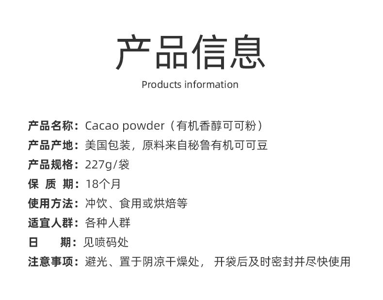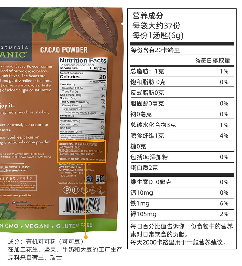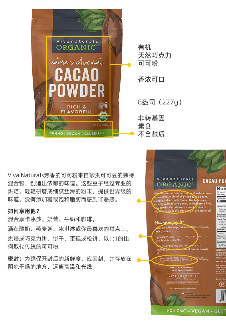 Viva进口天然有机无糖纯可可粉227g生可可cacao烘焙巧克力冲饮品