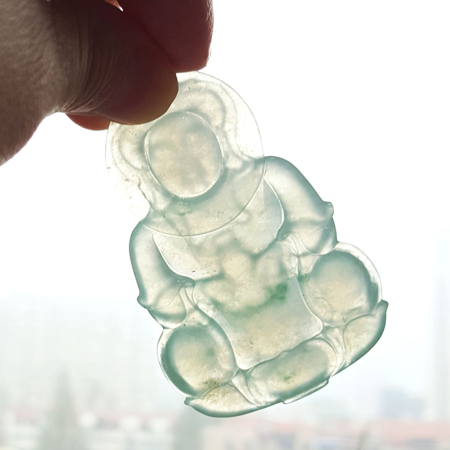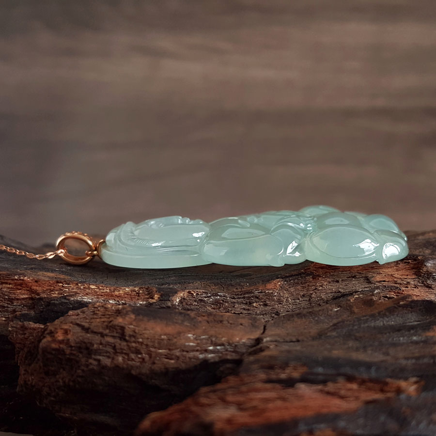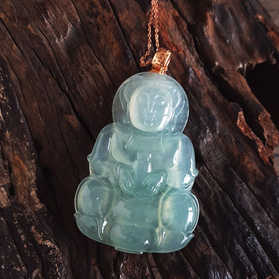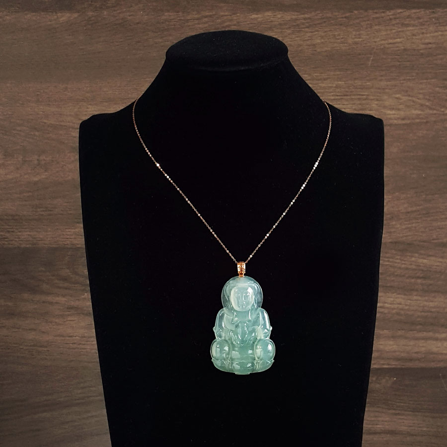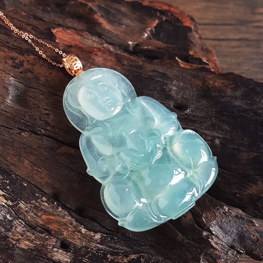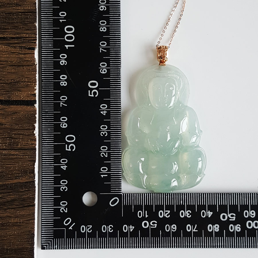 名称 | AU750收藏级玫瑰金镶天然细腻冰种飘蓝花观音坐莲(平安安乐)翡翠吊坠项链 |