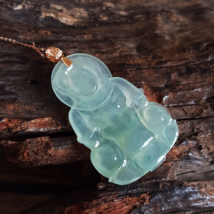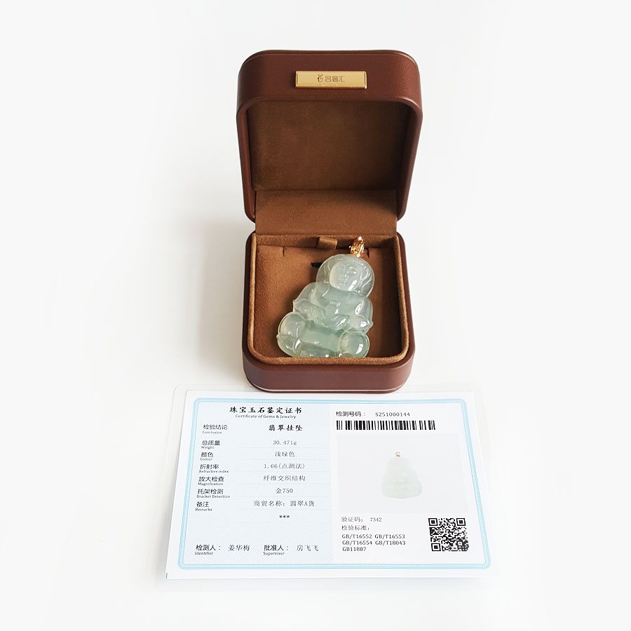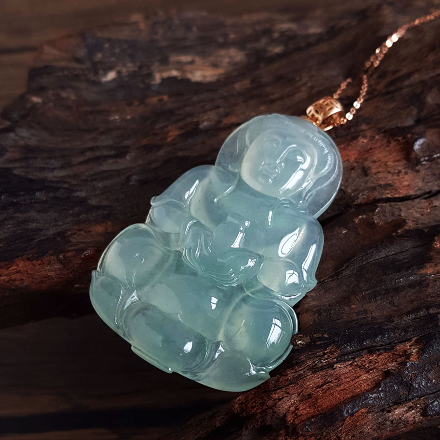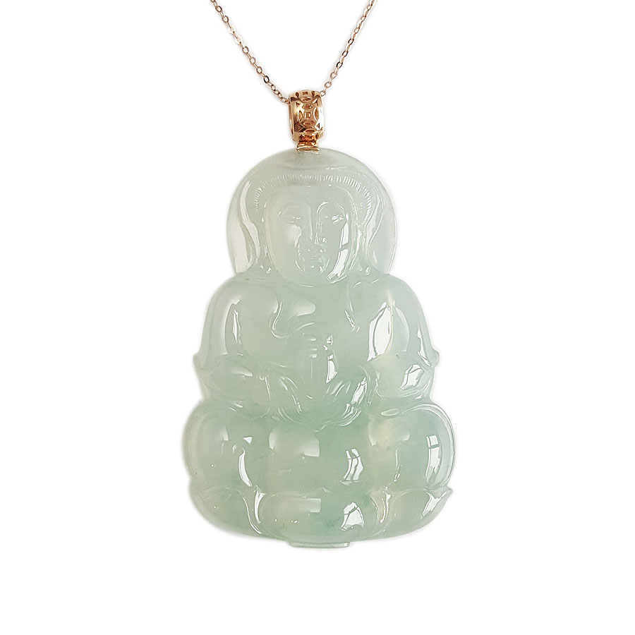 【天然正品】A货翡翠AU750收藏级玫瑰金镶天然细腻冰种飘蓝花观音坐莲(平安安乐)翡翠吊坠项链链长:45CM(长度可调节)中性161025XY12现售价:17800