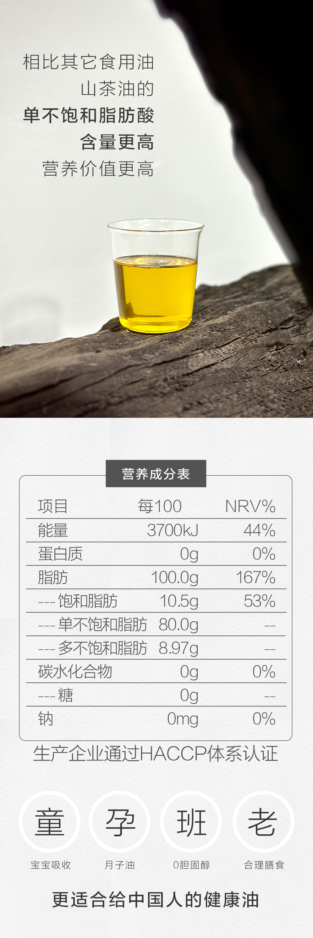 山茶油,也叫茶籽油或山茶花油,是一种优质的天然植物油,和已被广泛使用的高价橄榄油相比,山茶油是完全不输的!山茶油的单不饱和脂肪酸含量是所有食用油中Zui高的,富含Ω-3脂肪酸,并且还独有山茶甙、山茶皂甙、茶多酚,其中山茶甙强心,山茶皂甙溶血栓,茶多酚可帮助降D胆固醇、预方Zhong留,并且不含可引起人体致AI的黄曲霉素以及芥酸、皂素和棉酚等有害物质,老年人可因而得益,所以山茶油也被称为“长寿油”,当然,小朋友就更需要啦!还有维生素E、锌及亚麻酸、亚油酸含量与比例,也更适合人体需要,更重要的是,烟点高很多哦,达到220度,高温煎炒时极少产生油烟雾凝聚,对肺友好!总体来说,比橄榄油略胜一筹,也是更适合中国宝宝饮食习惯的健康油!