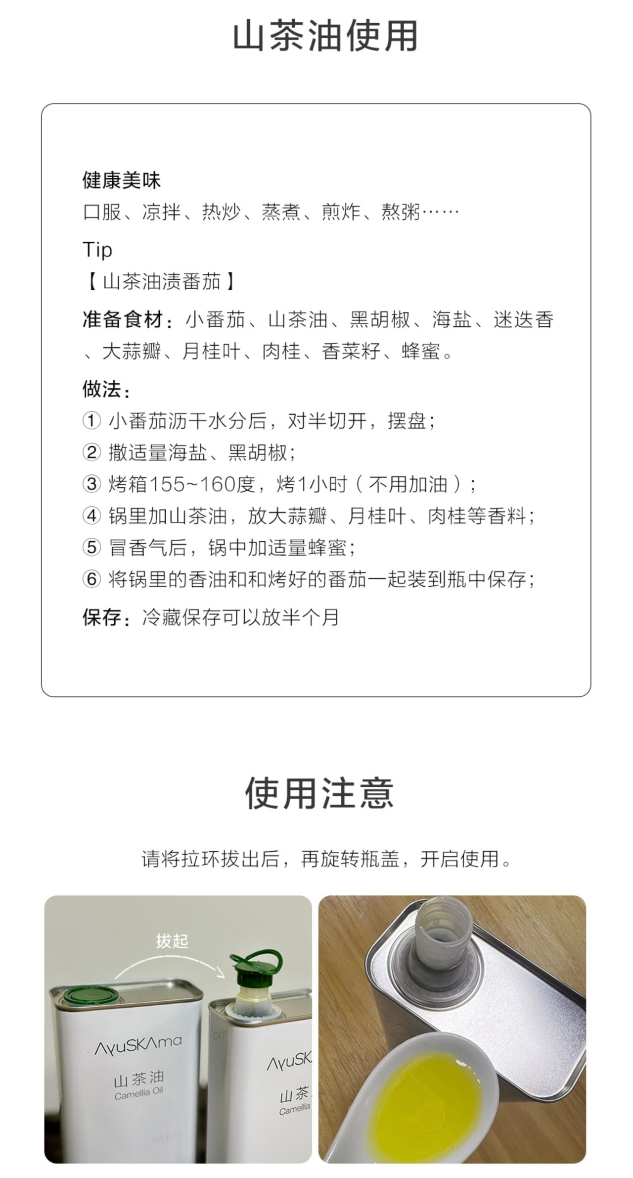 山茶油都是1L装,收到后将瓶口的拉环轻轻拔出后,再旋转瓶盖开启。倒出来的油明亮清澈,有浓郁的山茶籽香,品质是真的很好!我还把山茶油装进喷油壶里,就能更好的控制用量,毕竟1L真的很大罐,倒起来容易手抖。。。日常可以用来凉拌蔬果、熟肉海鲜,西式煎烤中式炒菜也都很合适,但不建议用来爆炒和煎炸哦,会破坏掉山茶油的营养价值,又很浪费,每次10g就够够的了!