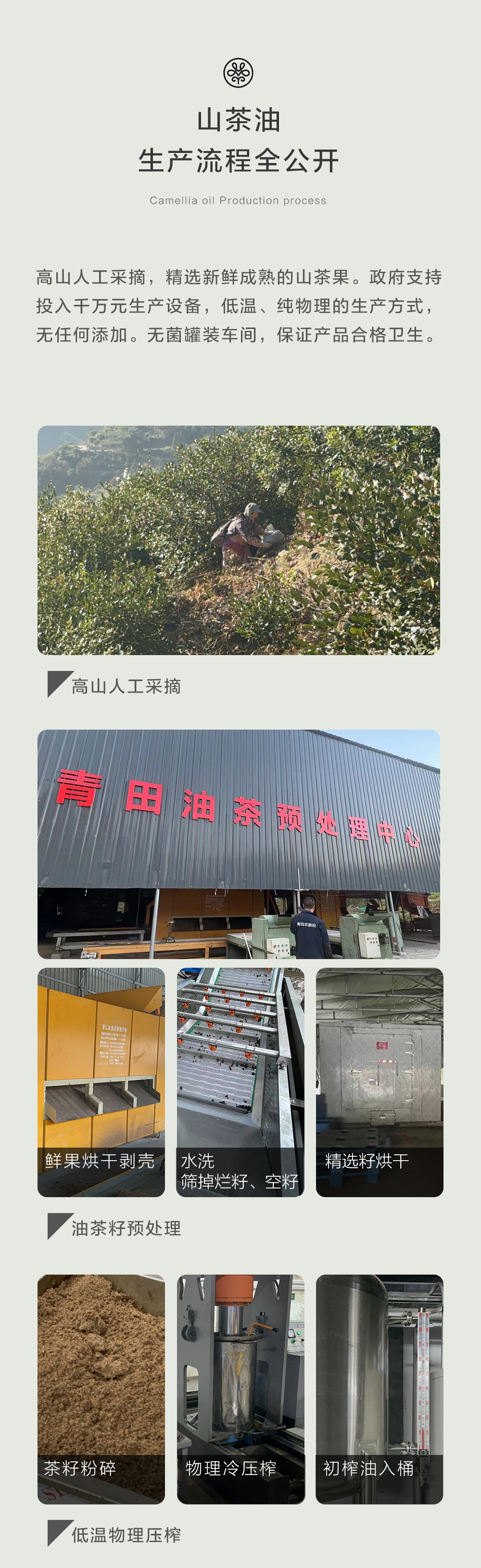 Ayu家的山茶油,原料都是高山人工采摘的新鲜成熟山茶果,生产厂商更是国有大厂,由政府支持投入千万生产设备,以低温、纯物理的方式生产,全程无任何添加剂,是纯纯的山茶油。从油茶鲜果脱壳,到茶籽水洗筛选,烘箱烘干,茶籽再次除杂,果仁去壳,到烘干内核,物理压榨,初级过滤,排扇过滤,再到30天静置去微颗粒沉淀物筛出清油,出厂检测,最后才在无菌车间罐装,经过足足13道工序,保证产品品质,生产企业更是通过HACCP体系认证,可以放心食用!
