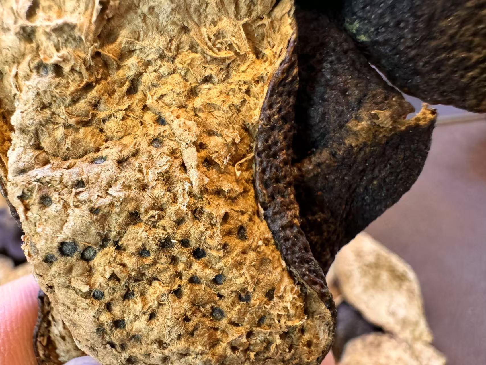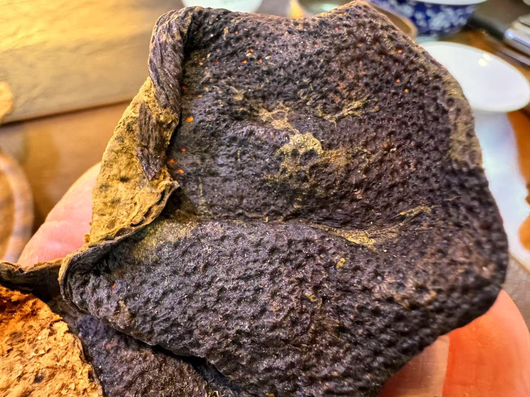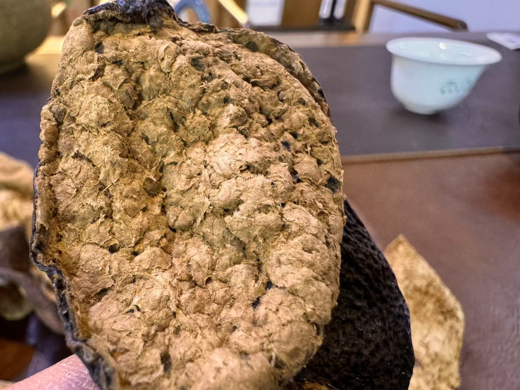 这张皮的表面有台风疤,这是新会皮都会有的表现(靠海,每年有台风)。